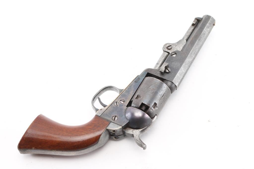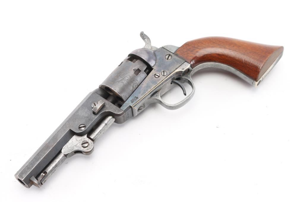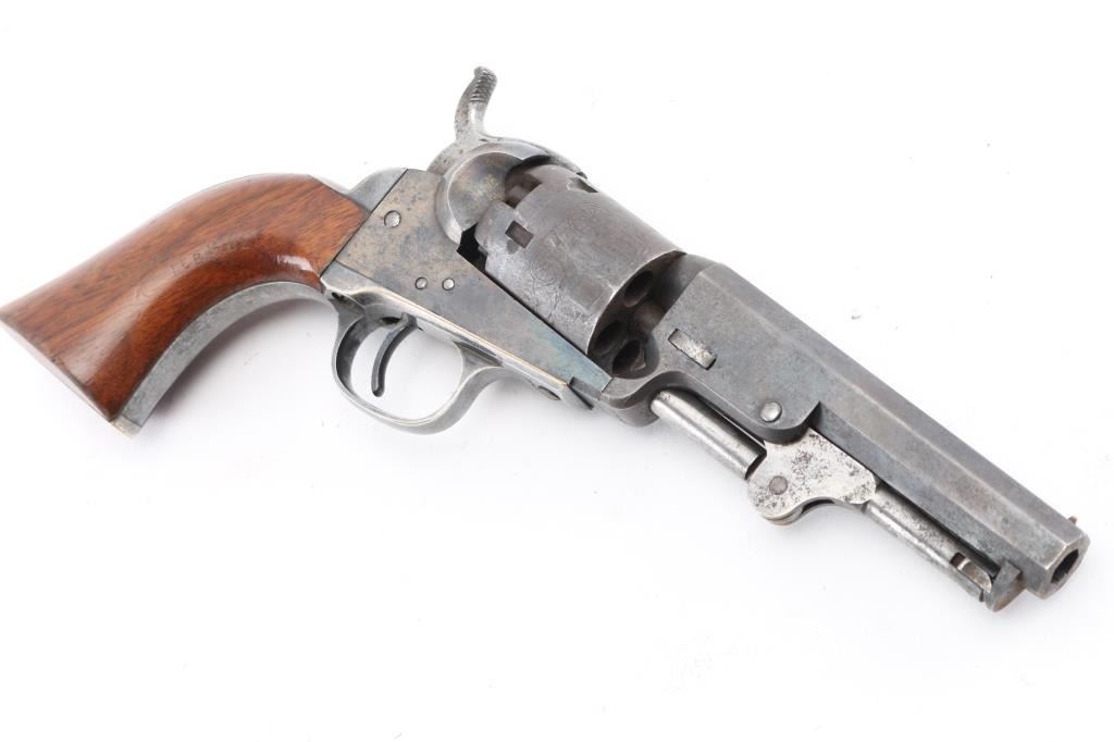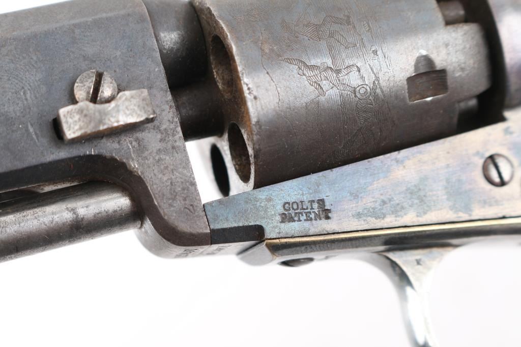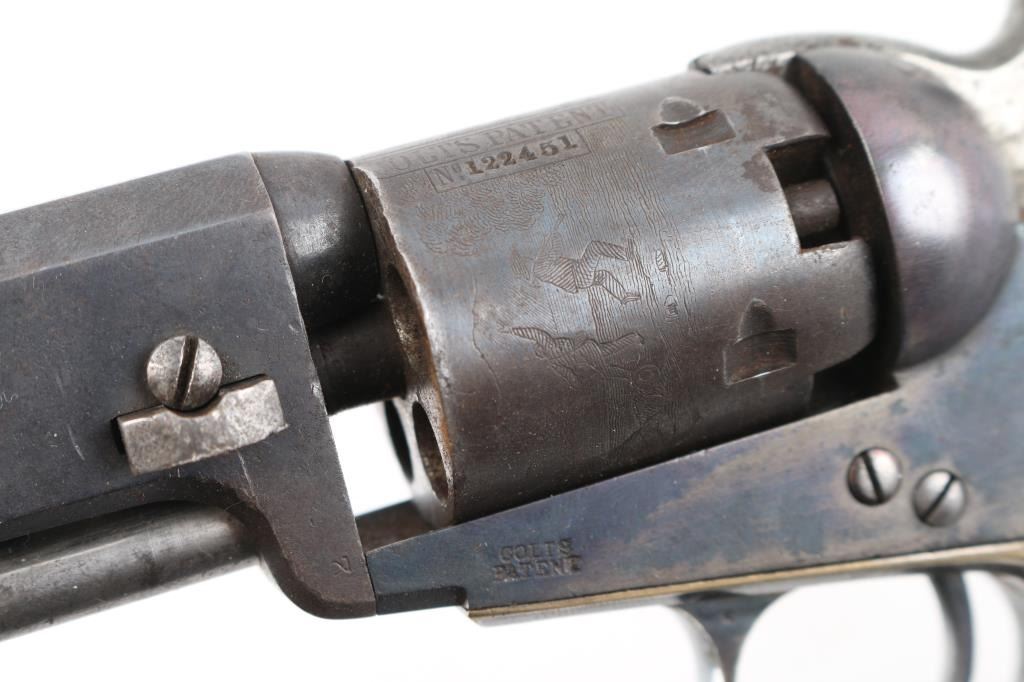 Colt 'Pocket Pistol', single action percussion cap 'n' ball revolver manufactured circa 1856. Features 4" octagon barrel, loading lever, 5 shot unfluted cylinder with roll stamped stage coach scene, brass bead front sight, rear sight notch on hammer nose, one piece walnut grip, silver toned back strap & round triggerguard. All observed numbers match, including the cylinder, wedge, and loading lever. Markings are crisp, sharp, with good cylinder scene. Bore appears very good, strong rifling. Barrel & frame have some blue with the cylinder & loading lever turned a gray patina. Grips are very good, has been varnished. Action is crisp, with tight lock-up. Comes in a Civil War period black leather flap holster, missing the plug, and has tear in flap, some separation on one seam. The inside of the flap is "Taken from Lieut. Col. Anderson of the 8th N.C. (Appears to be ) Troops. Period done, ink has turned brown with age. Worthy of further research. NRA Condition-Very Good. Antique firearm.