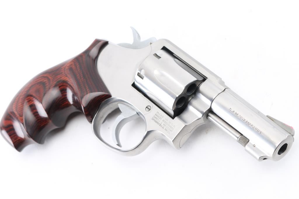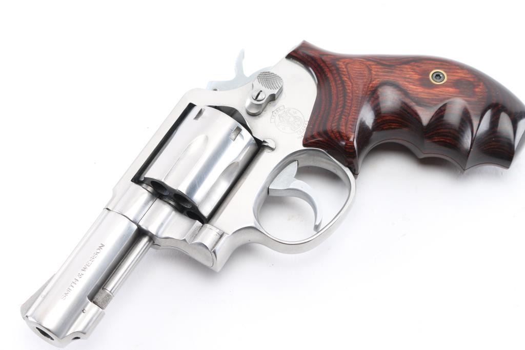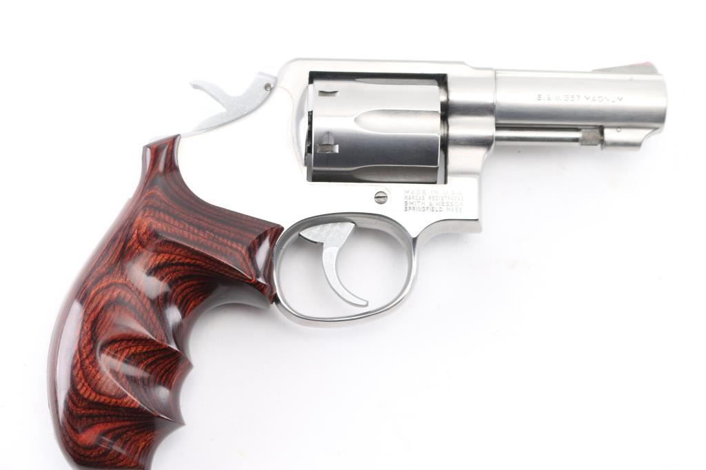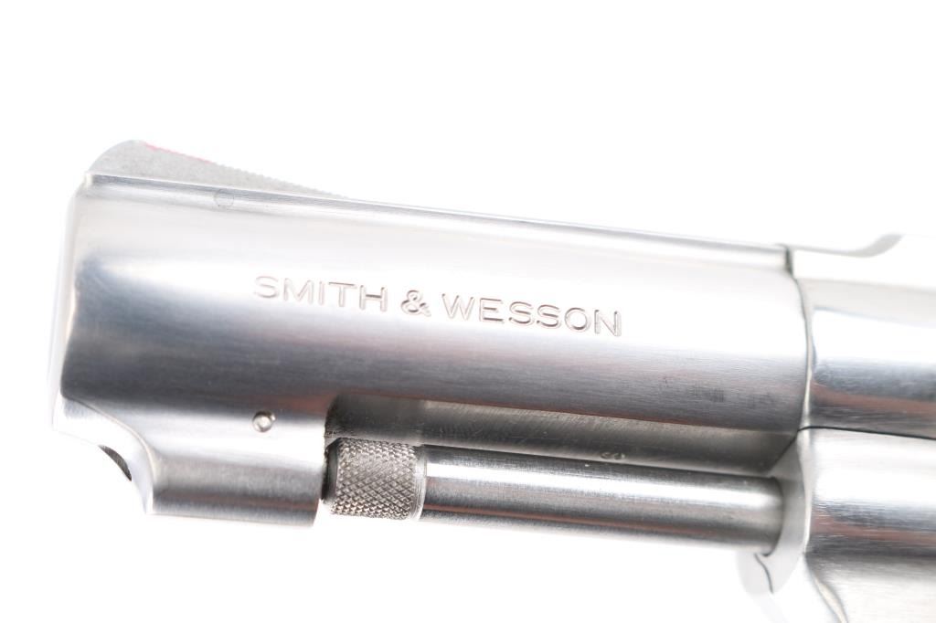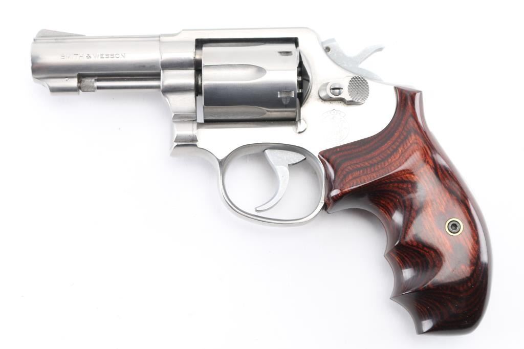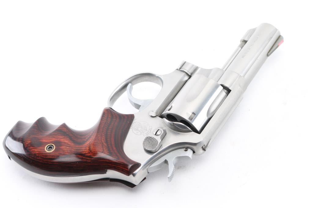 'M&P Heavy Barrel Stainless’ Stainless steel medium frame double-action revolver chambered in .357 Magnum, manufactured in Springfield, MA circa 1982-1988. Features a brushed finish, 3” heavy barrel, serrated ramp front sight, square notched rear sight, .312” smooth combat trigger, .265” service hammer with knurled spur, fluted six-shot cylinder, non-shrouded ejector rod, three screw round butt K service frame and two-piece rosewood wrap-around finger groove grips. Revolver exhibits a small amount of wear showing minor scratches and thin drag line on the cylinder. Action is smooth with very good lock-up, bore is pristine and the grips are fine. Condition-Very Good+. Modern Firearm.