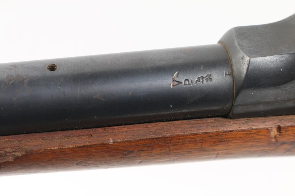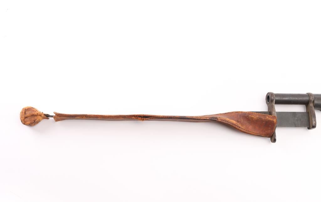 Very rare cut-down, and stripped Springfield 45-70 trapdoor rifle. Hammer, sights, breech block latch, sling swivels removed, model data scrubbed, partial serial number visible. Missing top tang screw. These surplus rifles were mounted with the M1912 training/fencing bayonet prior to WW1, and used throughout the war. Referred to as both a 1906, or 1912 model bayonet, intended for use on a fencing musket for bayonet fighting instruction. This example is marked R.I.A. and dated 1913, with the inspector's initials of H.E.K. Measures 19 inches overall, with a 16 inch leather covered, flexible blade and padded end. The leather is scuffed, and lower seam is separated. Hard to find in any condition. Missing the top screw. Antique Firearm.