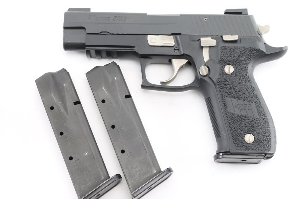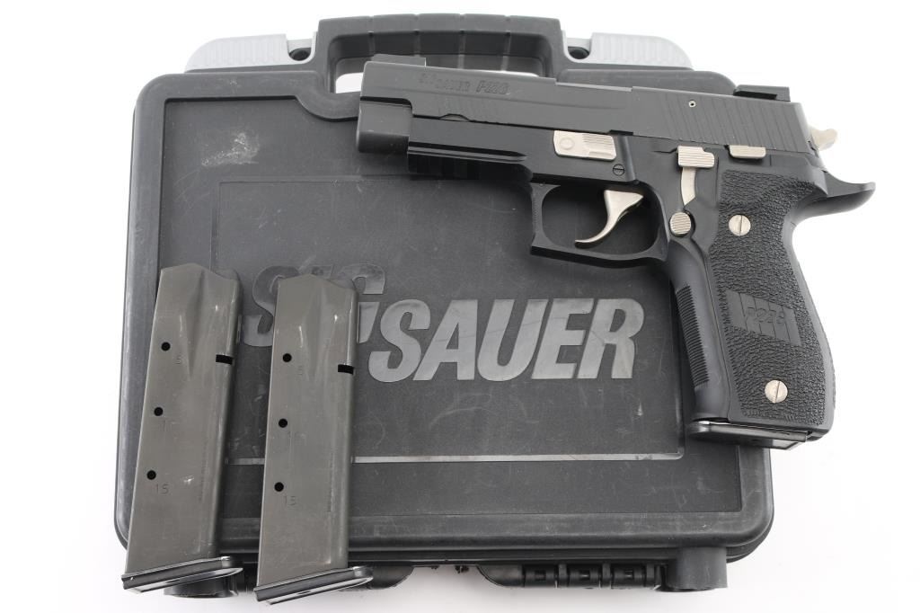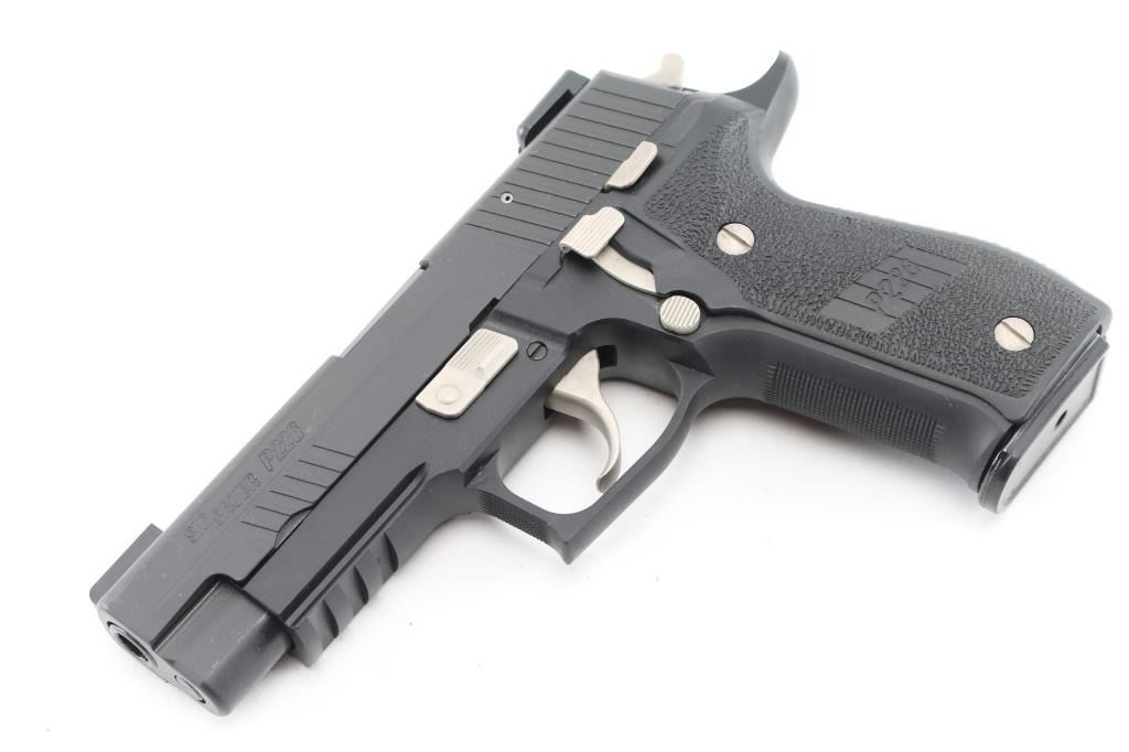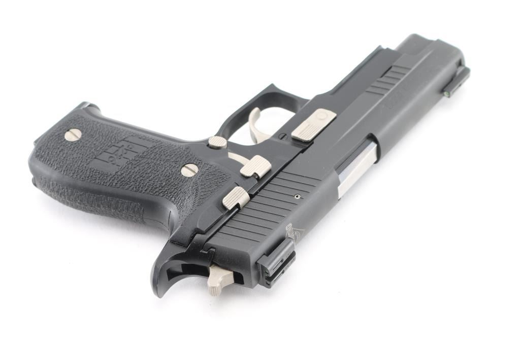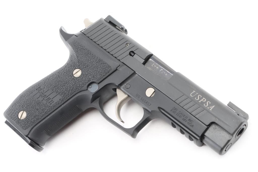 SIG Sauer P226 USPSA (U.S. practical shooting Assn). semi-automatic handgun for competitive shooting. 4.4" barrel, 15 round capacity, SRT trigger, Single/double-action, 10 lbs. trigger pull double-action, 4.4 lbs. trigger pull single-action, black stainless steel frame, black polymer grips, black nitron-finished stainless steel slide. Dawson fiber optic front sight, Warren Tactical rear sight, knurled front strap, front cocking serrations. USPSA marked on the top, and left side of slide. beavertail frame, integral rail, nickel controls. Bore is pristine, overall excellent. Comes in its factory hard case with two spare magazines (three total). NRA Condition-Excellent. Modern firearm.