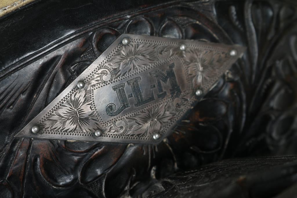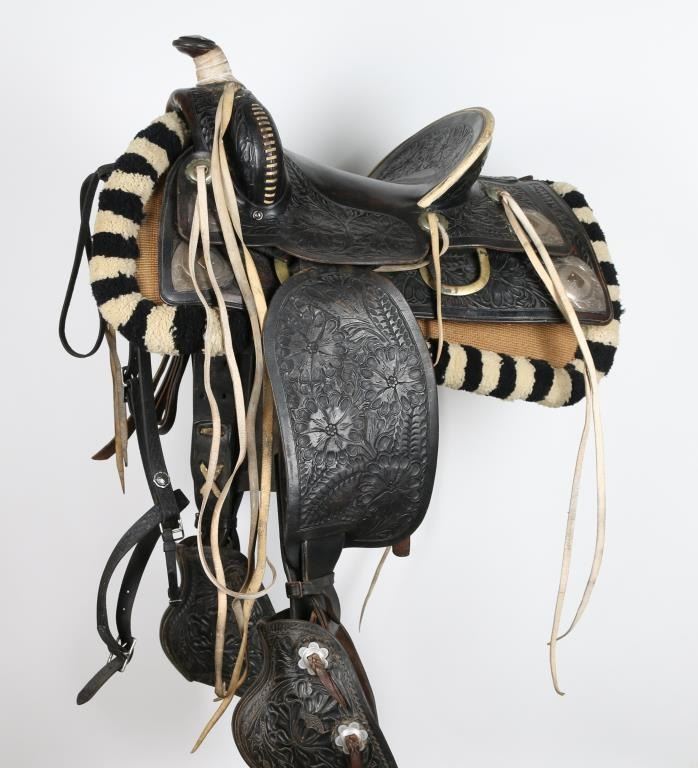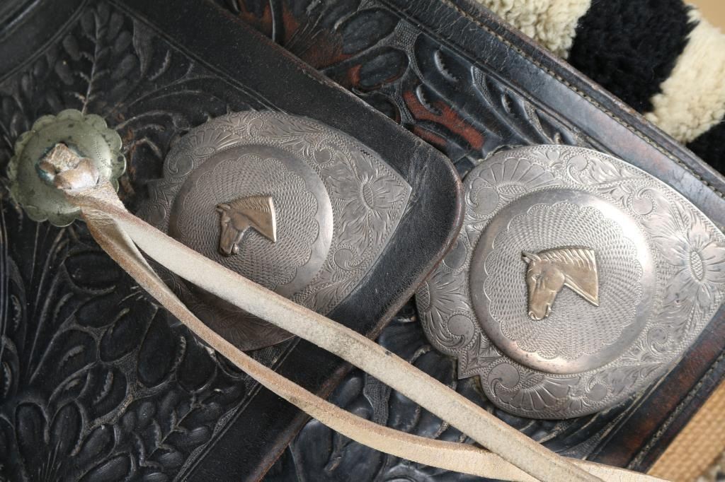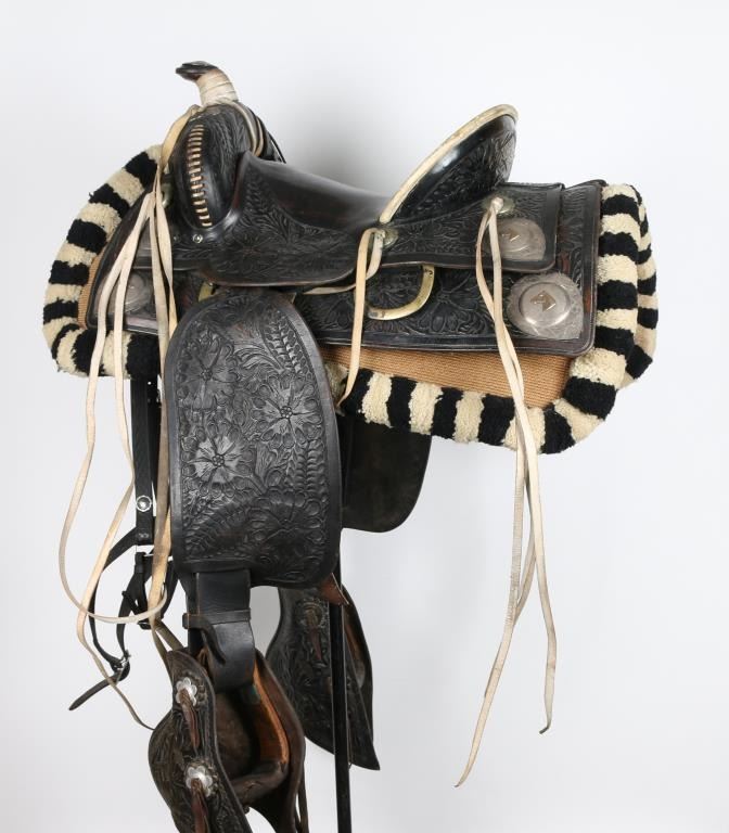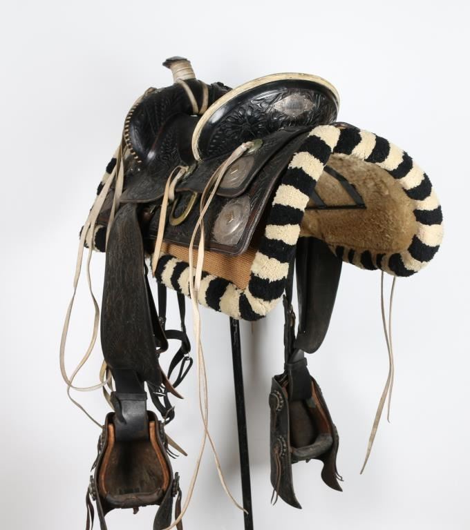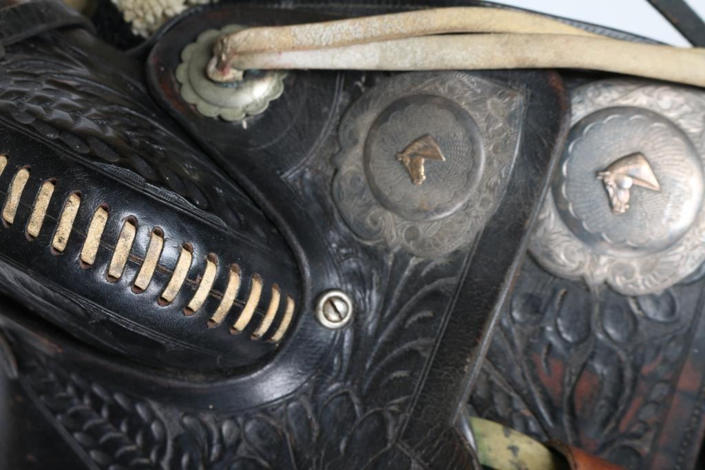Two toned black and white tooled western saddle with sterling silver conchos with horse-head design. Includes wool black and white posse pad, along with a black headstall.