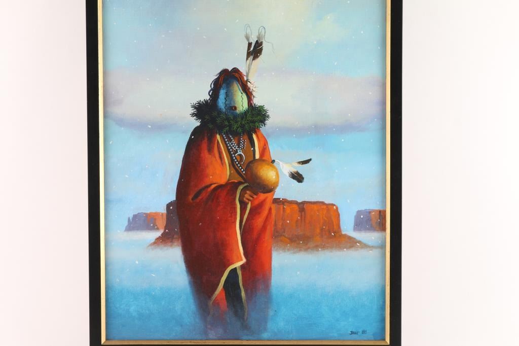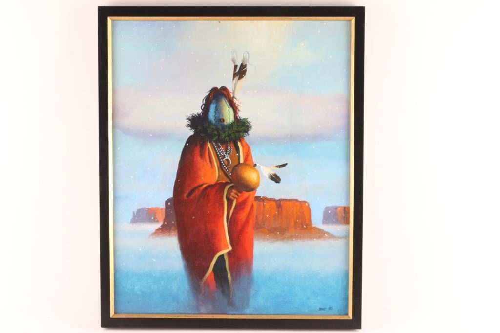 by Al Bahe (Born 1959) was active/lived in Arizona. Al Bahe is known for Navajo Yei Figures. This picture depicts Mudhead Kachina, titled "Winter Blanket" hand-signed lower right, Measures 15.5" x 19.".