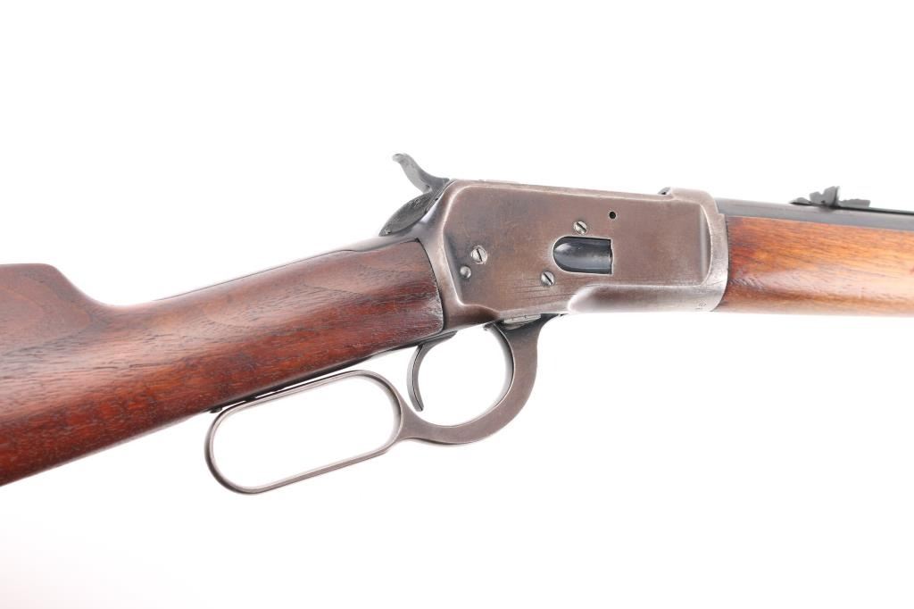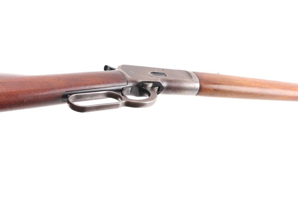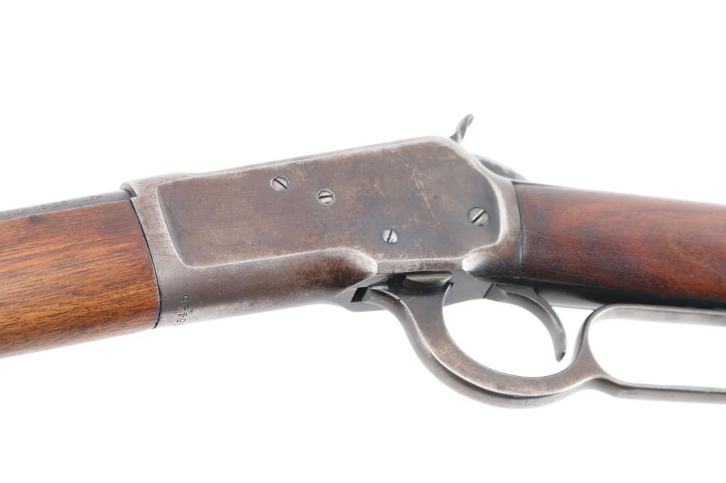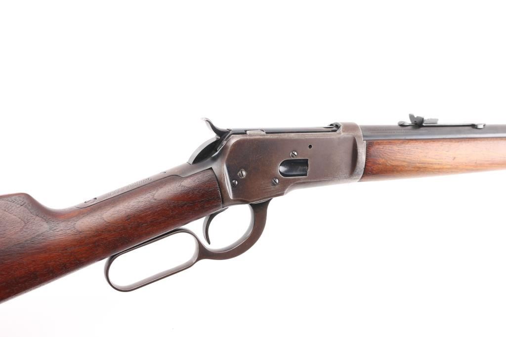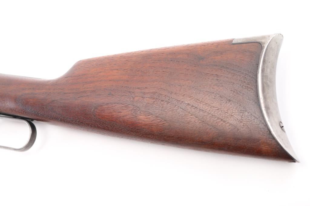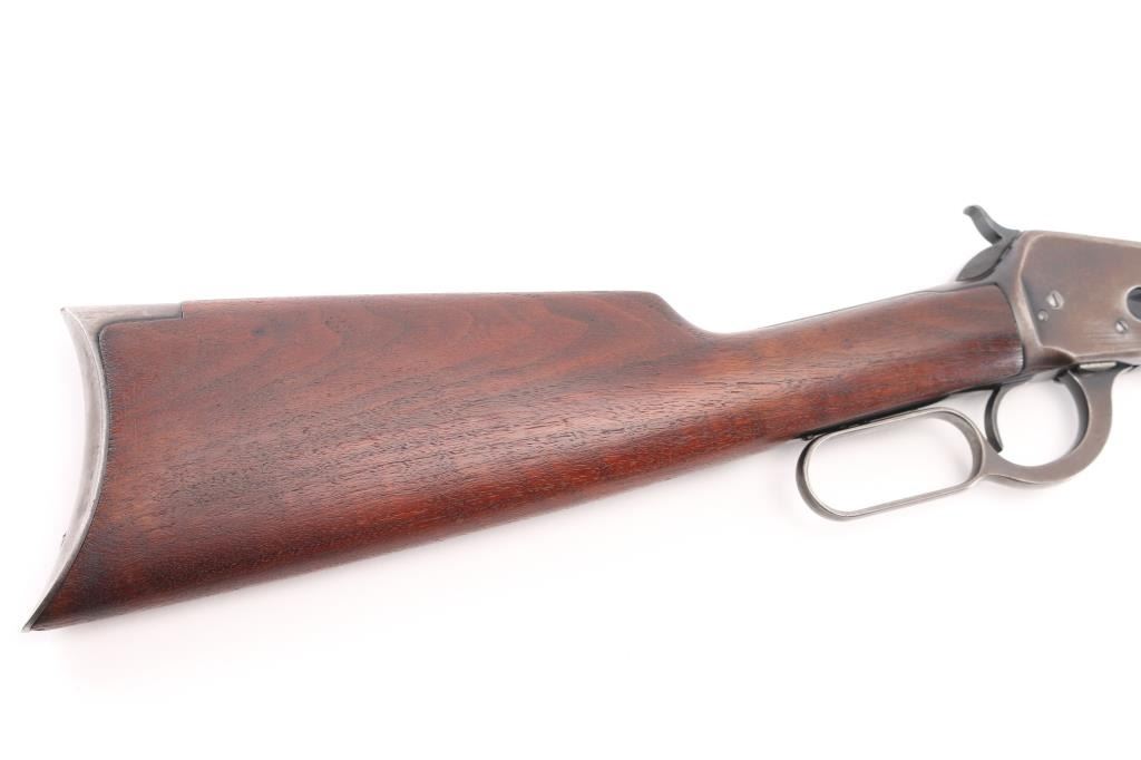 Vintage lever action repeating rifle chambered in .25-20 Winchester, manufactured circa 1927. Features a blued finish, 24 1/4" round barrel, full length tube magazine, dovetailed blade front sight with brass bead and set screw, adjustable rear sporting sight, smooth trigger, knurled hammer spur, smooth walnut forend with metal cap and a straight grip shoulder stock with crescent metal buttplate. Bore is very good bright condition. Retains 40% original dark bluing, mostly on barrel and mage tube, some retained on receiver. Remainder of metal shows faded brown color, some thinning where handles, bare metal on high spots. Wood is good to very good, some dents, lightly sanded with some erosion at tang, tiny chips from toe, varnish added. Action is smooth. Markings are sharp. Condition is NRA Very Good *** C&R Firearm ***