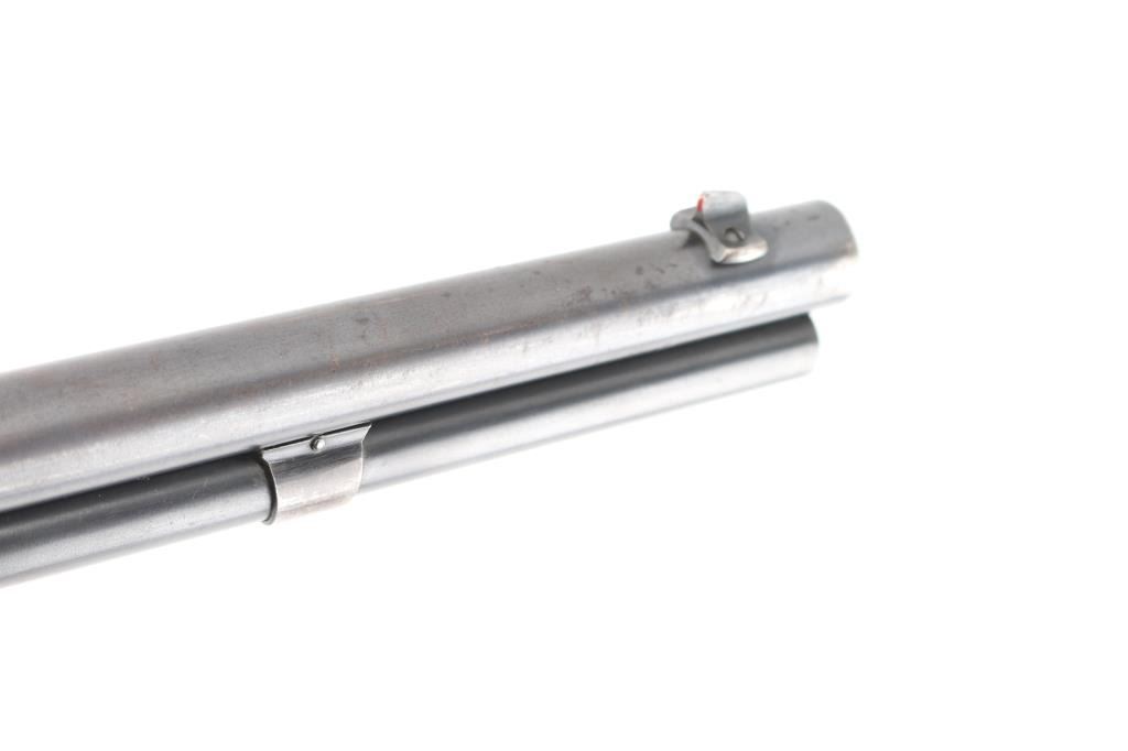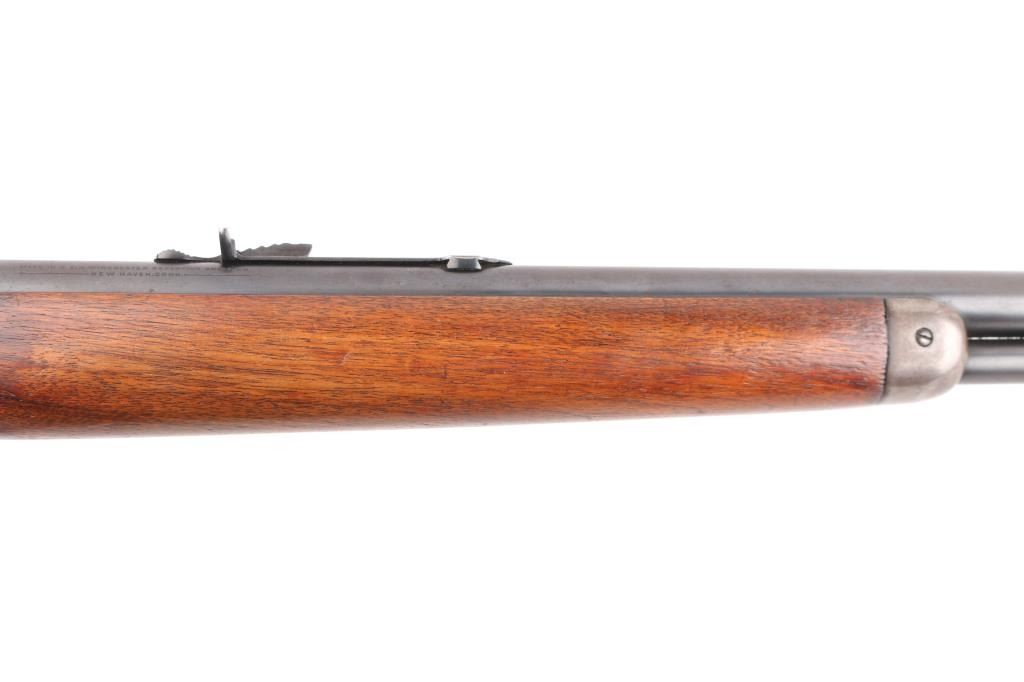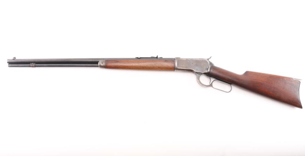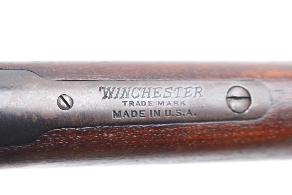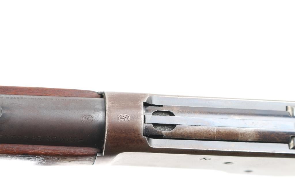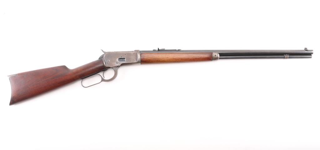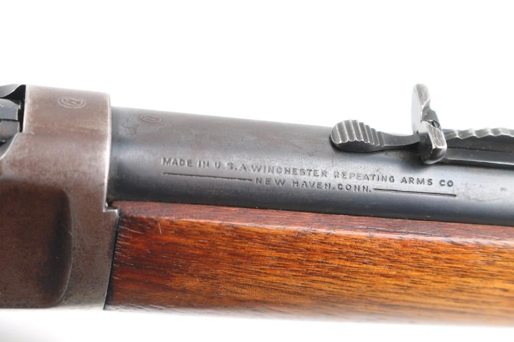 Vintage lever action repeating rifle chambered in .25-20 Winchester, manufactured circa 1927. Features a blued finish, 24 1/4" round barrel, full length tube magazine, dovetailed blade front sight with brass bead and set screw, adjustable rear sporting sight, smooth trigger, knurled hammer spur, smooth walnut forend with metal cap and a straight grip shoulder stock with crescent metal buttplate. Bore is very good bright condition. Retains 40% original dark bluing, mostly on barrel and mage tube, some retained on receiver. Remainder of metal shows faded brown color, some thinning where handles, bare metal on high spots. Wood is good to very good, some dents, lightly sanded with some erosion at tang, tiny chips from toe, varnish added. Action is smooth. Markings are sharp. Condition is NRA Very Good *** C&R Firearm ***