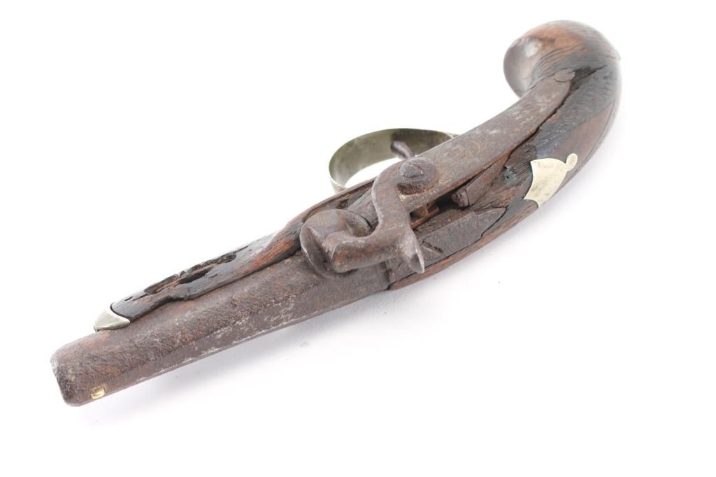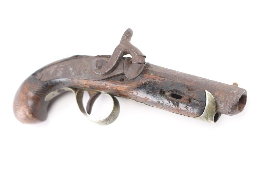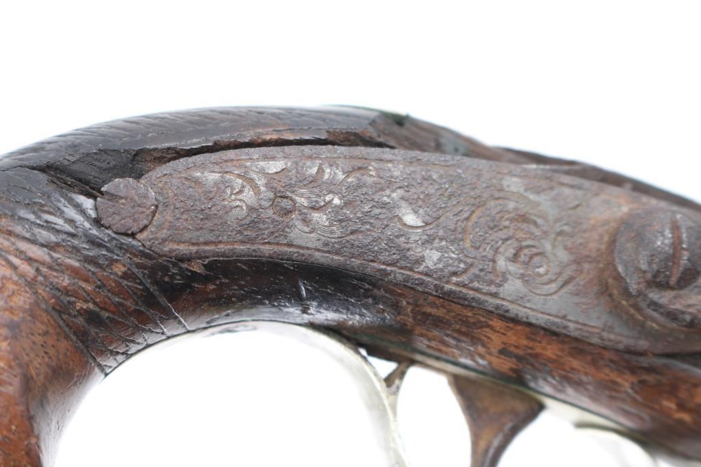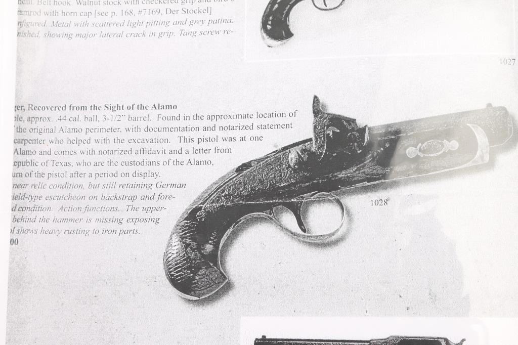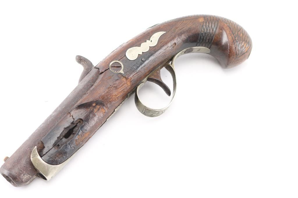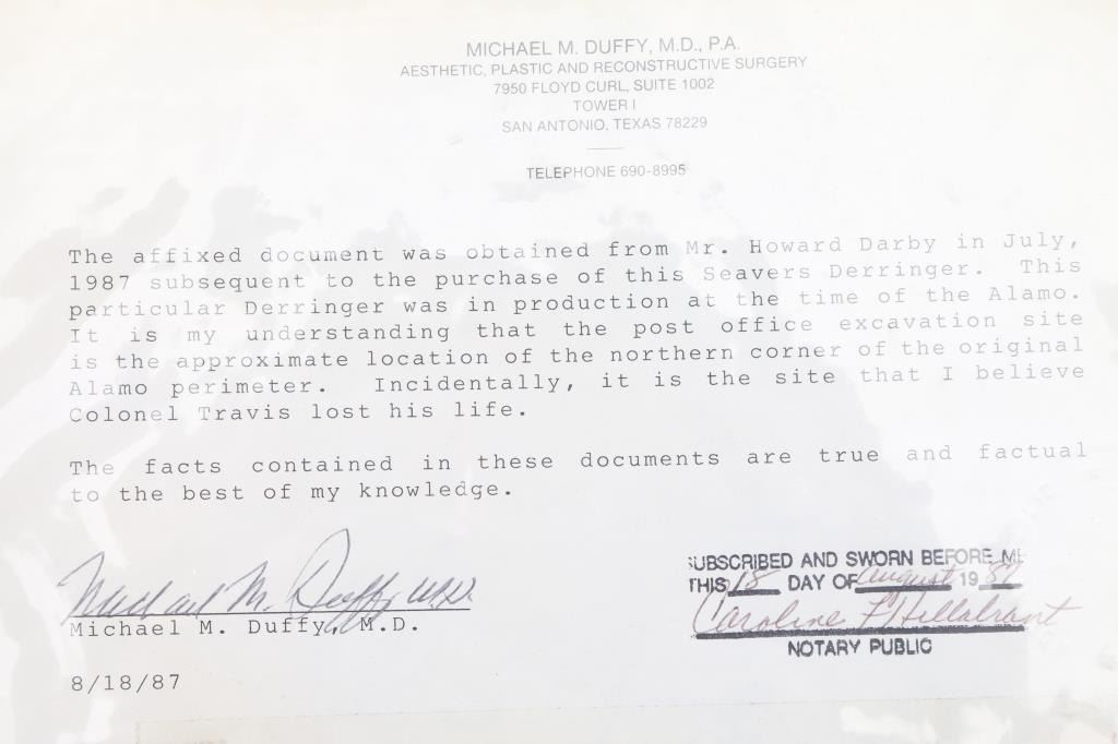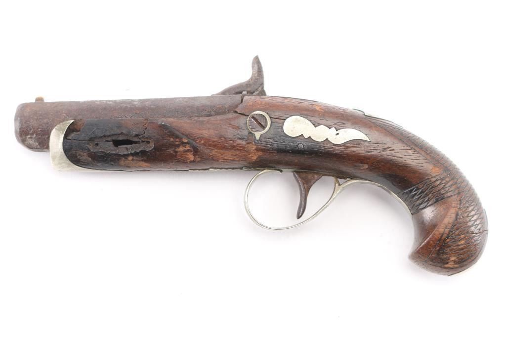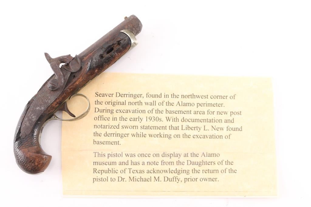 NVSN. This Philadelphia style derringer was made in about 1850's by Ebenezer Seaver. Seaver was a gunsmith and blacksmith born December 27, 1782 in Swanzey, Cheshire, New Hampshire. Records show that he and his family were “warned out” of Newbury, Vermont on October 17, 1809, before finally settling in Vergennes, Vermont. He died October 7, 1862. Found at the northwest corner of the original north wall of the Alamo during excavation of the basement area for the new post office in the early 1930's. It was once on display at the Alamo museum with letter from the Daughters of the Republic of Texas acknowledging the return of the pistol to Dr. Michael Duffy, prior owner. Comes with great great documentation, notarized affidavit, diagrams of the location. Relic condition, still retaining it's German silver fittings, action works, 2" chip out of the wood by the left upper tang, pitted. 3 1/2" barrel, top flat of barrel marked "Seaver". Although the gun was not present at the battle in 1836, it is still a very interesting derringer. NRA Condition-Fair as Antique Firearm.