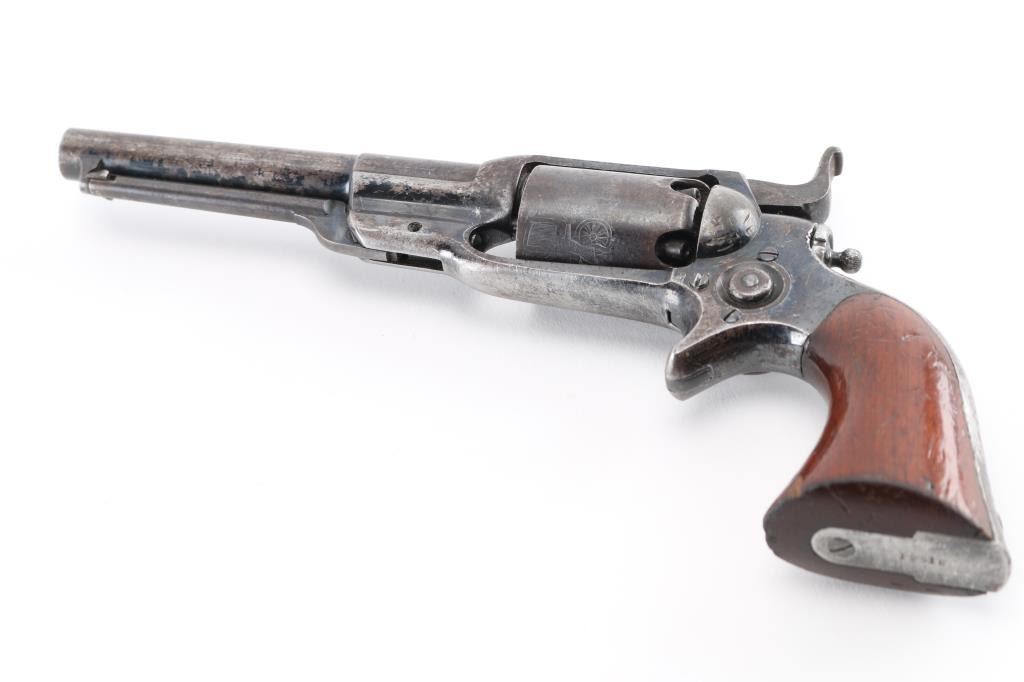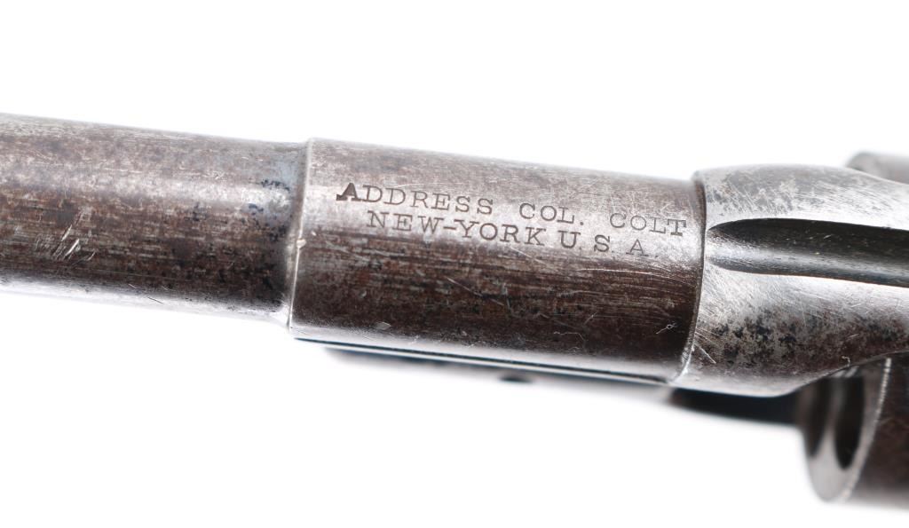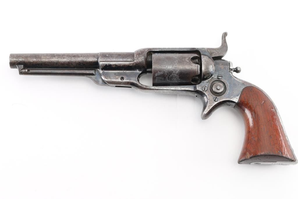 'Model 7 Root' Most desirable model in the series. Antique American made single action spur trigger percussion revolver, manufactured circa 1868. Features a blued finish, 4.5" barrel with two line patent markings & NY address, loading lever, front sight missing, 'v' notched rear sight, non-fluted five shot cylinder, smooth spur trigger, side mounted hammer with knurled spur, and one-piece vanished wraparound walnut grip. Bore is fair to good condition, some frosting & pitting, strong rifling. Retains 20% finish, dark colors in protected areas, mostly showing faded colors and bare metal, with scratches and other handling marks. Many small dents around backstrap, sides on frame. Screw slots show damage. Grips are good condition with small chips and dents. Stage coach scene on cylinder is very good, cylinder numbers "12512". Action not working, cylinder does not rotate when hammer is being cocked. Condition is NRA Fair (mechanical issue) *** Antique Firearm ***