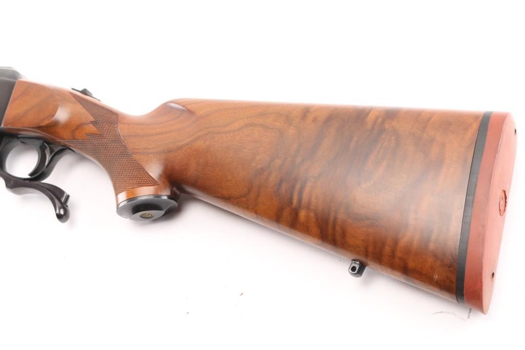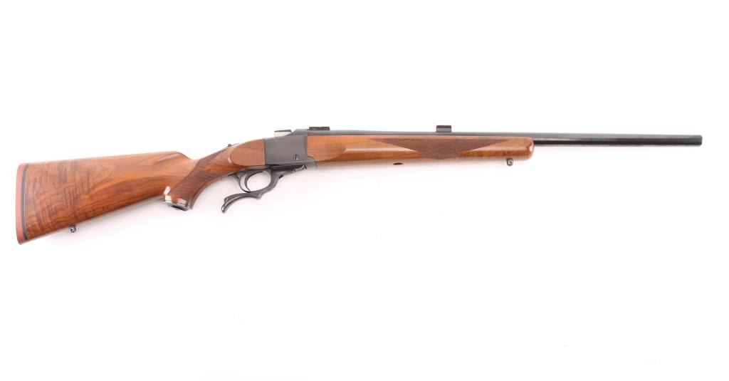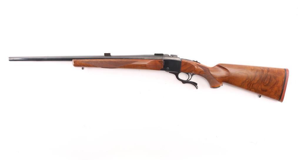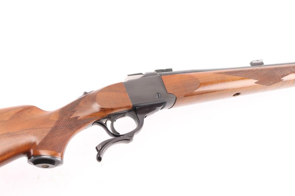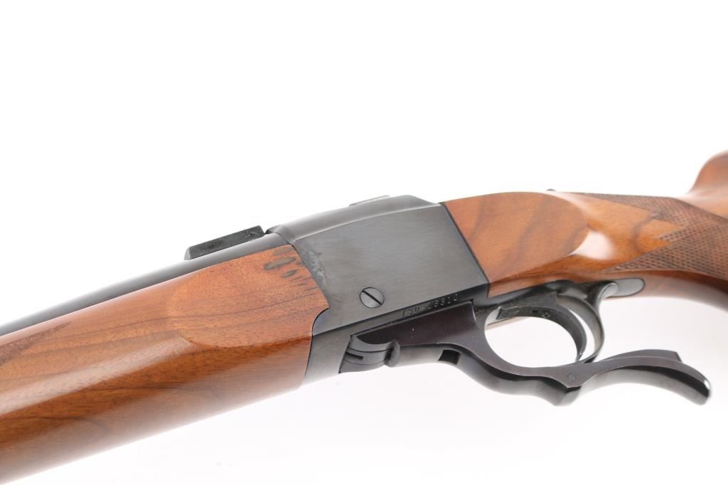 Single shot falling block rifle manufactured circa 1975. Features blued finish, walnut butt stock & forend, 24" barrel with dovetail blocks for scope mounting, no provision for sights, sling studs, checkering on sides of forend & wrist, sliding tang safety, red rubber butt pad. Bore is very good condition. Retains 90% finish, shows many tiny pits along forward edge of receiver and along wood line at breech end of barrel, also normal handling marks. Wood is very good condition with some small dents & scratches, several stains or repairs on left side of forend. Shows very nice fancy figure and some fiddle grain and quilting on butt stock and bottom of forend. Condition is NRA Good++ *** Modern Firearm ***