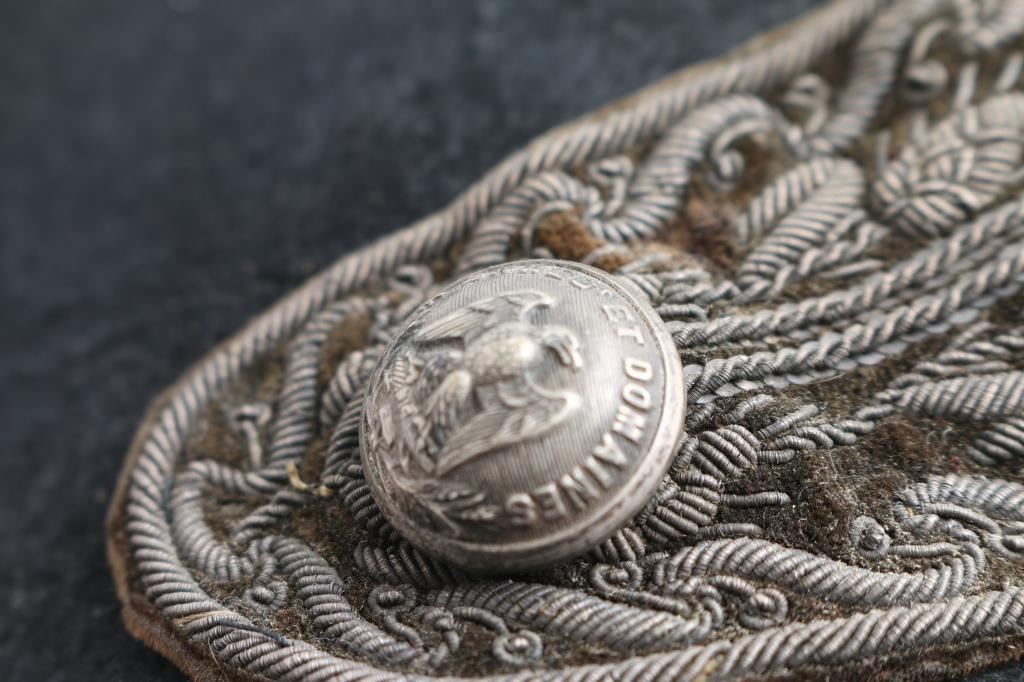 Early 19th Century, believe 1st Empire, possibly 2nd, French Officer black beaver pelt Bicorne cocked hat manufactured by Delbarre of Paris, bullion embroidered ribbon, and tricolor French National cockade. The brass button has the Imperial Eagle, and the inscription "ENRECt ET DOMAINES". Inside on the ivory silk interior is embossed with maker information,black leather sweatband. Silk lining is poor, coming apart, with tears, losses. You can still read most of the makers information. Adopted 1790.