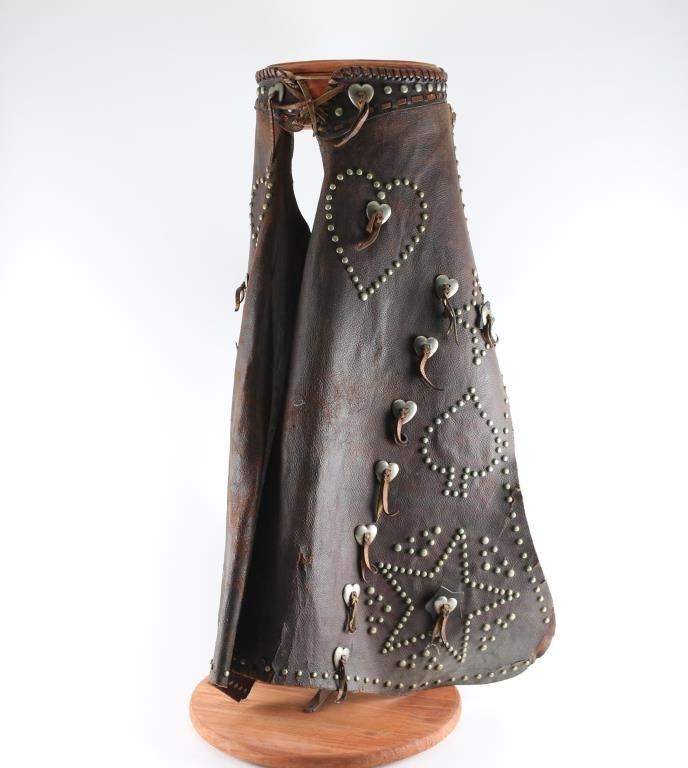 Brown leather, with star, heart and spade spotted motif. With nickeled heart conchos. Not maker marked. In fair to good condition for age.