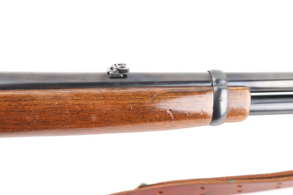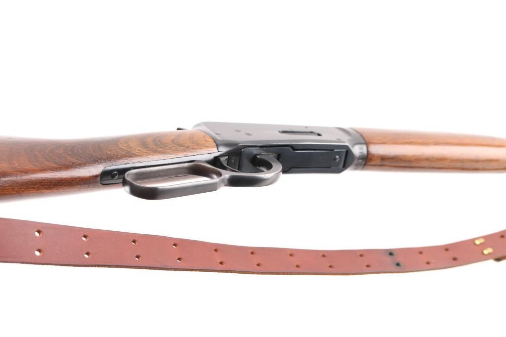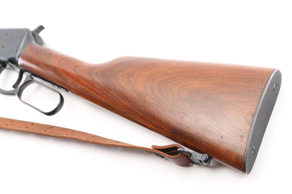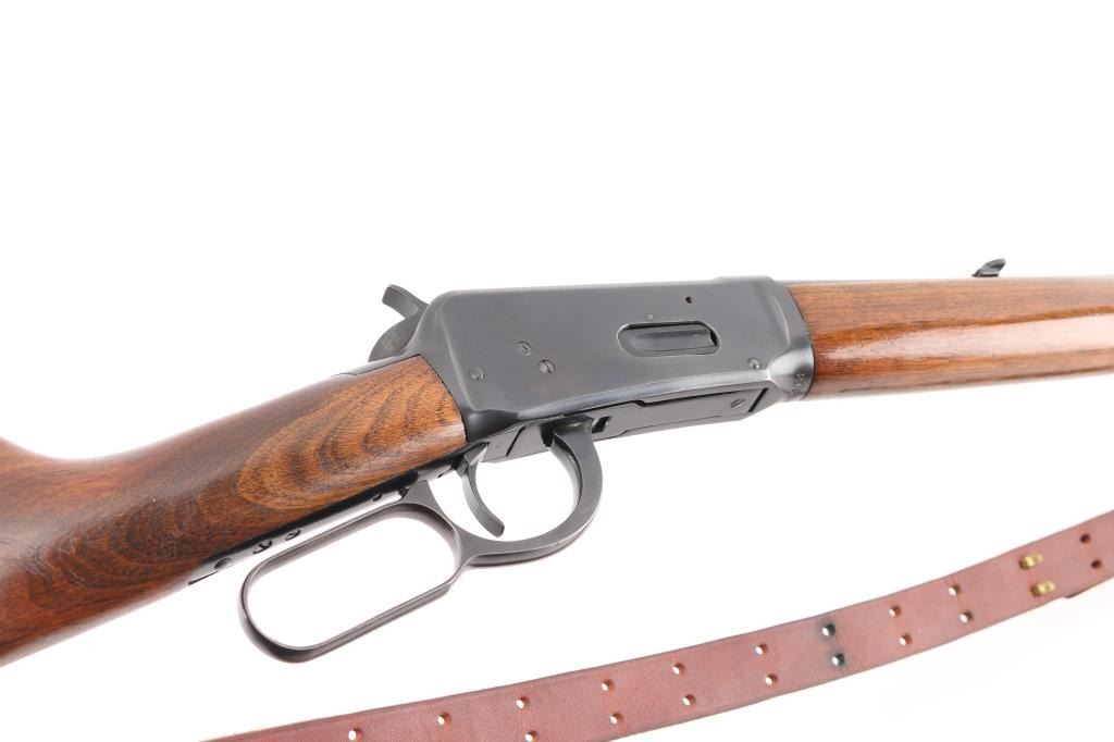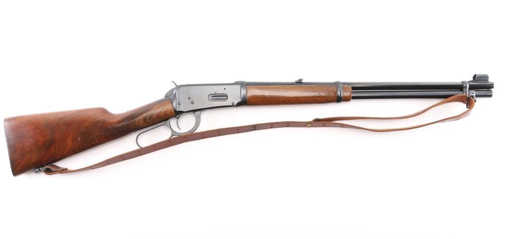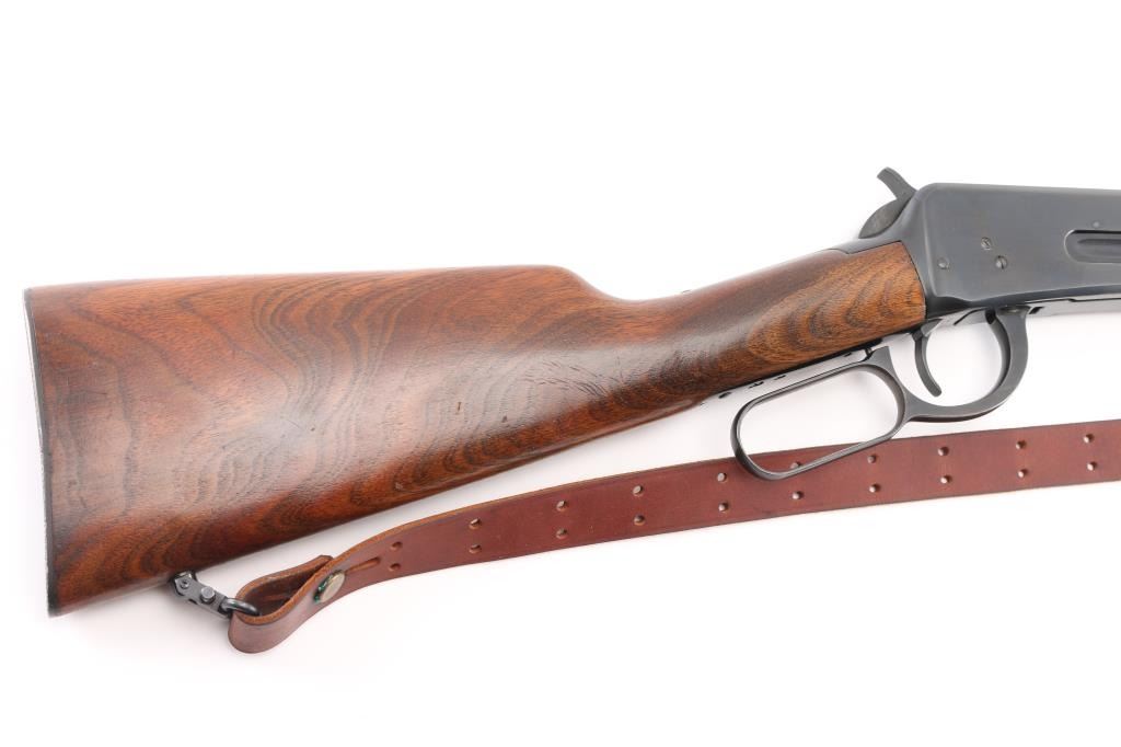 SN: 2181803 'Eastern Carbine' Lever action rifle manufactured circa 1953. Features blued finish, smooth wood stock and forend, serrated steel buttplate, hooded blade front sight with beaded top, folding adjustable rear sight, 20" barrel with full length magazine tube underneath, smooth walnut forend, smooth walnut shoulder stock with straight wrist. Sling studs added at butt, and to mag tube (clamp). Bore is very good condition. Retains 95% finish with scratches, edge losses, handling marks, some thinning on lever. Wood is very good condition with dents & scratches, varnish added, fancy figure in butt. Markings are sharp. Action is smooth. Includes good condition brown leather sling. Condition is NRA Very Good *** C&R Firearm ***