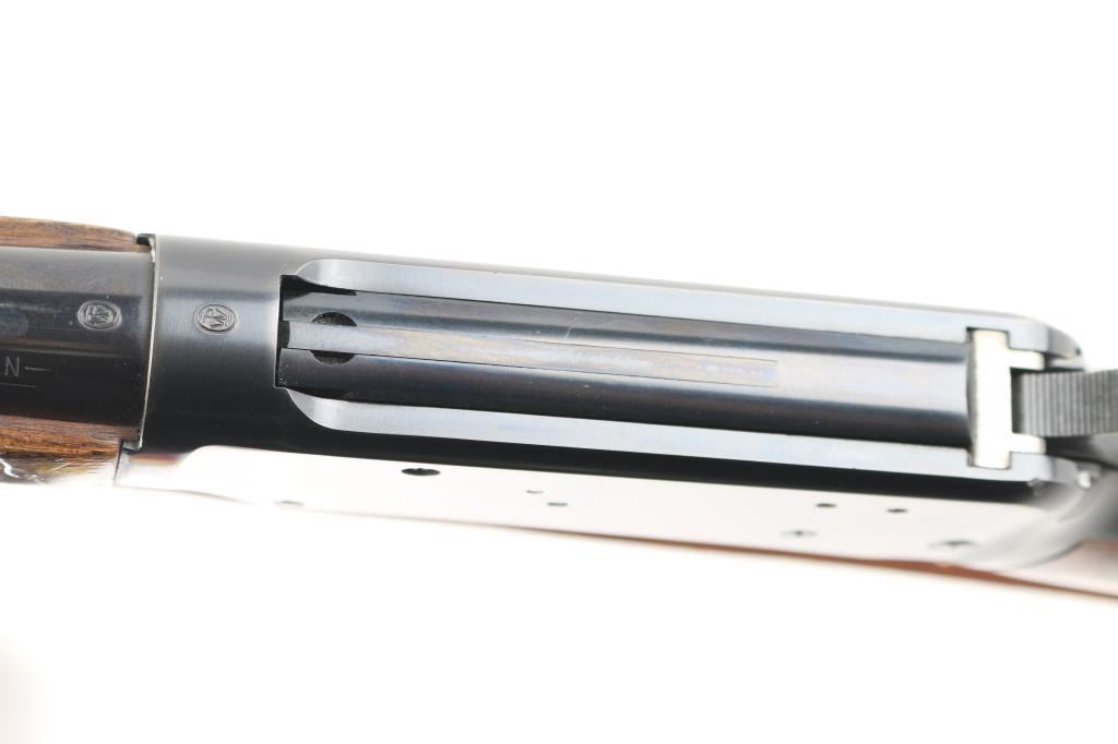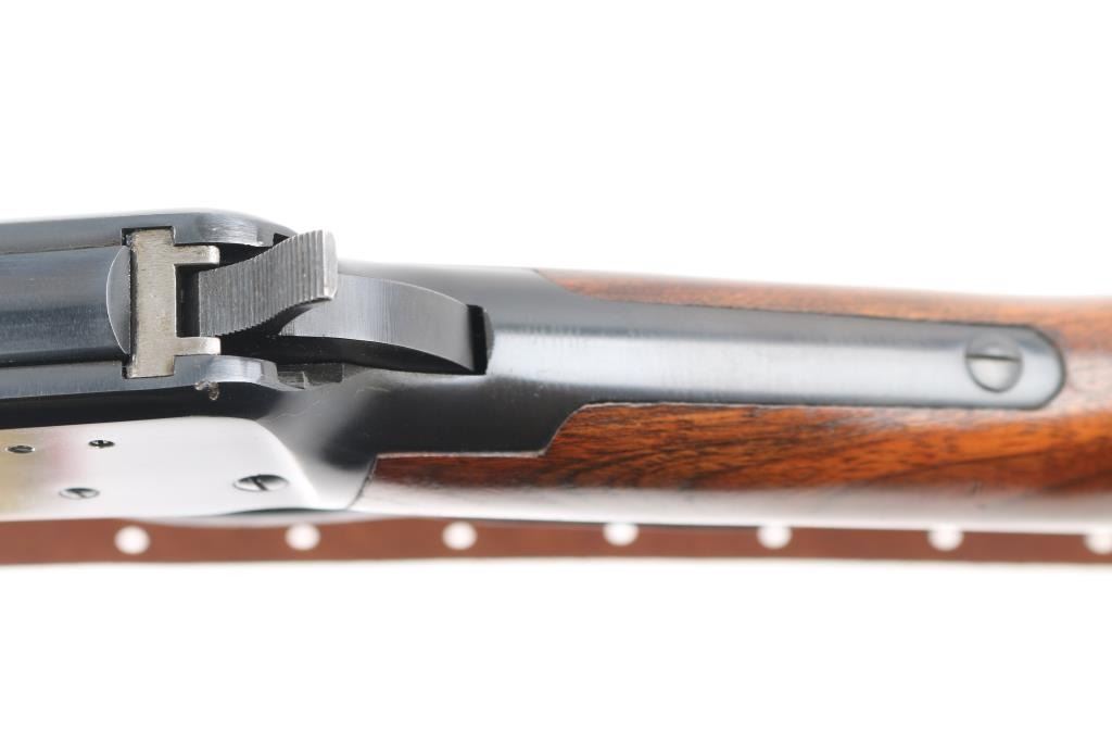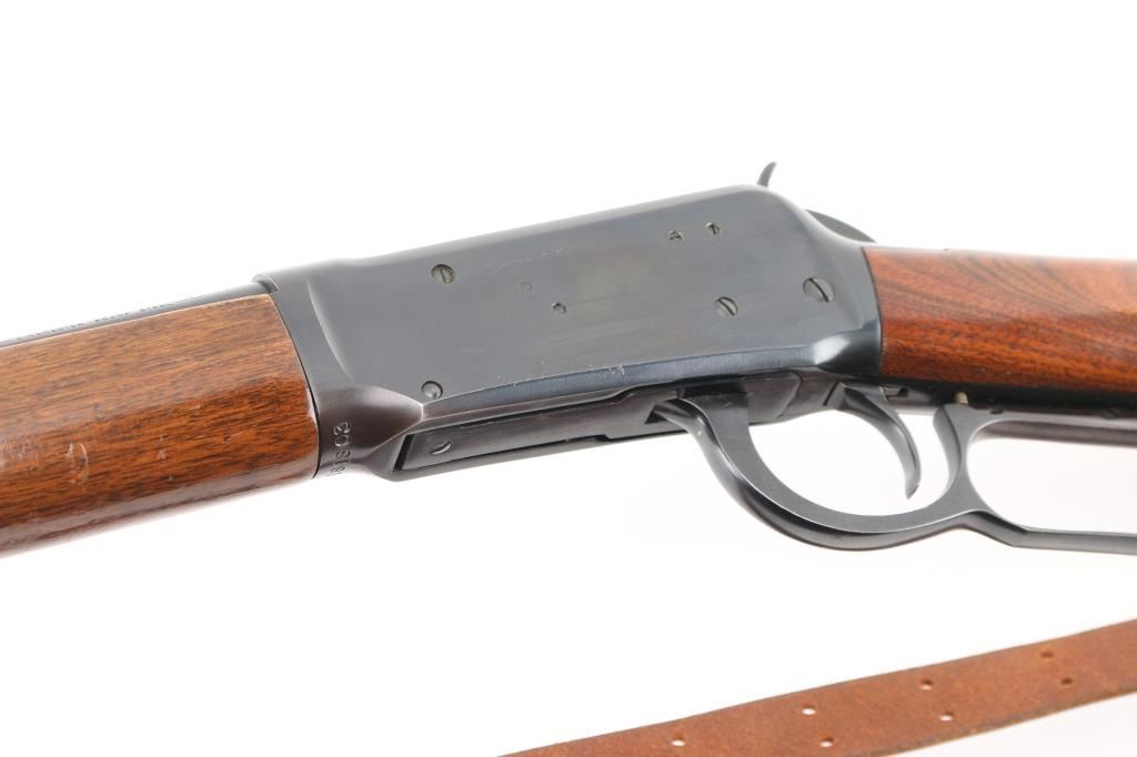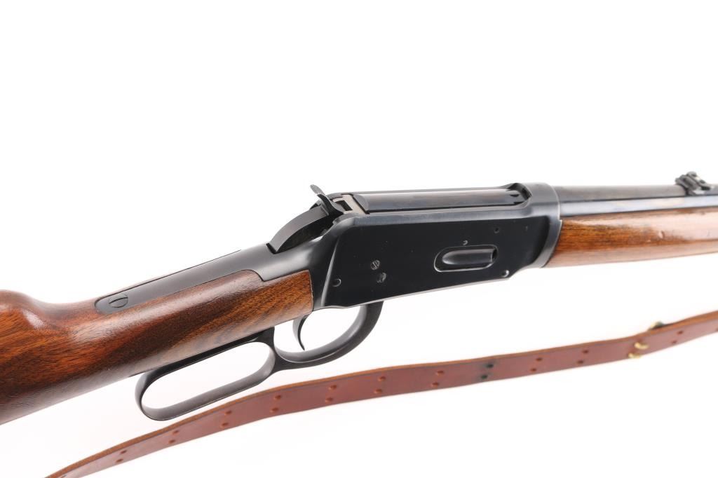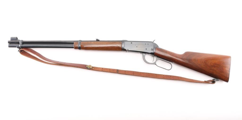 SN: 2181803 'Eastern Carbine' Lever action rifle manufactured circa 1953. Features blued finish, smooth wood stock and forend, serrated steel buttplate, hooded blade front sight with beaded top, folding adjustable rear sight, 20" barrel with full length magazine tube underneath, smooth walnut forend, smooth walnut shoulder stock with straight wrist. Sling studs added at butt, and to mag tube (clamp). Bore is very good condition. Retains 95% finish with scratches, edge losses, handling marks, some thinning on lever. Wood is very good condition with dents & scratches, varnish added, fancy figure in butt. Markings are sharp. Action is smooth. Includes good condition brown leather sling. Condition is NRA Very Good *** C&R Firearm ***