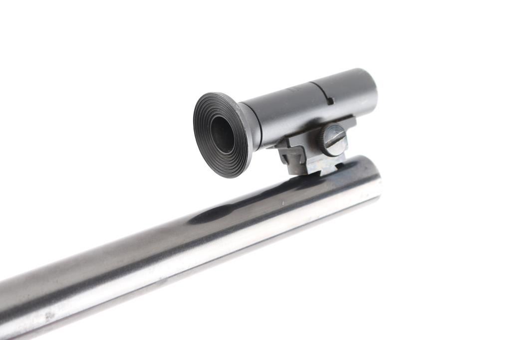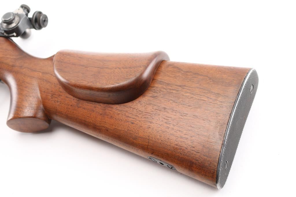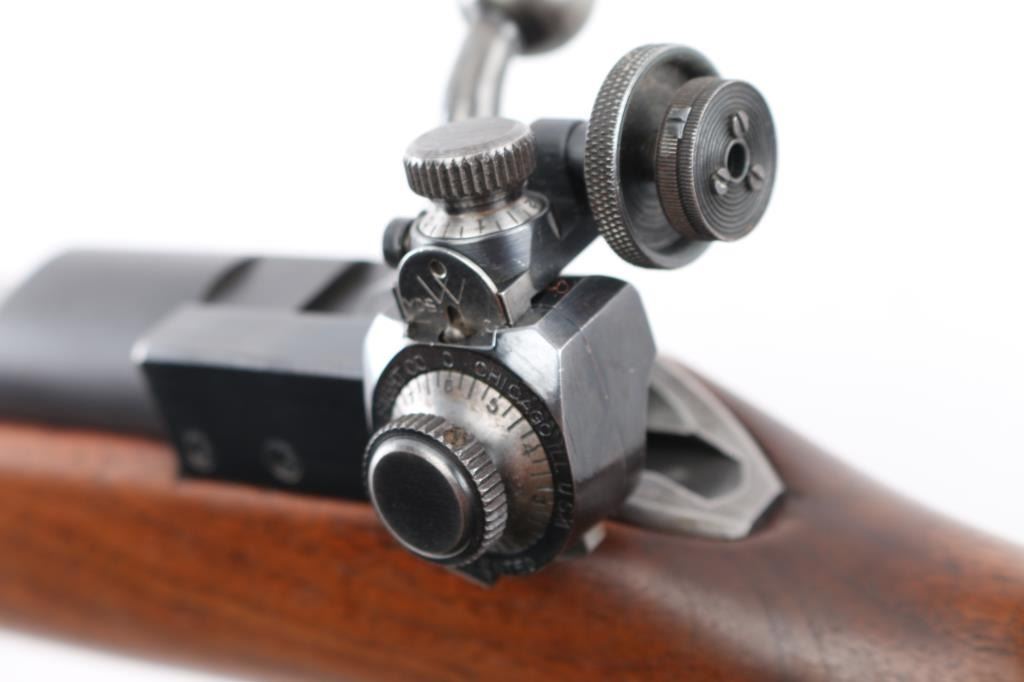 '52B Target' Desirable bolt action target rifle chambered in .22 Long Rifle, manufactured circa 1946. The model 52 is regarded by many as one of the finest small-caliber rifles ever built. It features a blued finish,matte receiver. 28" heavy bull barrel, Redfield Olympic globe front sight, and a vintage Vaver Sight Co. Chicago,Illinois Dial Micrometer receiver peep sight, precision made for the Model 52 Winchester, mounted on the left side of the receiver, installed scope blocks, wide serrated trigger, Manuel safety on the right side of the receiver, polished bolt, push button magazine release, detachable 5-rd magazine with wide custom knurled aluminum base. Knurled metal buttplate and smooth walnut bench rest type pistol grip shoulder stock with inlayed accessory rail in the forend. Installed high comb cheek piece for right-handed shooting. Rifle exhibits approximately 95% of it's original finish showing slight muzzle wear, finish loss, scratches, and some light scattered pitting on the triggerguard.. Action is smooth, bore is excellent/bright, strong rifling. Wood is very good/sound with minor scratches/handling wear. Missing the rear sling swivel. Perfect for competitive target shooting. NRA condition-Very Good. C&R Firearm.