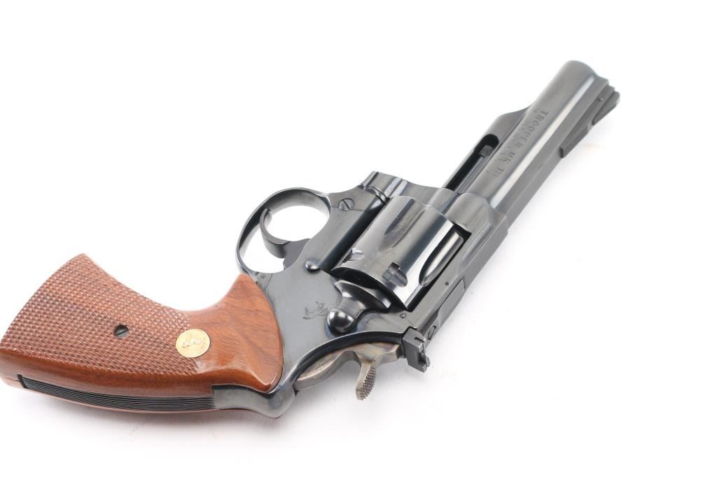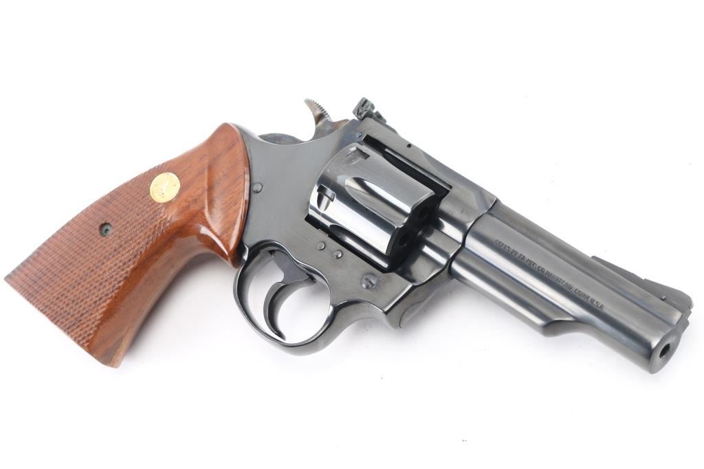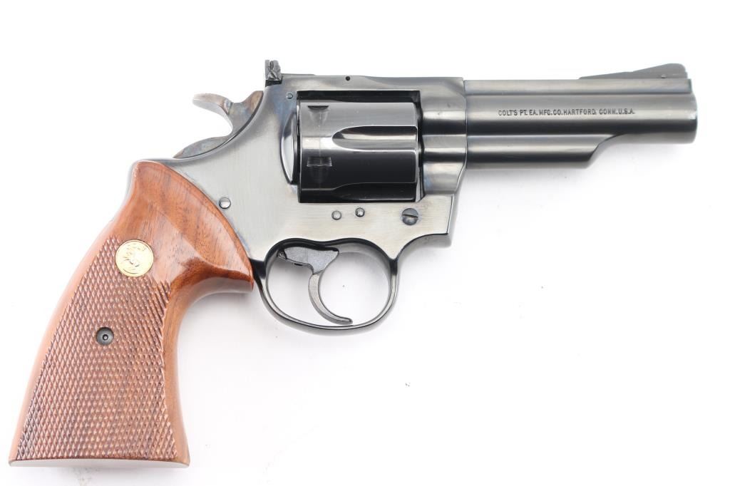 Double/Single action revolver features blued finish, checkered wood grips with Colt logo medallions, 4" ribbed barrel, adjustable sights, wide smooth target trigger, case color hammer with wide checkered spur, swing-out 6 shot fluted cylinder. Manufactured 1979. Bore and charge holes are excellent. Retains 99% deep blue, with faint tracking on the cylinder. Grips are excellent. Action is smooth. Good lock-up. NRA Condition-Excellent. Modern Firearm.
