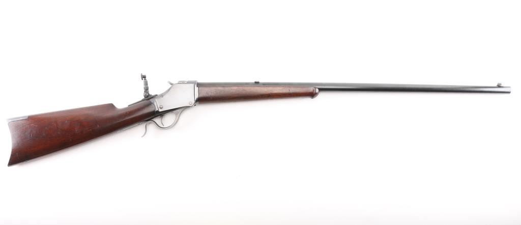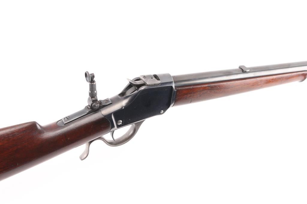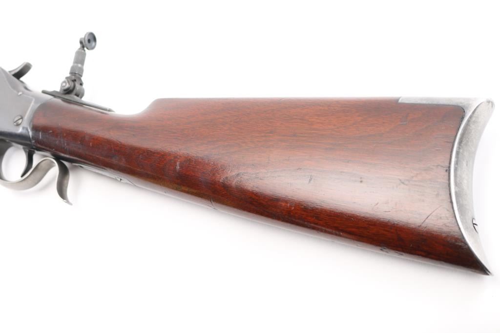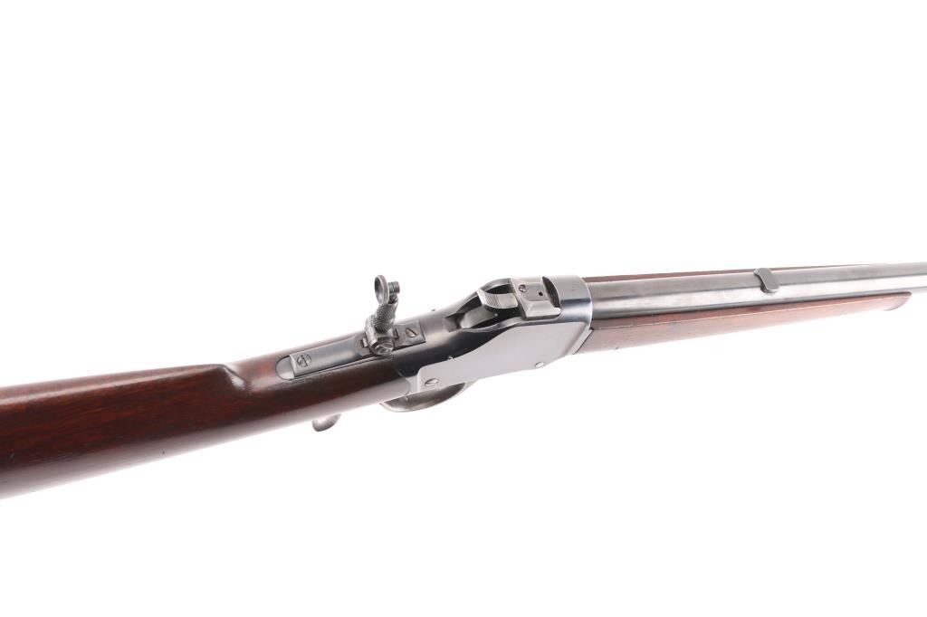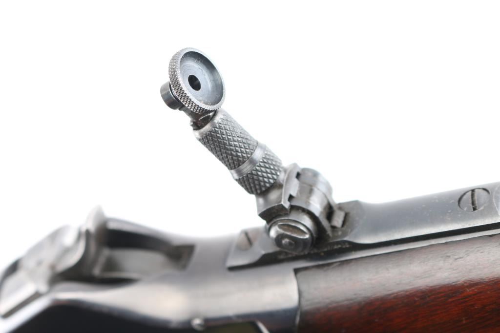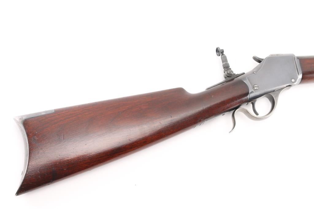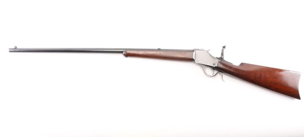 'High Wall' Antique single shot lever action falling block rifle manufactured circa 1886. Features a 28" round barrel, blade front sight, Marble's folding adjustable rear tang peep sight, rear sight dovetail on barrel filled with a blank, smooth walnut forend with slight schnabel tip, straight gripped smooth walnut buttstock with steel crescent buttplate. Bore is very good bright condition. Retains 90% bright blued finish, appears possibly reblued, with edge losses & handling marks, some color fading on barrel. Finger lever & butt plate show a dull gray bare metal. Some minor imperfections in surface finish below the current blued finish. Wood is very good, varnished, with small dents. Markings are sharp. Action is smooth. Condition is NRA Fine (possibly reblued) *** Antique Firearm ***