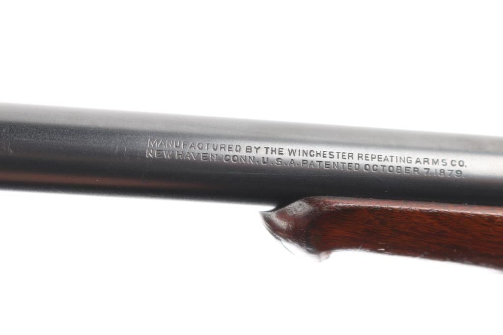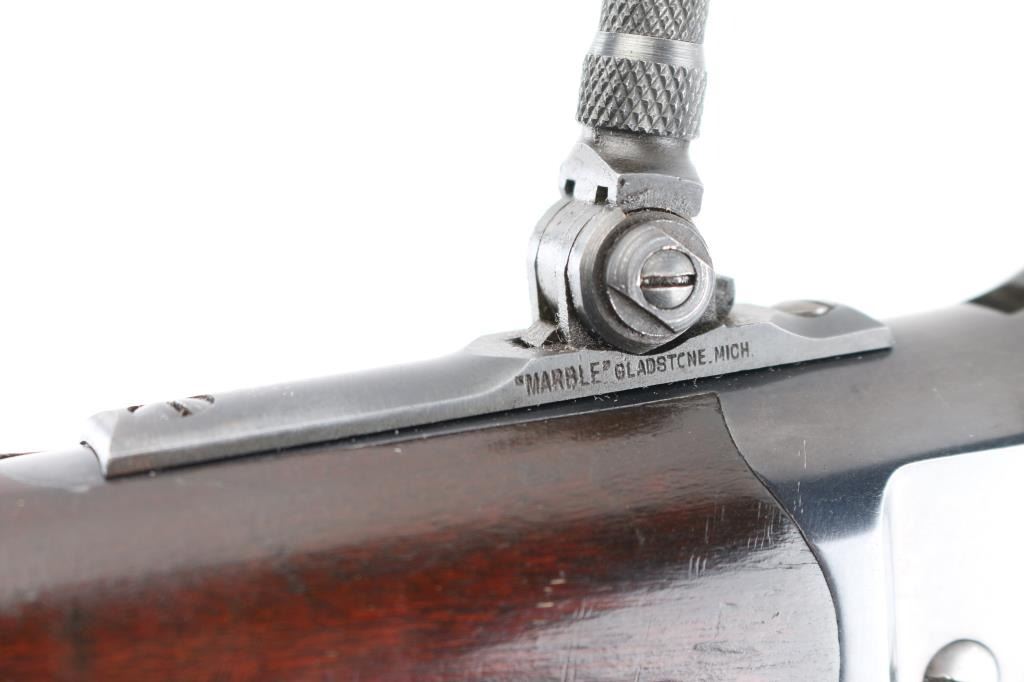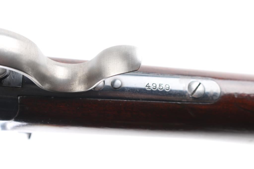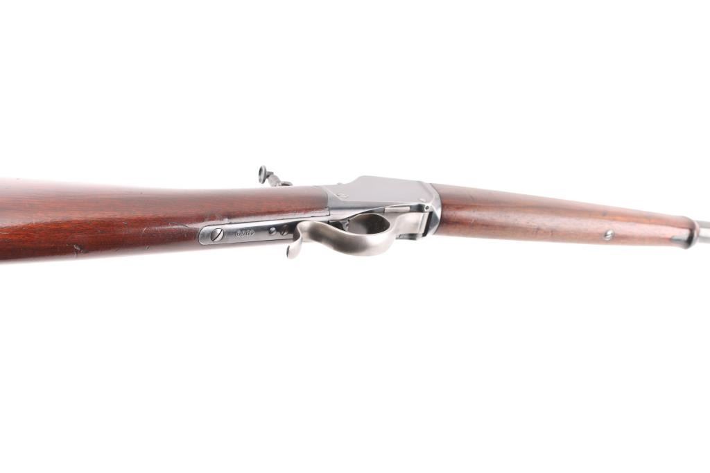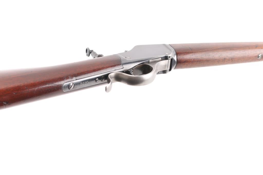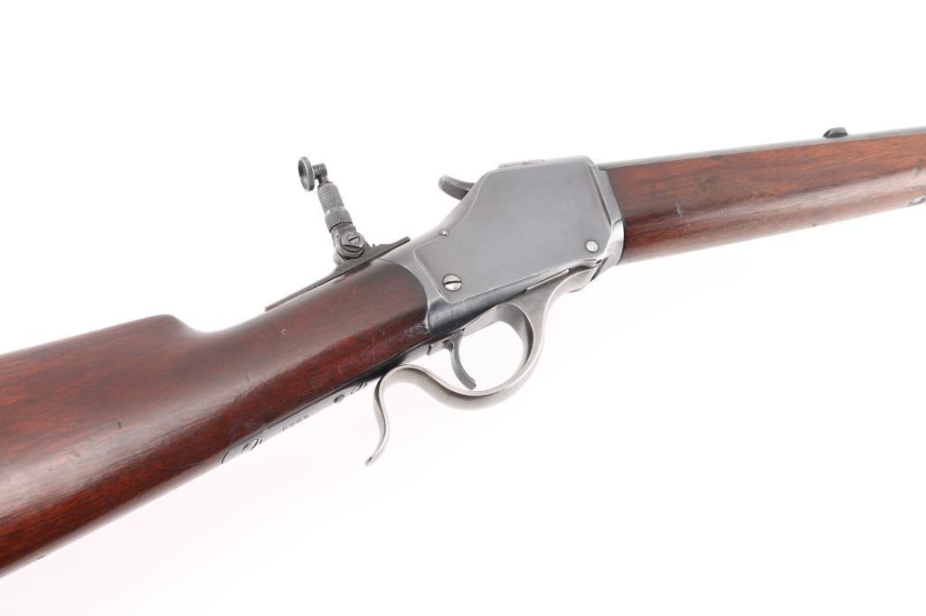 'High Wall' Antique single shot lever action falling block rifle manufactured circa 1886. Features a 28" round barrel, blade front sight, Marble's folding adjustable rear tang peep sight, rear sight dovetail on barrel filled with a blank, smooth walnut forend with slight schnabel tip, straight gripped smooth walnut buttstock with steel crescent buttplate. Bore is very good bright condition. Retains 90% bright blued finish, appears possibly reblued, with edge losses & handling marks, some color fading on barrel. Finger lever & butt plate show a dull gray bare metal. Some minor imperfections in surface finish below the current blued finish. Wood is very good, varnished, with small dents. Markings are sharp. Action is smooth. Condition is NRA Fine (possibly reblued) *** Antique Firearm ***