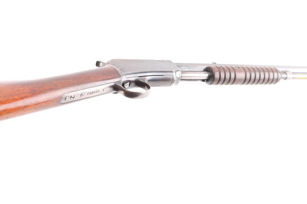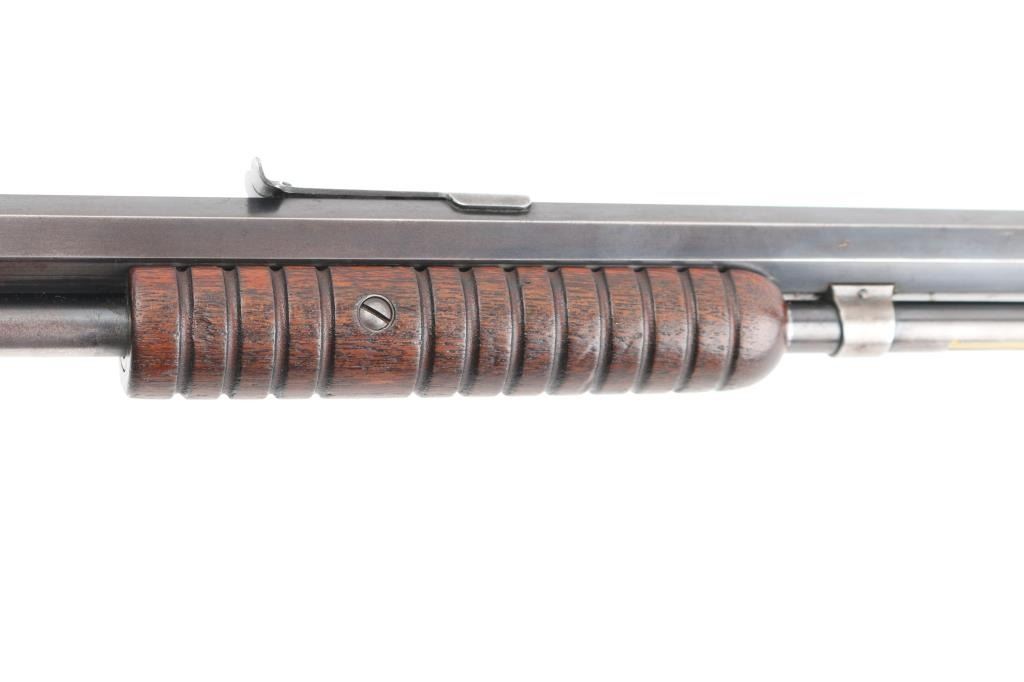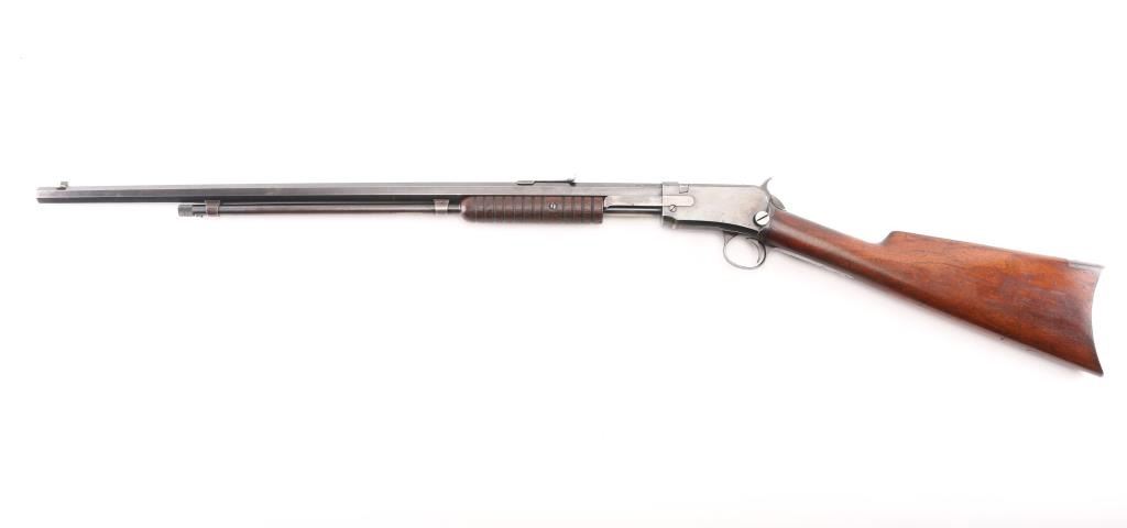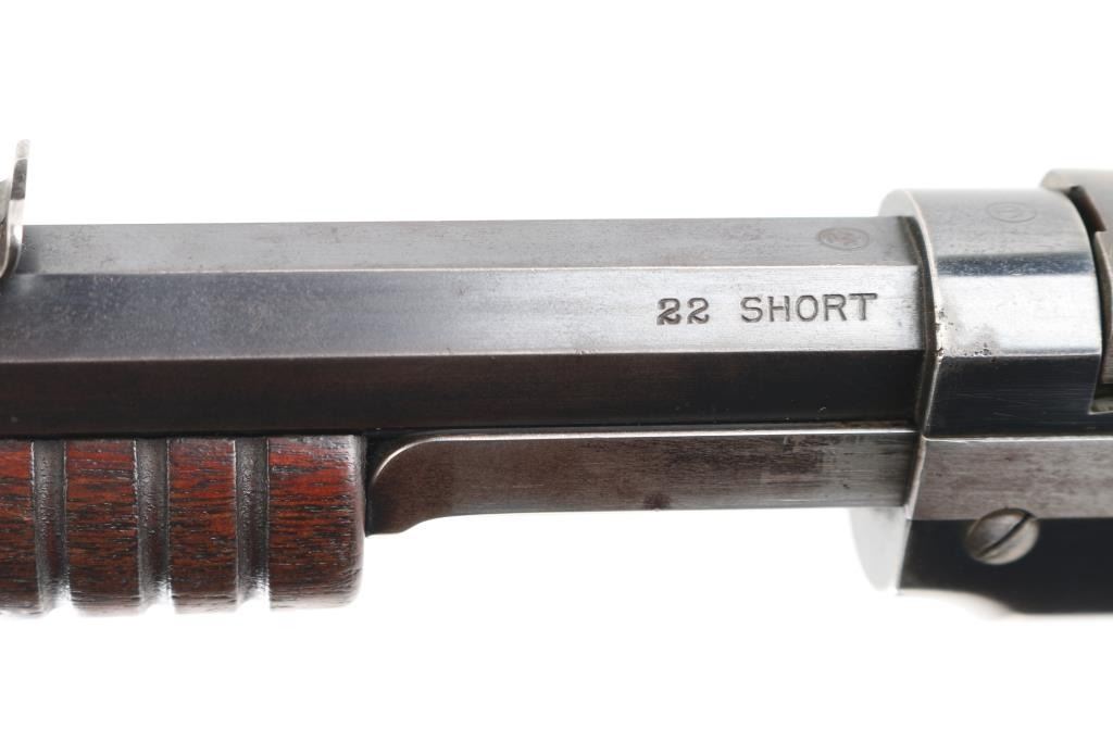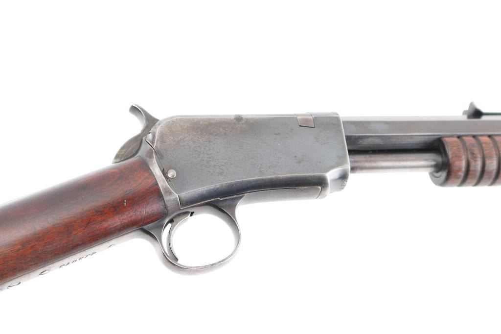 Vintage take-down pump action rimfire rifle manufactured circa 1910. Features blued finish, grooved walnut pump handle, smooth walnut shoulder stock with straight grip area, steel crescent buttplate, 24" octagon barrel, blade front sight, adjustable rear sight, 2/3 length magazine tube under barrel, external hammer, take down screw in receiver. Bore is good to very good condition, bright overall, some pitting or possible leading. Retains 50% blued finish, turning brown on mag tube, rubbed to bare metal on tangs where handled and on moving parts, edge losses, scratches on receiver. Wood is very good condition, varnished, age staining on pump handle. Action is smooth. Markings are sharp. Condition is NRA Very Good *** C&R Firearm **