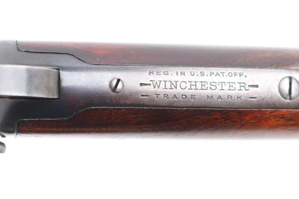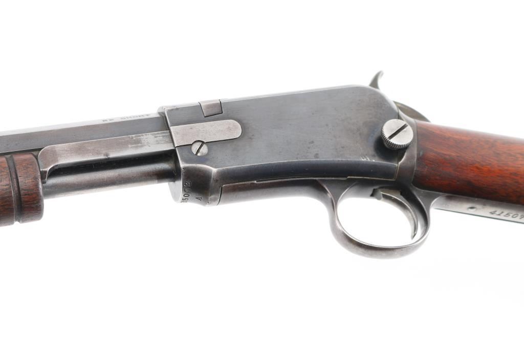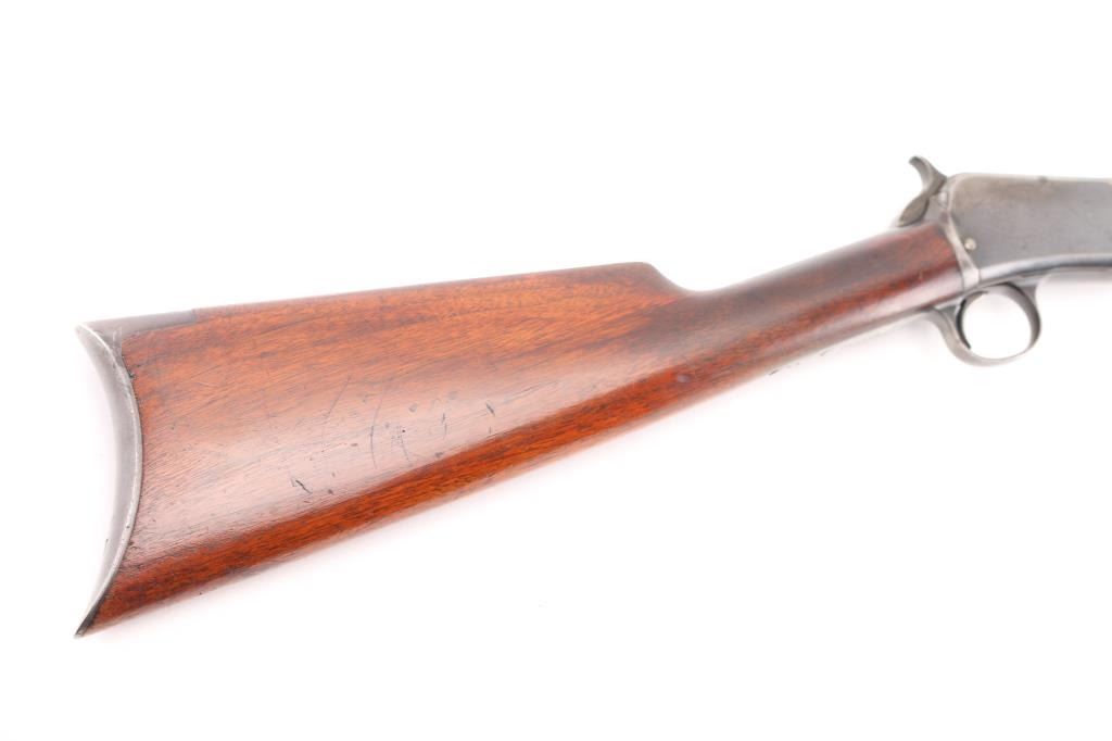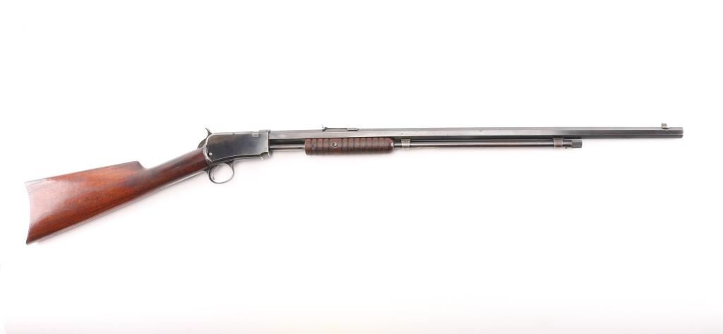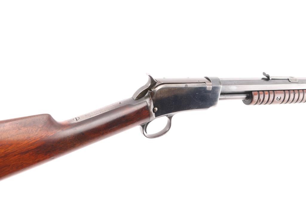 Vintage take-down pump action rimfire rifle manufactured circa 1910. Features blued finish, grooved walnut pump handle, smooth walnut shoulder stock with straight grip area, steel crescent buttplate, 24" octagon barrel, blade front sight, adjustable rear sight, 2/3 length magazine tube under barrel, external hammer, take down screw in receiver. Bore is good to very good condition, bright overall, some pitting or possible leading. Retains 50% blued finish, turning brown on mag tube, rubbed to bare metal on tangs where handled and on moving parts, edge losses, scratches on receiver. Wood is very good condition, varnished, age staining on pump handle. Action is smooth. Markings are sharp. Condition is NRA Very Good *** C&R Firearm **