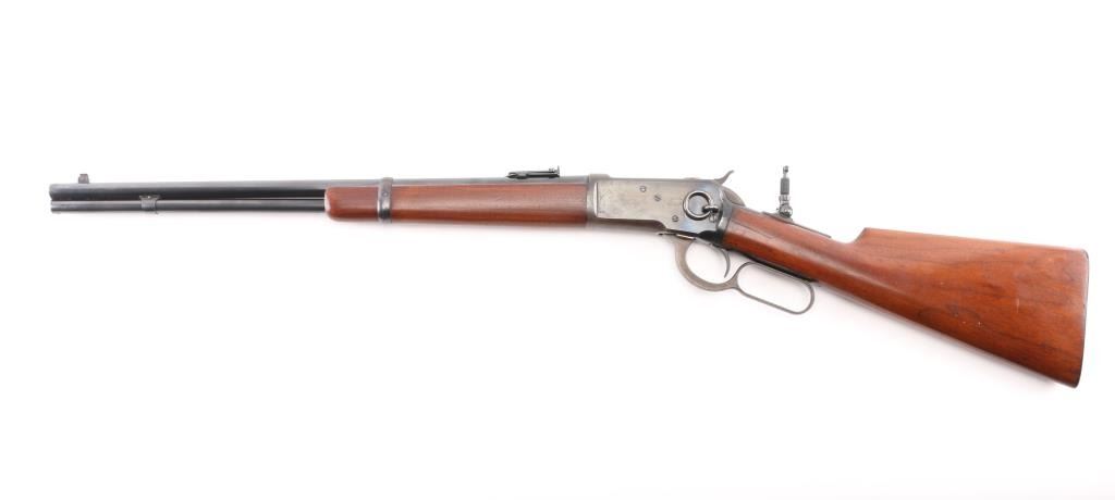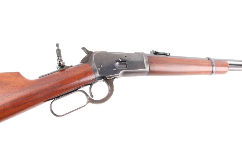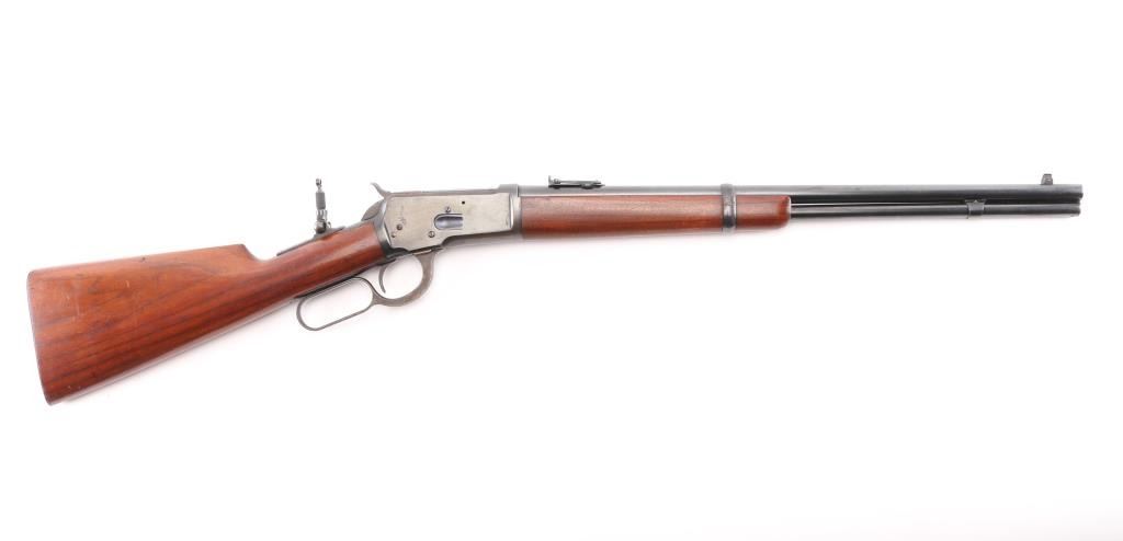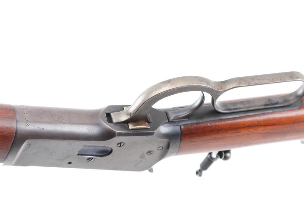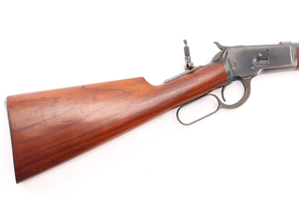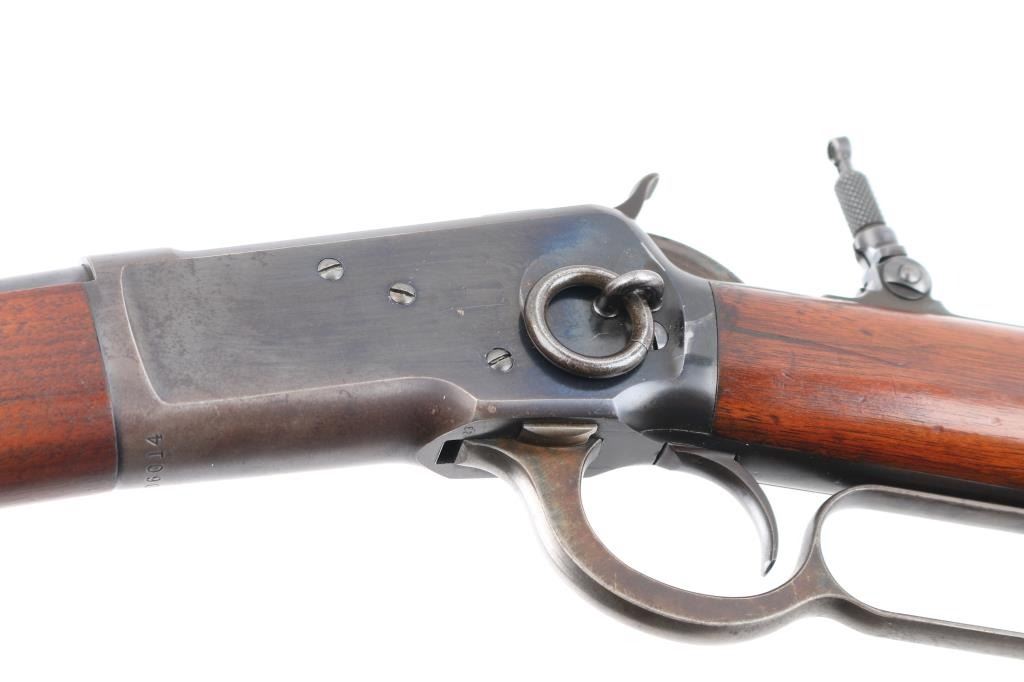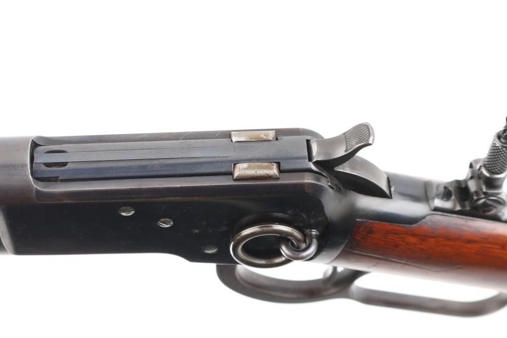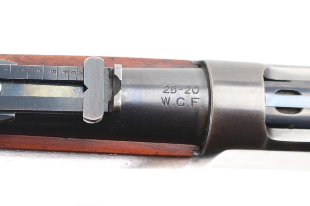 'Saddle Ring Carbine' Vintage lever action rifle manufactured circa 1903. Features 20" barrel, full length magazine tube, single barrel band, dovetailed ring bracket under barrel holds mag tube, pinned blade front sight, folding ladder rear sight, tang mounted folding adjustable peep sight, smooth walnut forend & straight wristed buttstock, shotgun butt with smooth steel buttplate. Bore is very good bright condition. Retains 70% bright original blued finish, with edge losses, scratches and some pinprick patina on receiver sides. Receiver shows a higher polish level on rear half of both sides, fading color approaching gray across bottom. Saddle ring has rubbed a ring of thinning finish. Finger lever shows dulled case color. Loading gate shows bright blue color. Wood is very good, lightly varnished, small dents & scratches, deep scratch or crack on left side at tang. Markings are sharp. Action is smooth. Includes factory letter stating 25/20 caliber carbine, Lyman front & rear sights, shotgun butt. Condition is NRA Very Good+ *** C&R Firearm ***