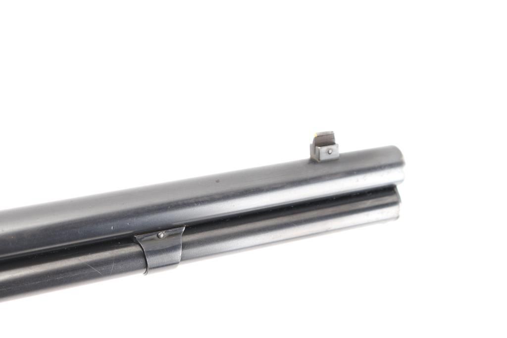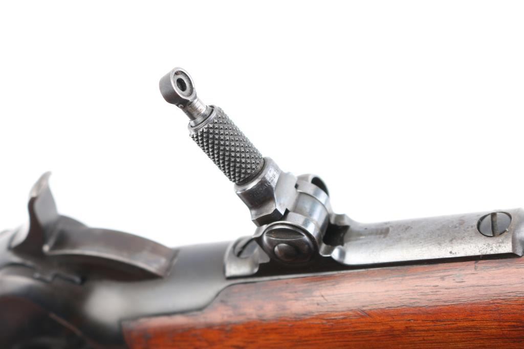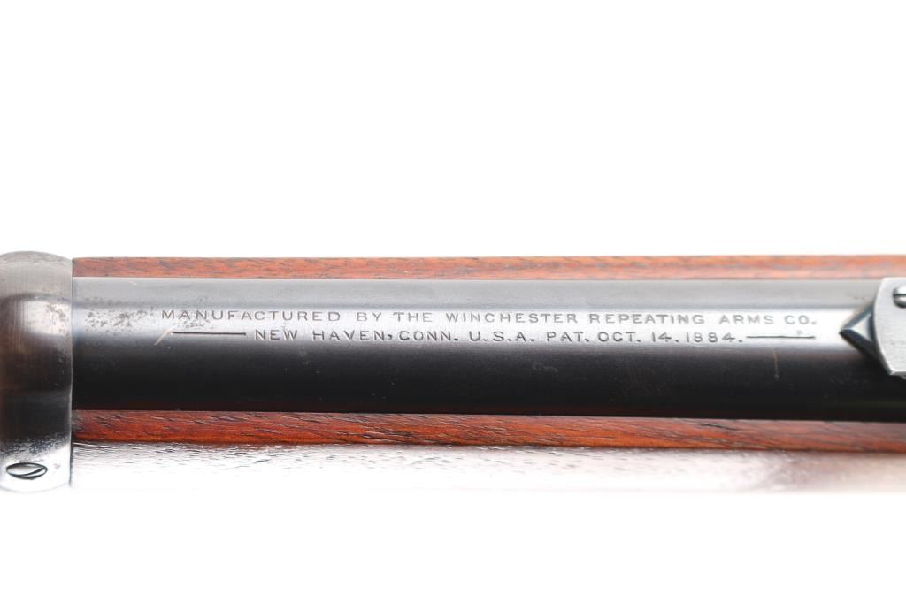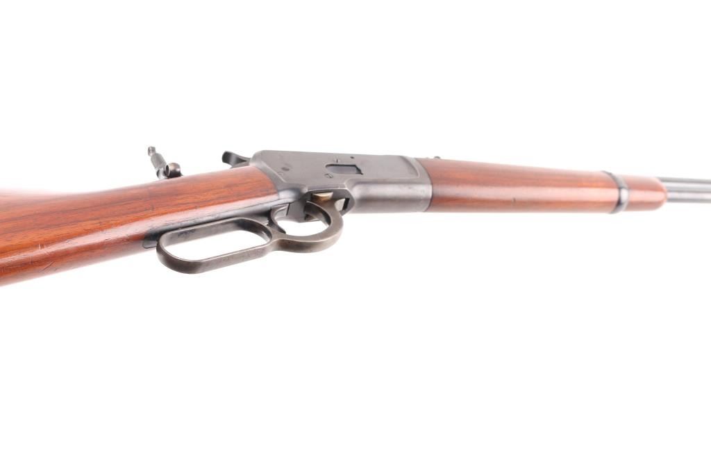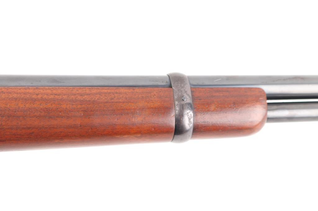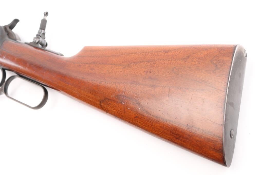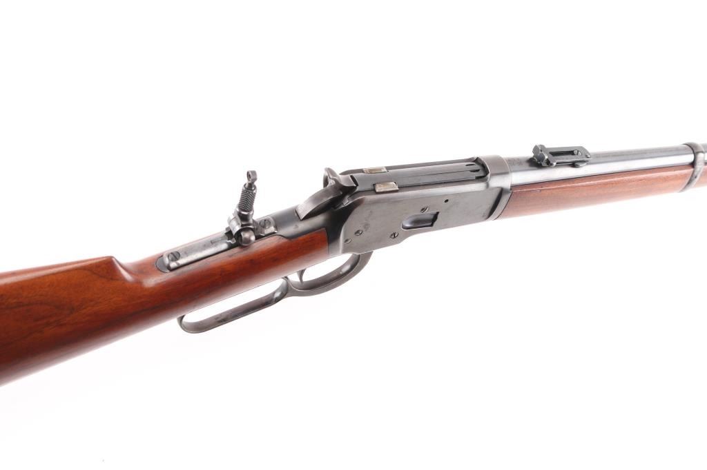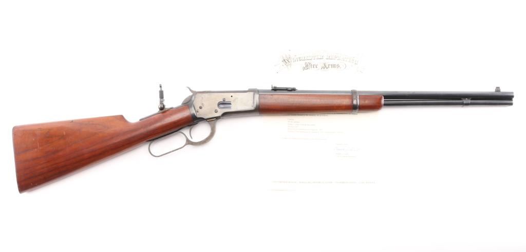 'Saddle Ring Carbine' Vintage lever action rifle manufactured circa 1903. Features 20" barrel, full length magazine tube, single barrel band, dovetailed ring bracket under barrel holds mag tube, pinned blade front sight, folding ladder rear sight, tang mounted folding adjustable peep sight, smooth walnut forend & straight wristed buttstock, shotgun butt with smooth steel buttplate. Bore is very good bright condition. Retains 70% bright original blued finish, with edge losses, scratches and some pinprick patina on receiver sides. Receiver shows a higher polish level on rear half of both sides, fading color approaching gray across bottom. Saddle ring has rubbed a ring of thinning finish. Finger lever shows dulled case color. Loading gate shows bright blue color. Wood is very good, lightly varnished, small dents & scratches, deep scratch or crack on left side at tang. Markings are sharp. Action is smooth. Includes factory letter stating 25/20 caliber carbine, Lyman front & rear sights, shotgun butt. Condition is NRA Very Good+ *** C&R Firearm ***