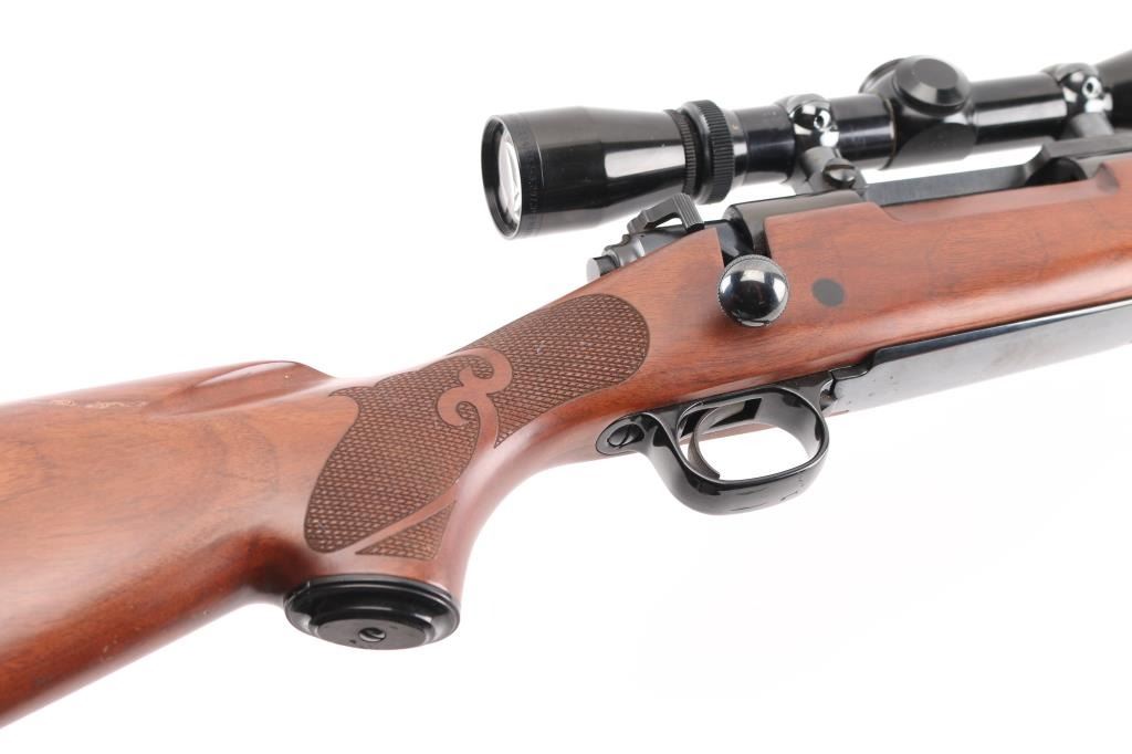 Caliber .257 Roberts SN: G1511303. Light weight bolt action sporting rifle. Features a blued finish, 22" tapered barrel with no provisions for sights, installed Leupold one-piece scope base with rings, Leupold 3x9 scope, clear optics. serrated trigger, jeweled bolt, three position safety on the rear of the bolt, internal box magazine with hinged floorplate, and fancy checkered pistol grip walnut shoulder stock with schnabel forend, grip cap, Factory red recoil pad & 13 1/2" LOP. Rifle exhibits approximately 99% of it's original blued finish showing very little wear. Action is smooth, the bore is pristine, and the wood stock is fine. NRA Condition-Excellent. Modern Firearm.