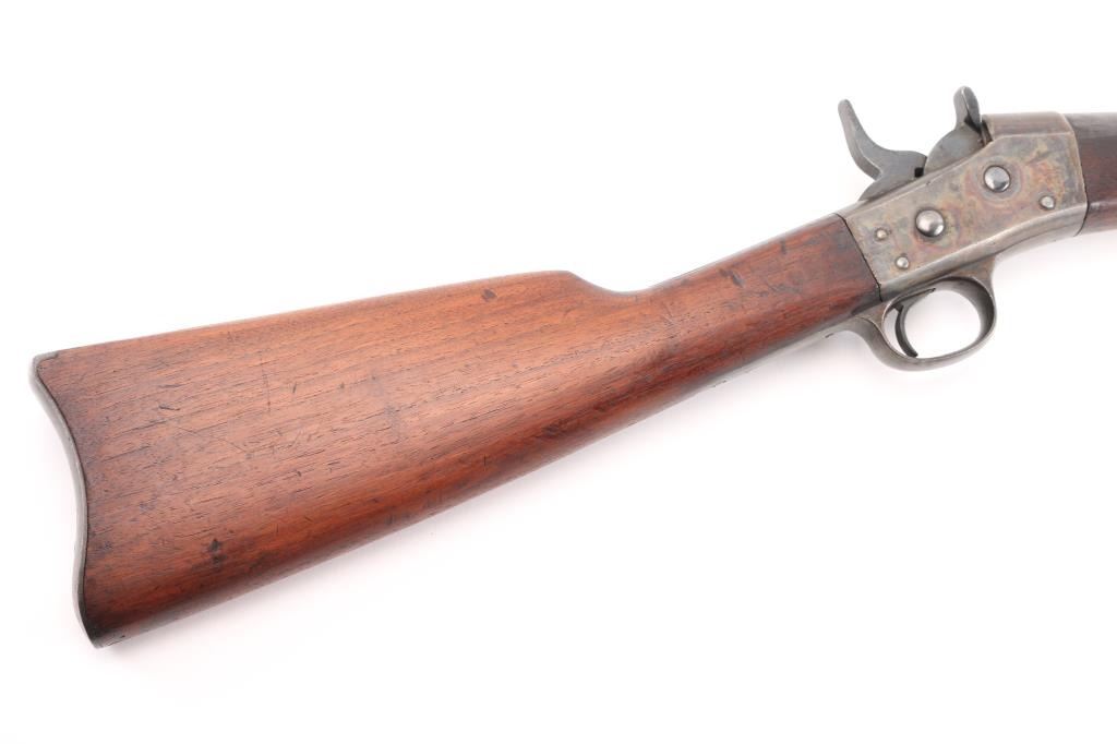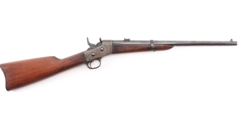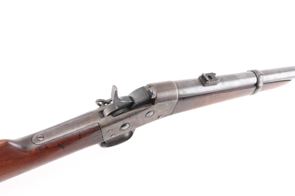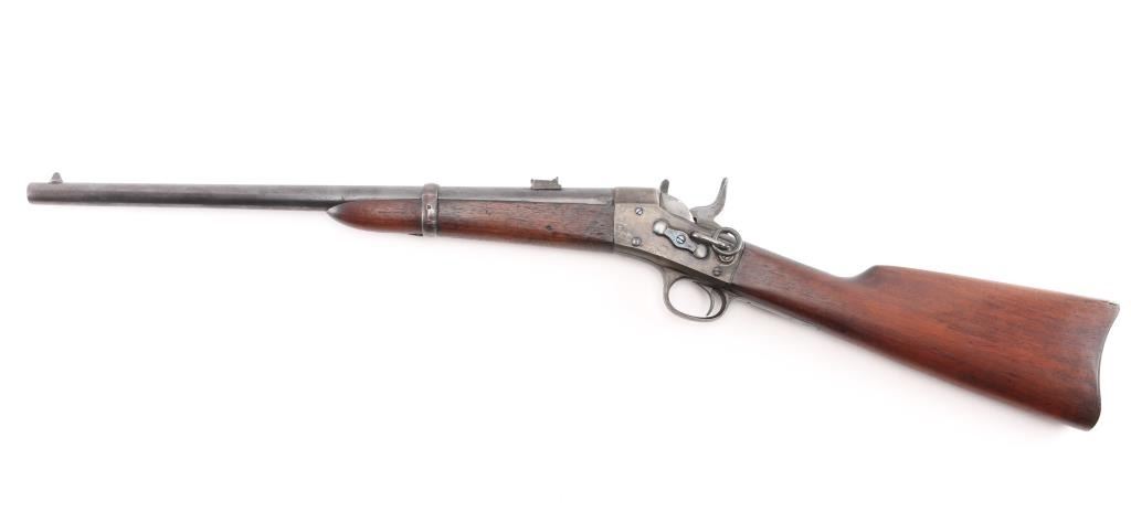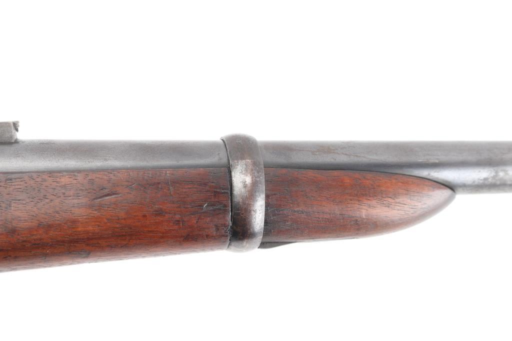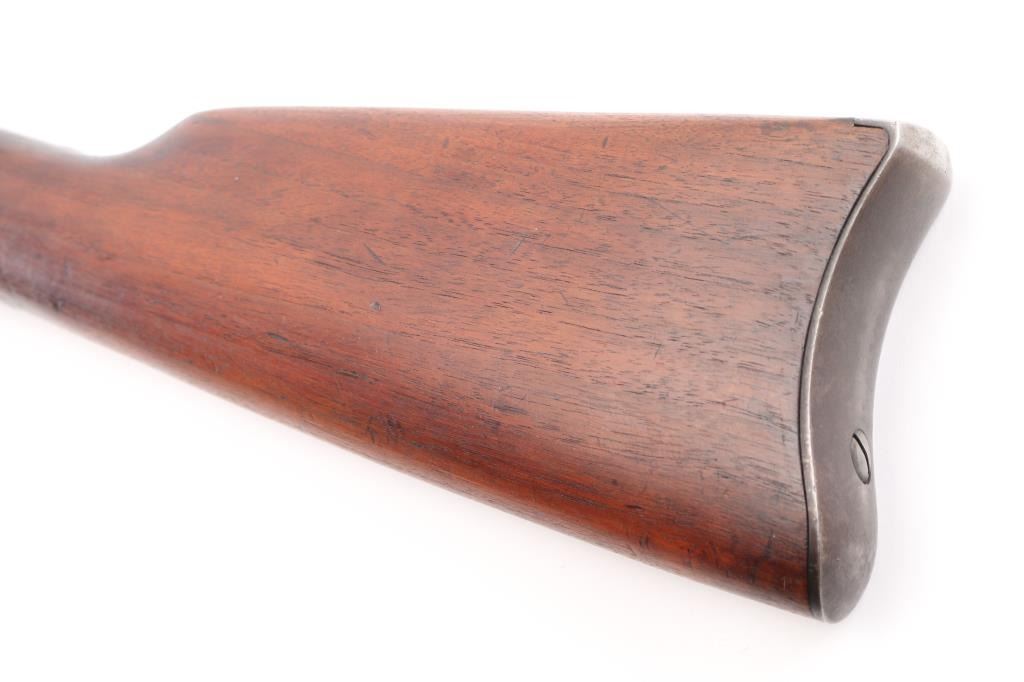 NVSN No. 1 Military Rolling Block carbine. Manufactured between 1867-1888. Not caliber marked, appears to be consistent with 43 Spanish chambering. Features blued barrel & small parts, case hardened receiver, 20.5" barrel, post front sight, two position rear sight with wide "V" notch or multi-notch ladder, saddle ring on left side of receiver, curved metal carbine butt plate. Bore is very good bright condition. Retains 80% finish, some fading of blued finish towards dull dark gray, some beginning of patina on bottom of barrel, with edge losses. Case colors on receiver are good with various typical colors retained, some dulling and muting of colors. Wood is very good, possibly cleaned or lightly sanded, darker colors in dents, oil staining where wood touches metal. Action is sound. Patent markings on upper tang are partially eroded, possibly indicates previous rework, in the past. Condition is NRA Fine *** Antique Firearm ***