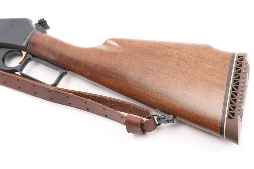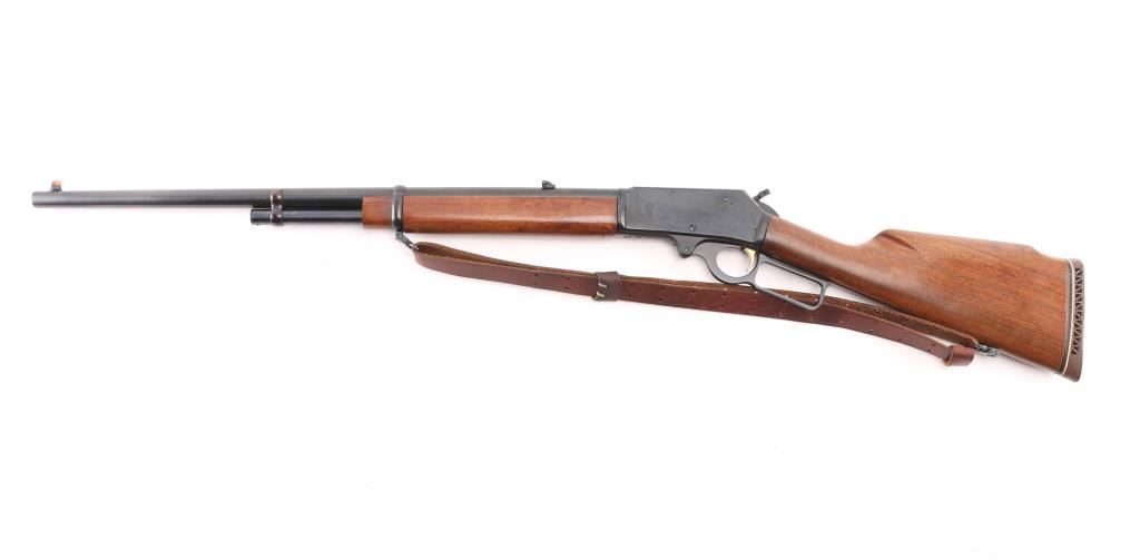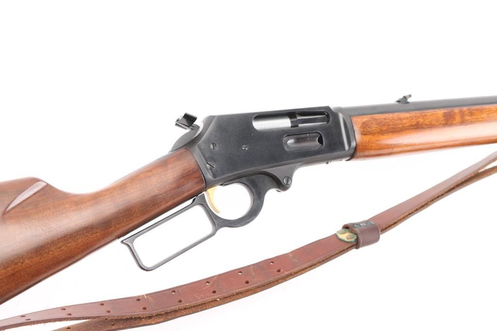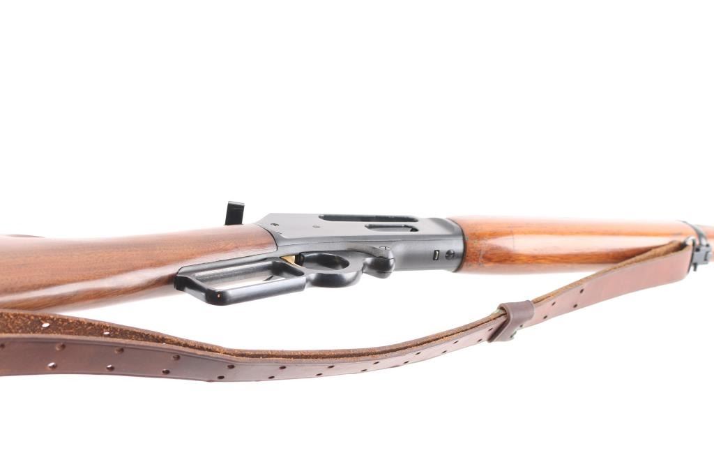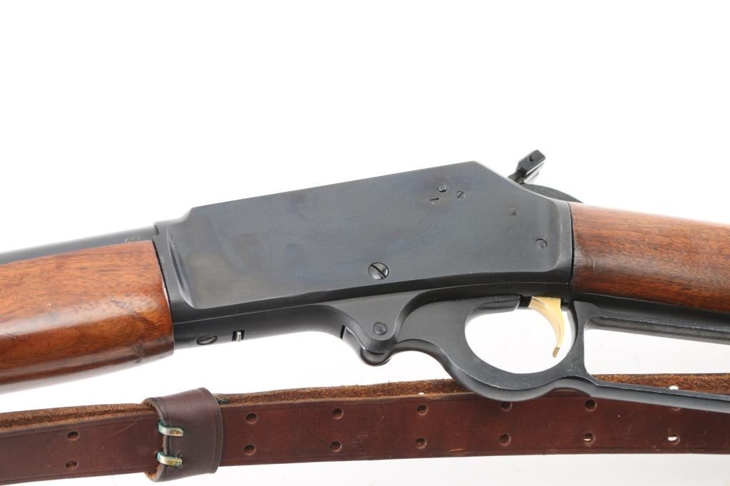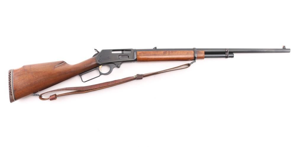 Big bore lever action repeating rifle chambered in .444 Marlin, date coded 1971. Features a blued finish, 24" micro-groove barrel, half length tubular magazine, blade front sight with brass bead (orange paint applied), adjustable folding leaf rear sight, smooth gold accent trigger, driller & tapped receiver, serrated hammer spur with offset extension installed, swivel studs, smooth walnut forend and straight wristed shoulder stock with ventilated rubber recoil pad. Bore is very good bright condition. Retains 95% finish with handling marks. Wood is very good condition, shows some nice grain in comb area of butt. Includes good condition brown leather two hook sling. Condition is near NRA Excellent *** C&R Firearm ***