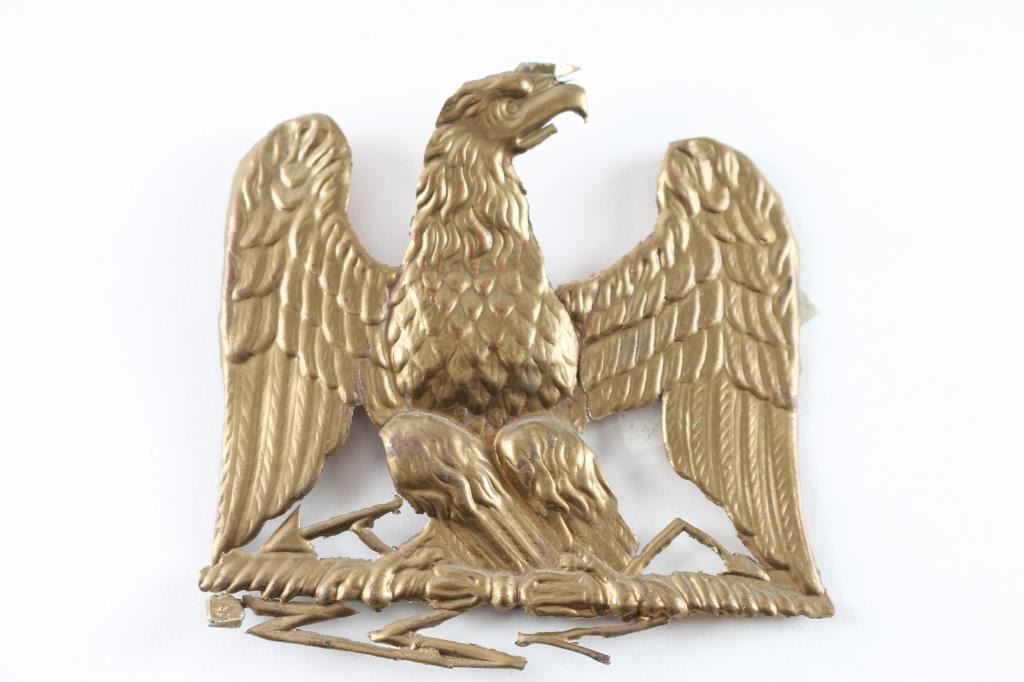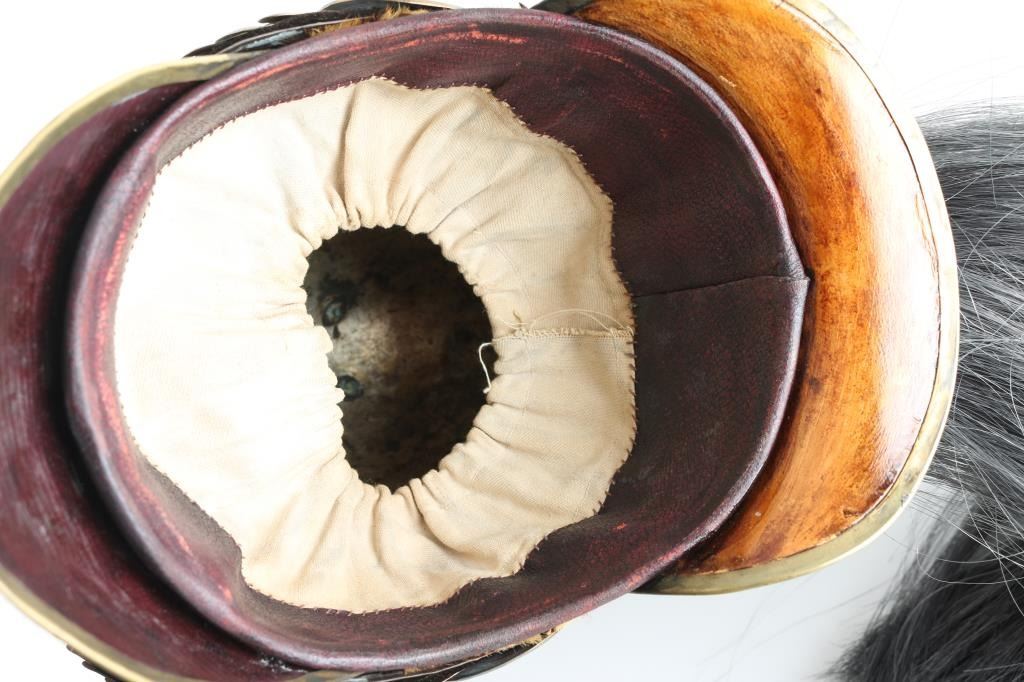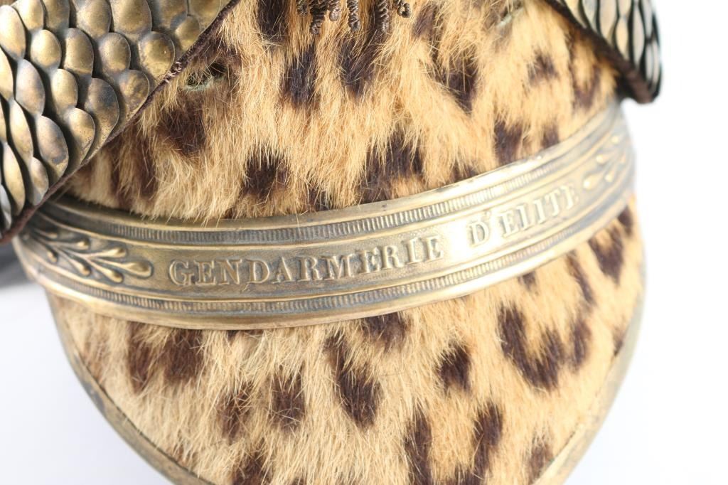 1st Empire 1806 pattern Dragoon helmet of the Gendarmes D'élite de la Garde Impériale (English: "élite gendarmes of the Imperial Guard") was a gendarmerie unit formed in 1801 by Napoleon as part of the Consular Guard which became the Imperial Guard in 1804. In time of peace, their role was to protect official residences and palaces. Tall "a la Minerve" Officers Helmet shell in cooper with most of its original un-polished fire gilting. Tall nicely "stamped out" Cimier (Crest) of officers grade with beautiful detail topped with the typical black horsehair crest and tail that is also period to this helmet. Medusa Head and "Palmette" in front, sides have a crescent moon encircled by a Infantry horn, and a snake coiled around a acorn branch. Fur decoration. Brass band above the visor reads "Gendarmerie Elite". A black horsehair Marmouset tops of the whole helmet and is affixed through the cimier. The brass chin scales are held in place by an embroidered tasseled cord attached to bosses with stamped lions head design. Inside officers liner is in two parts, complete and remains supple for its age. Both visors bear their original "basane" lining underneath. Tall white feather plume may be a later replacement. The 1st Empire crowned imperial eagle has become detached from the helmet. and is in poor condition with some soldered repairs. and the crown has broken off. Included. Very rare, we could not find any reference to this helmet.