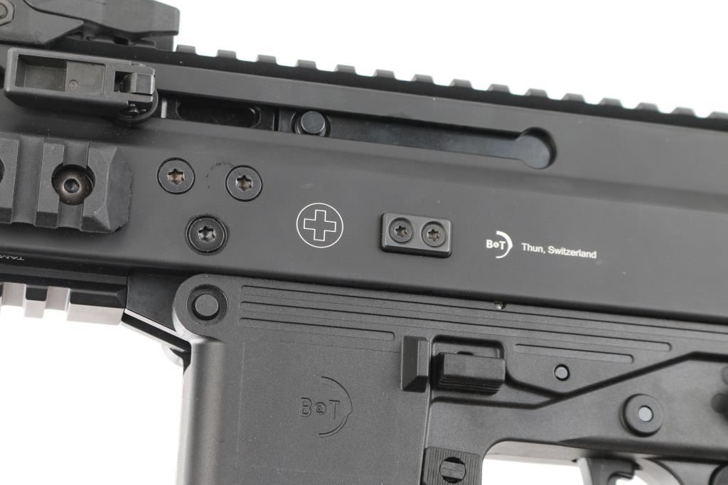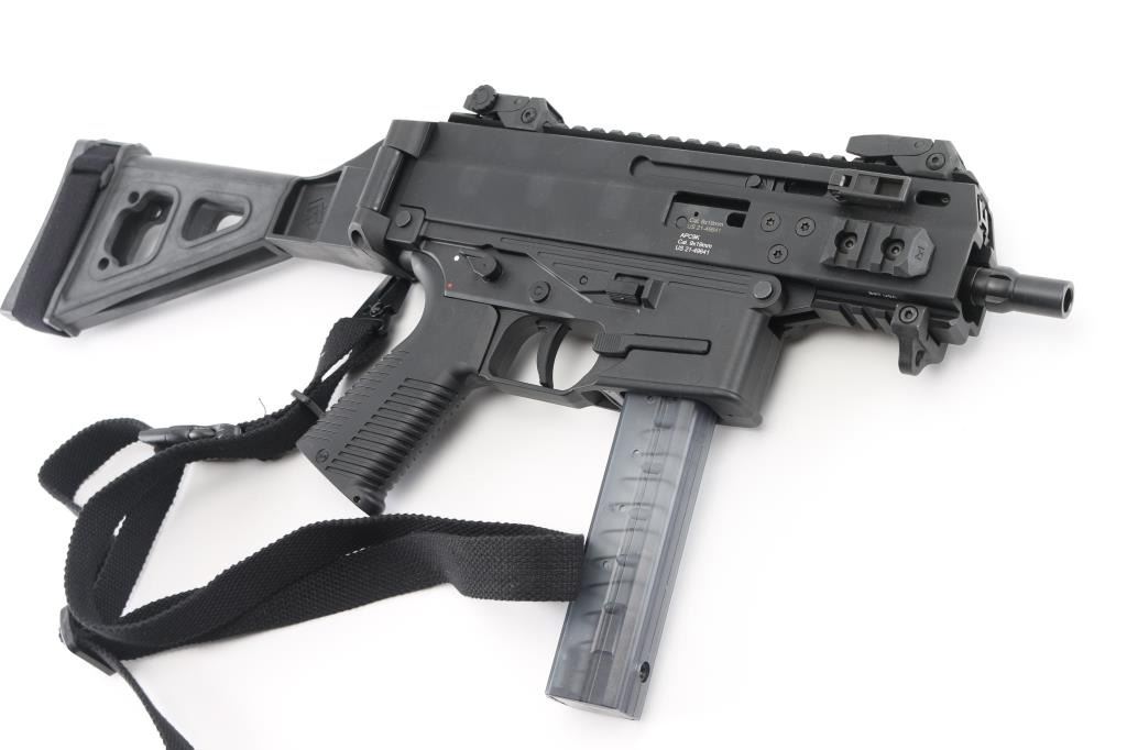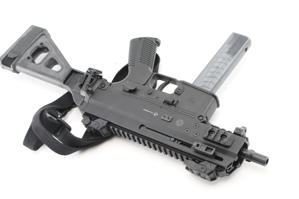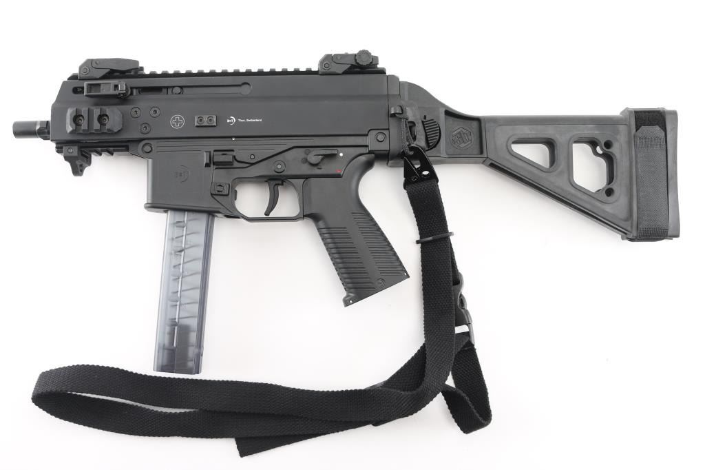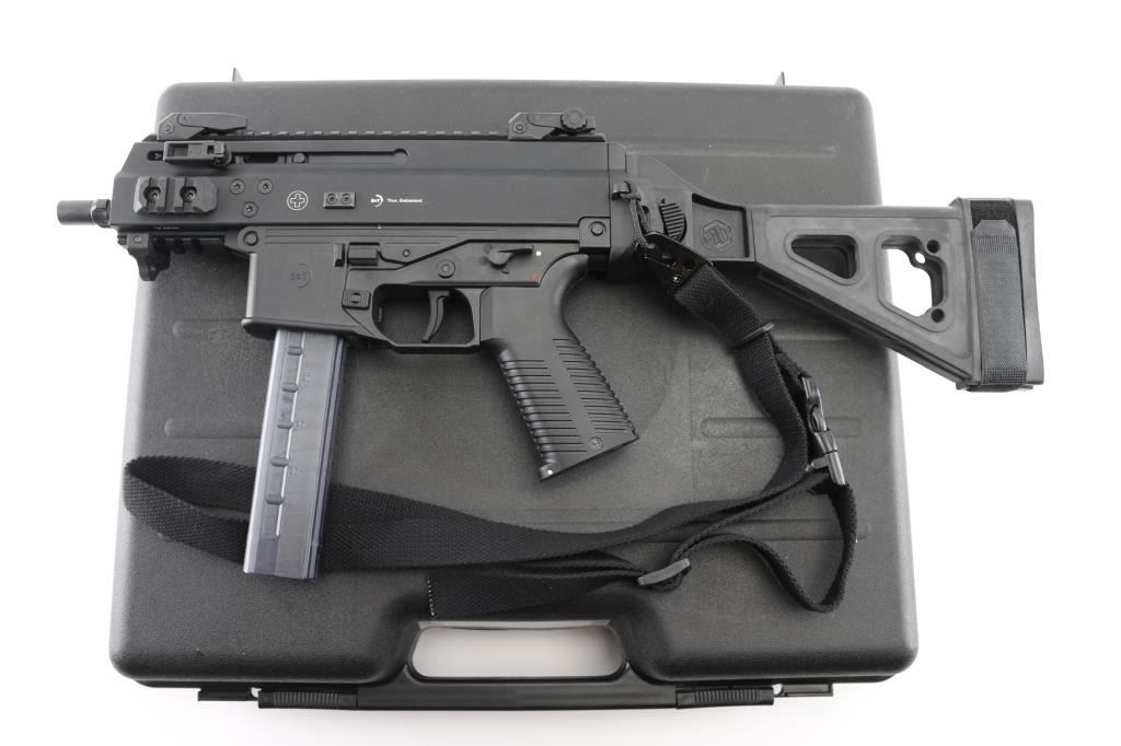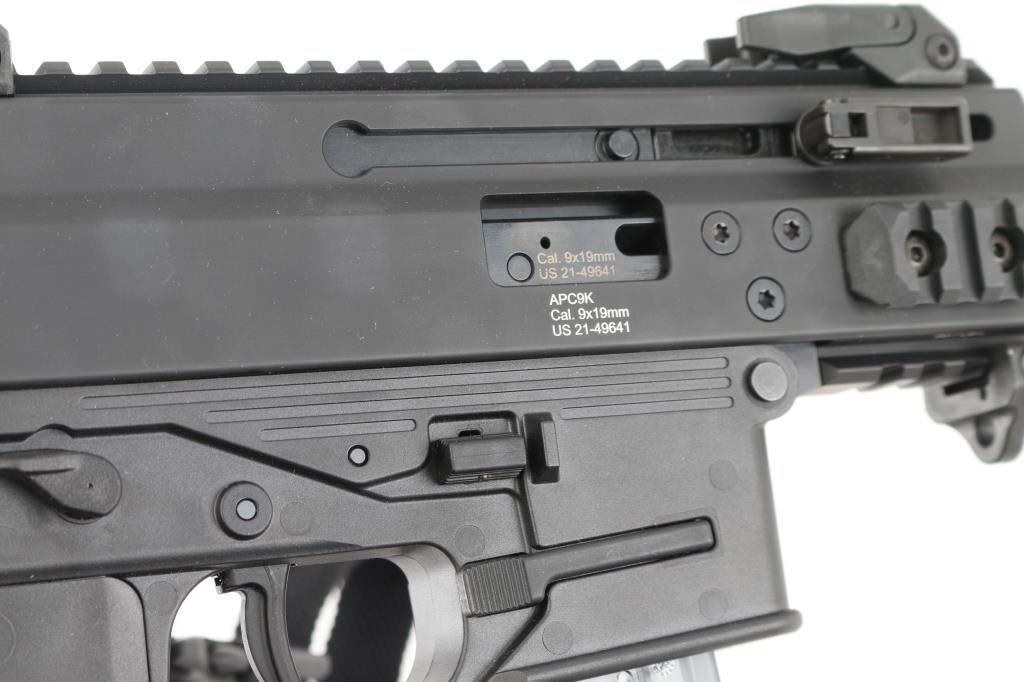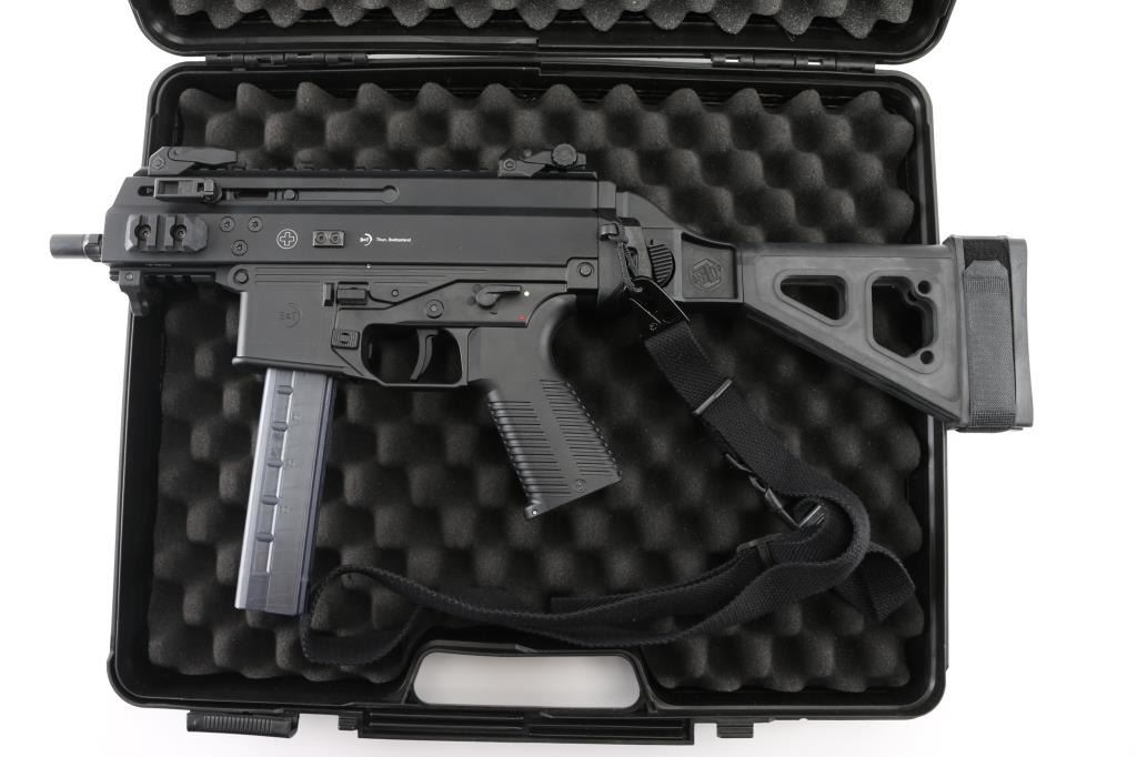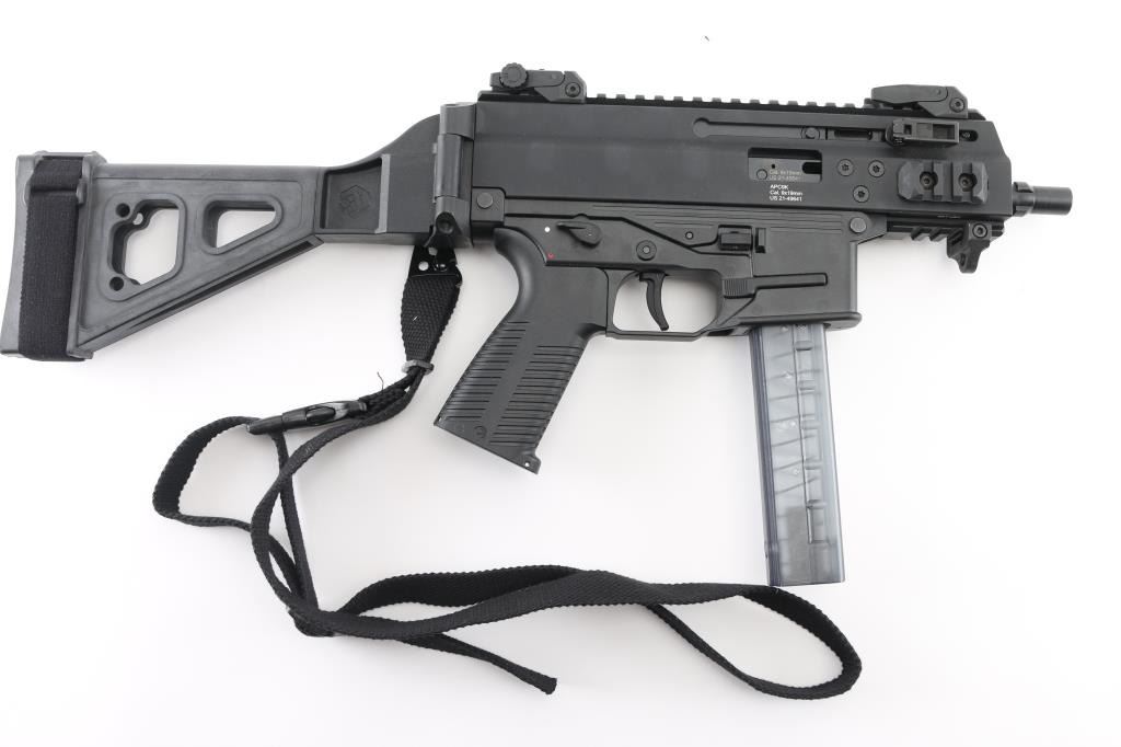 'Advanced Police Carbine' High quality Swiss made blowback operated semi-automatic pistol chambered in 9x19mm. The 'Pro' version of the APC9K features several improvements over the standard, including non-reciprocating charging handles, fully ambidextrous controls, removable AR pattern pistol grip and interchangeable lower receivers for magazine compatibility. Recently the United States Army & Air Force have selected the APC9K Pro as its Sub Compact Weapon (SCW) to support global personal protective missions. Pistol features a matte black finish, threaded 4” barrel, installed 1/2”-28 three-lug adapter, factory flip-up polymer sights, folding charging handles on the left & right side, aerospace-grade alloy receiver with full-length optics rail, M-LOK picatinny rail segments at 3 & 9 o'clock & integral accessory rail at the 12 o'clock position, black polymer lower receiver, ambidextrous push button magazine release, factory B&T 30 round magazine, ambidextrous bolt catch, ambidextrous selector lever, grooved black polymer pistol grip with storage compartment, black nylon single point sling, removable sling point installed on the lower accessory rail, and right side folding SB Tactical brace. Includes the original factory hard case with knurled 1/2”-28 thread protector, hex tools, comprehensive cleaning kit, and documents. Pistol exhibits no signs of use or wear. Condition is like NRA Perfect in case. *** Modern Firearm ***
