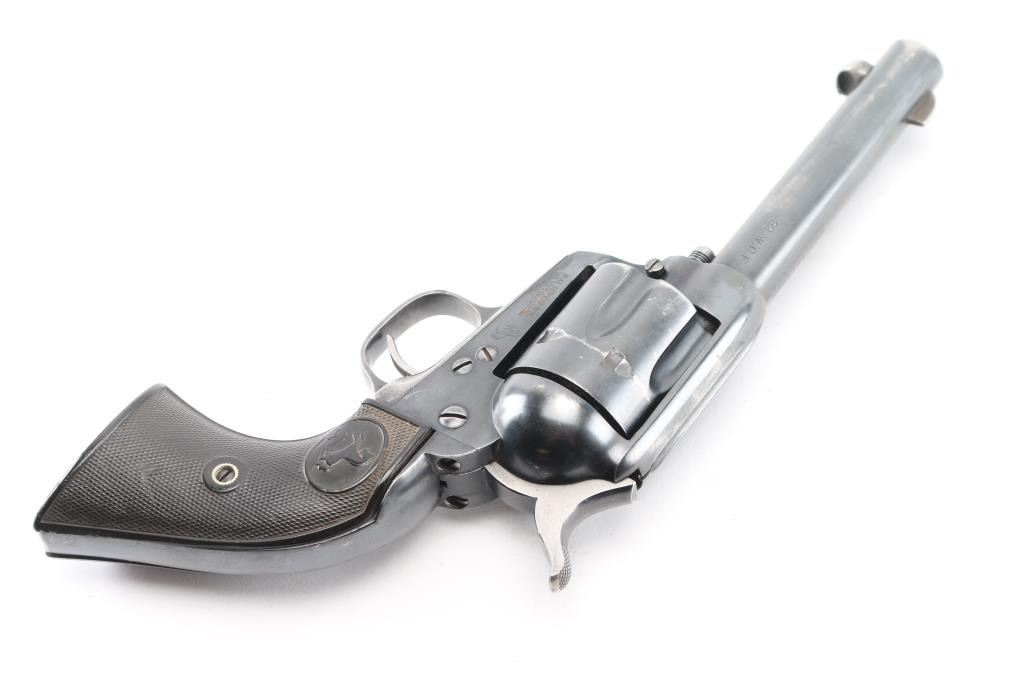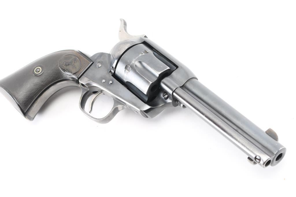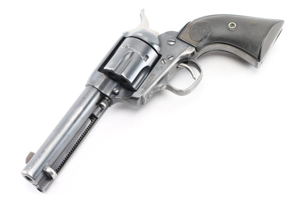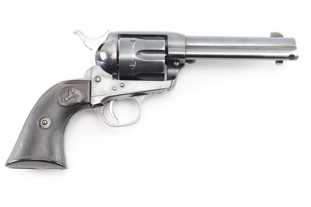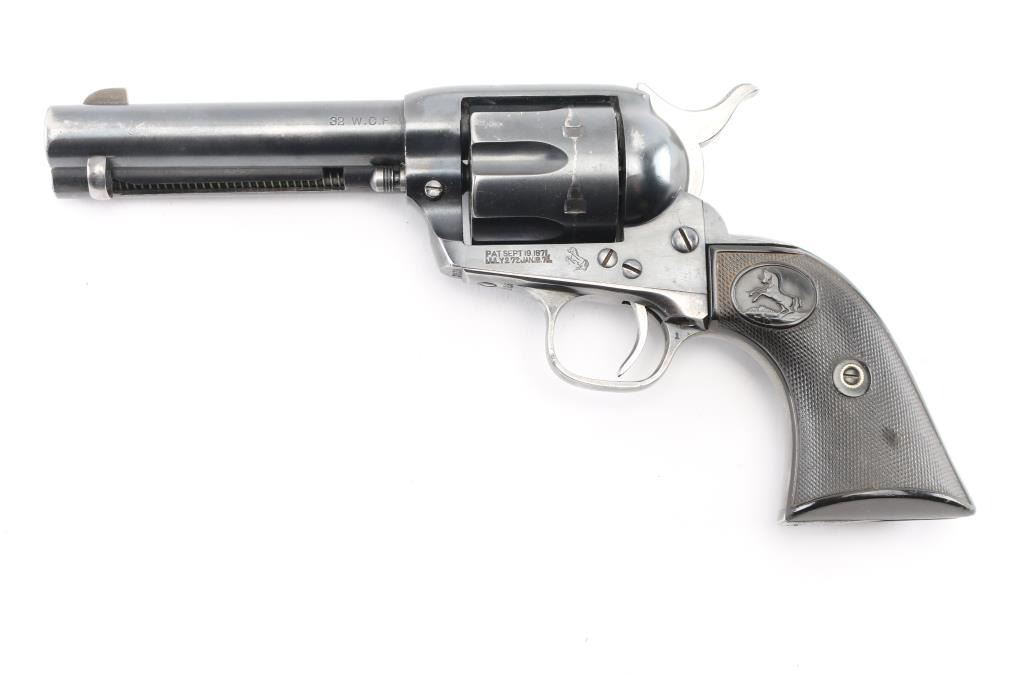 The classic American Colt SAA 1st Generation smokeless chambered in .32 W.C.F. (32-20). Manufactured 1917. Blued metal finish, with black, hard rubber checkered grips with Rampant Colt. 4 3/4" barrel, with open iron sights. V-notched frame. Two line Colt address on top of barrel. Caliber on left side of barrel. 'VP' proof along with "1"on left triggerguard. Patent dates, and rampant Colt on left frame. Serial numbers match on frame, triggerguard, and backstrap. Numbers, and markings are clear. Assembly number is clear on the loading gate. (104). Cylinder chambers appear excellent. Bore appears very good/bright with strong rifling. Original blued finish is about 75%, with minor scratches, muzzle/edge wear, handling wear on the barrel triggerguard, and straps. Correct ejector, and cylinder pin for this model. Grips are sound but worn smooth. Action is crisp/tight. NRA Condition-Good. C&R Firearm.