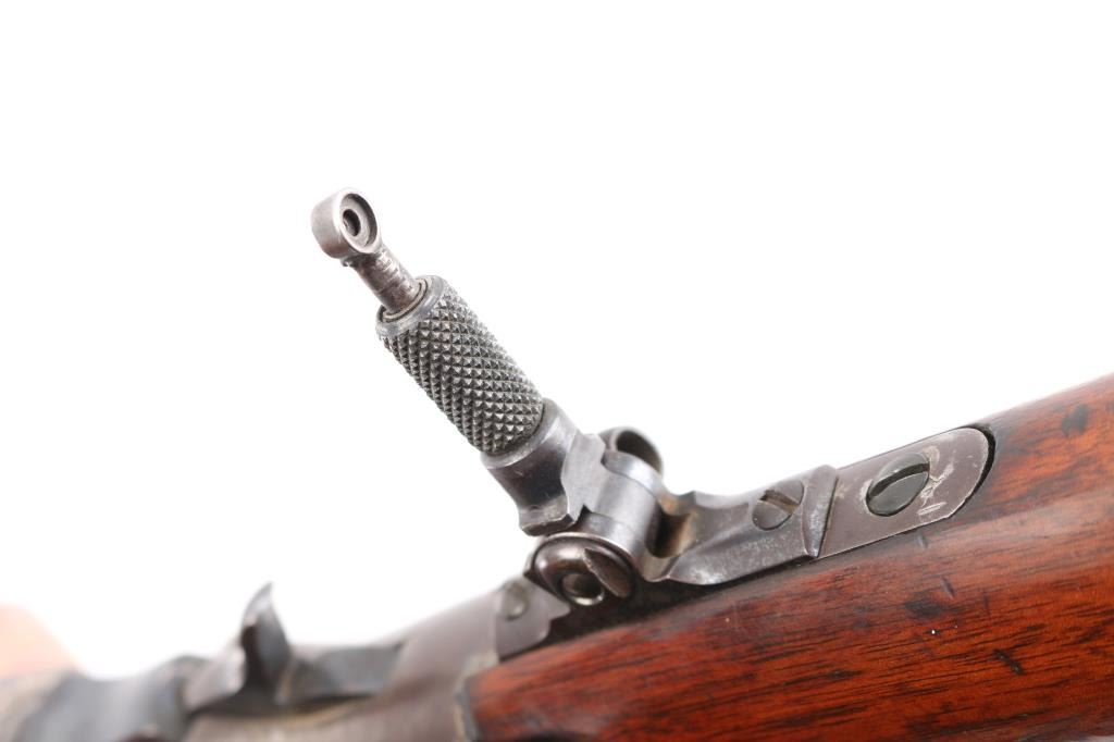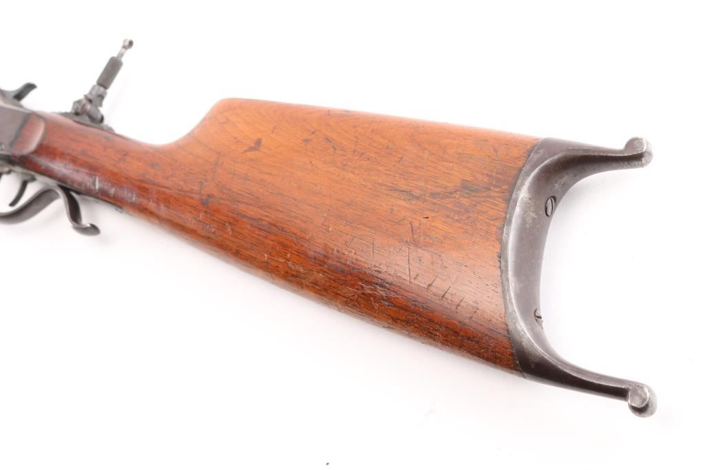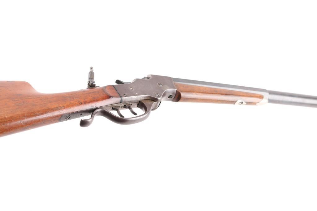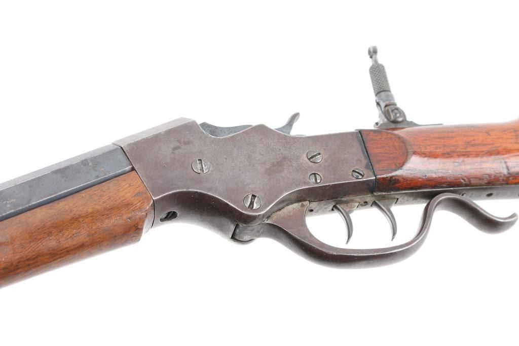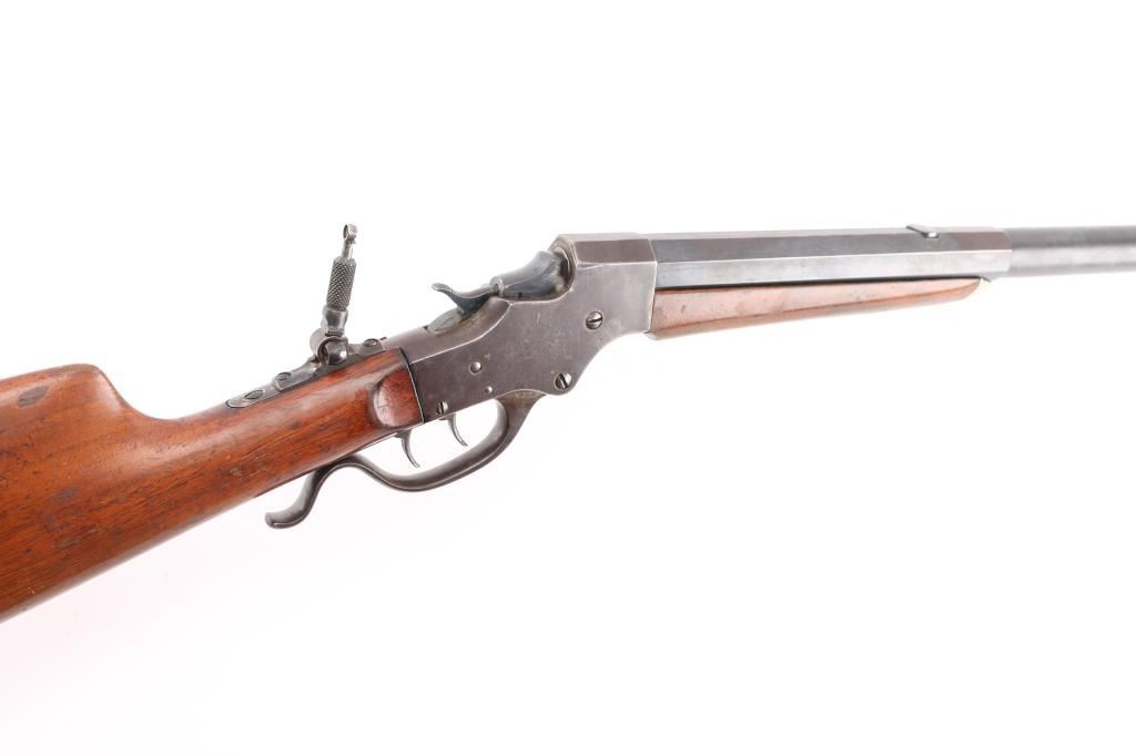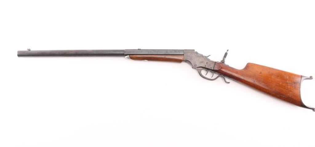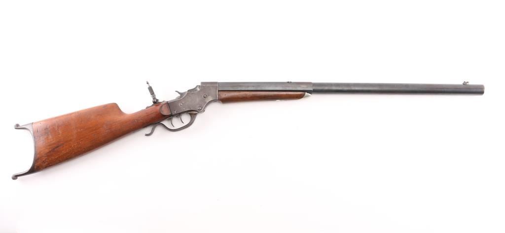 'Range Model' Vintage single-shot falling-block rifle chambered in .38-55 Winchester, manufactured in Chicopee Falls, MA circa 1896-1916. Features a blued 25" No. 1 weight half-octagon barrel, beach front sight, blank inserted in the rear sight dovetail, Lyman adjustable dual-aperture tang sight, double set triggers, case hardened frame, curved lever, checkered hammer spur, smooth walnut forend with metal tip and straight grip shoulder stock with swiss style buttplate. The barrel retains approximately 65% of it's blued finish showing areas of heavy wear turning to patina and some light scattered dark surface rust. The receiver has turned to an even aged brown patina with trace amounts of case coloring in the protected areas. Action is crisp, bore is very good+ and wood stocks are very good showing an old crack/repair at the wrist. Condition is NRA Good to Very Good. ***C&R Firearm***
