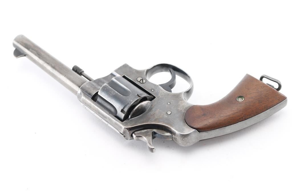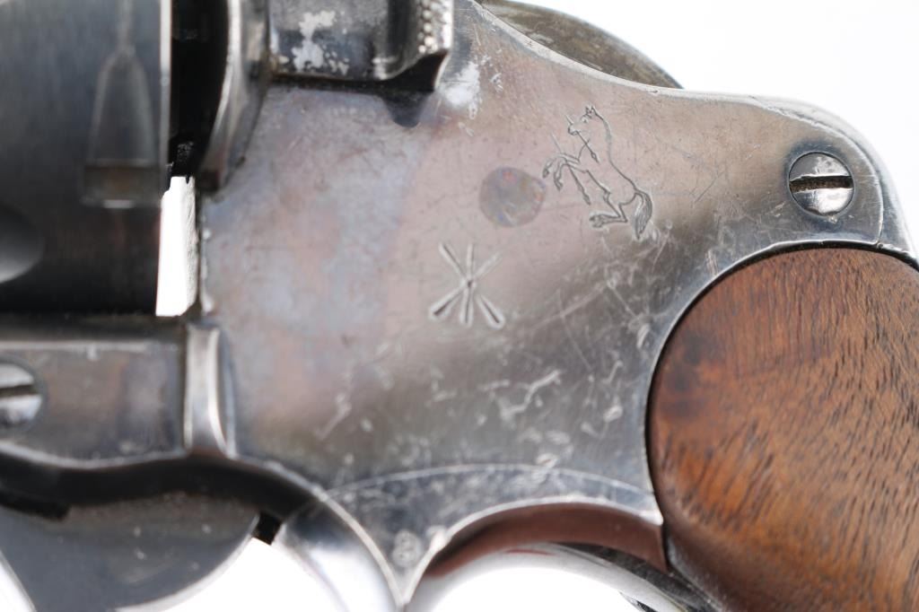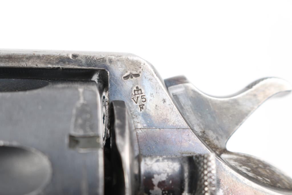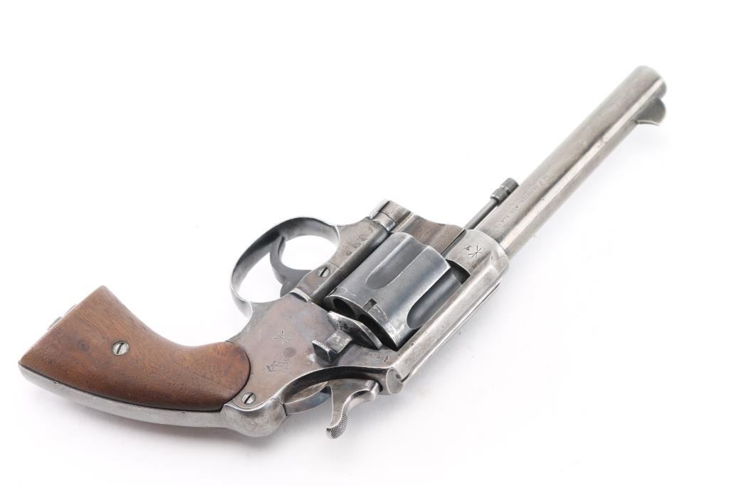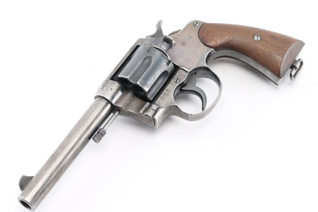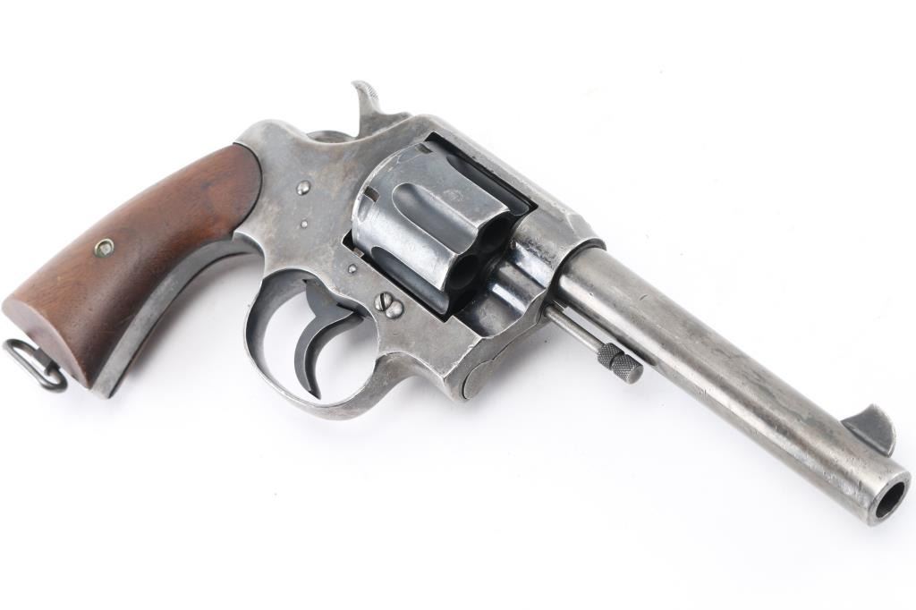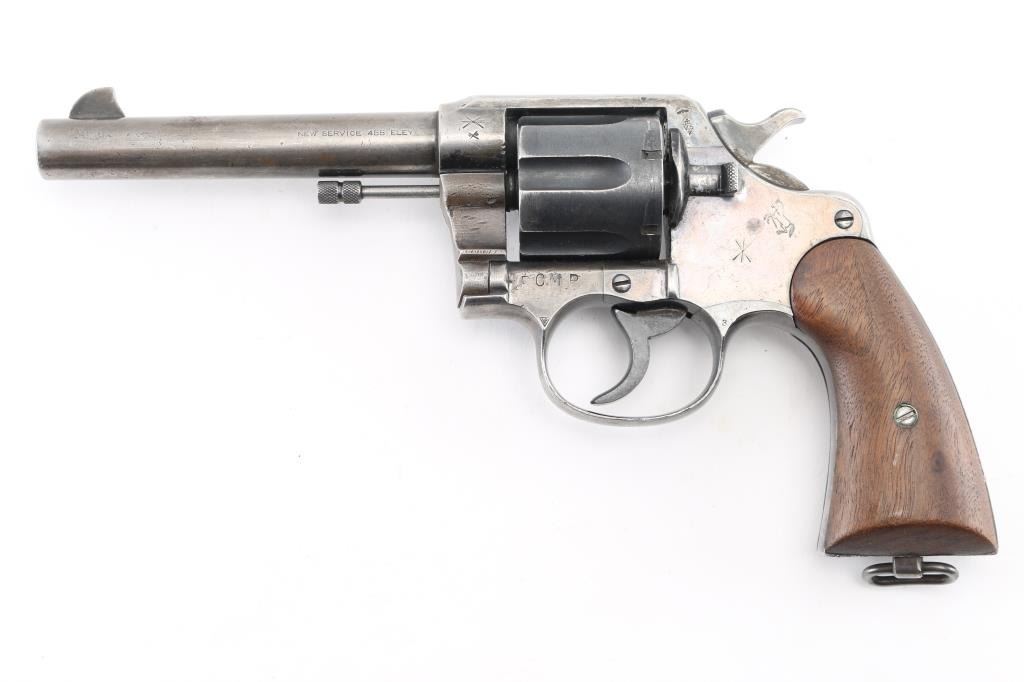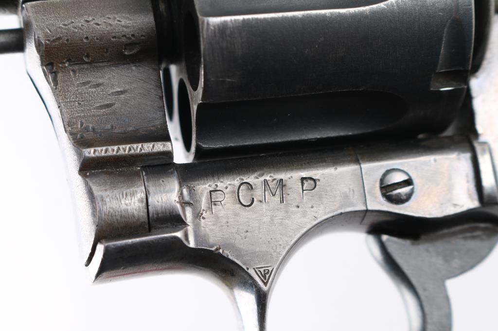 WW1 era Colt New Service revolver issued to the Royal Canadian Mounted Police, who used the New Service in 455 Webley and 45 Colt through much of the early 20th century, including into the 1940s. Manufactured 1915. Blade front and notch rear sights, the two-line Hartford address and patent dates on top of the barrel, "NEW SERVICE .455 Eley" on the left side of the barrel, "VP" and "3" on the left side of the trigger guard and the Rampant Colt on the side plate. The knurled hammer, cylinder catch and smooth trigger are finished in a dark royal blue, "rampant Colt" on left frame. Fitted with a lanyard swivel. Also stamped on the left frame is Canadian proofs, the broad arrow, "V5F" under crown. crossed flags, etc. "RCMP" is stamped on the frame beneath the cylinder. 5.5" barrel. blue finish, smooth wood grips, fixed sights. Bore is good, bright, with some light scattered pitting, grips are very good, action is crisp/tight, blue is about 40% with handling loss, scratches, holster wear. NRA Condition-Good. C&R Firearm.