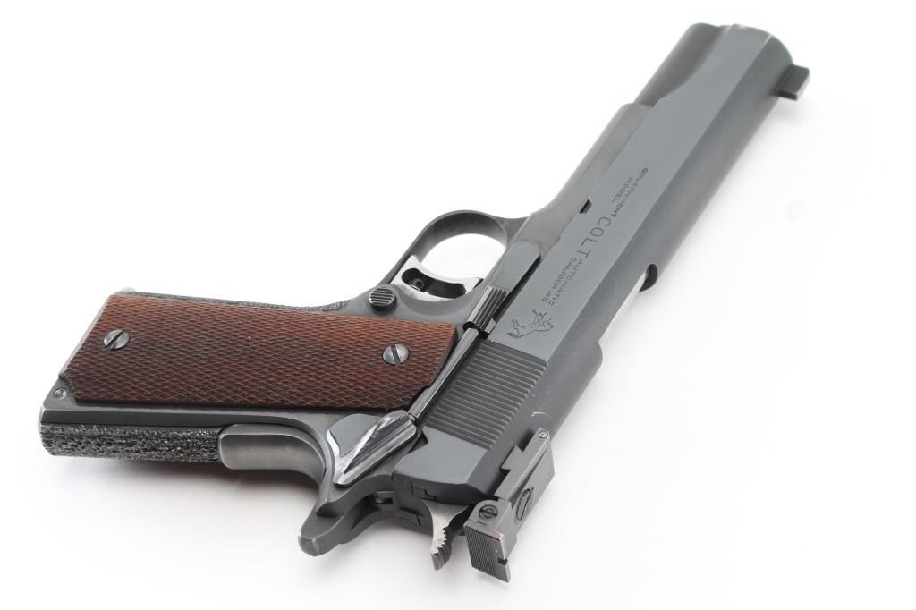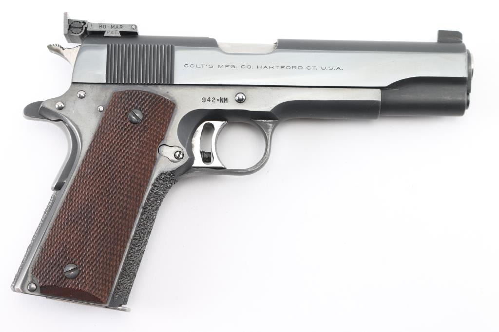 'Gold Cup National Match' semiautomatic target pistol manufactured circa 1957. Reblued slide marked "Government Model', possibly a replacement slide. Features 5" barrel, target sights with adjustable Bo-Mar rear sight, heavy stippling on front strap and on flat mainspring housing, serrated skeletonized trigger with over-travel adjustment, serrated spur hammer, checkered wood grips. Bore is very good bright condition. Retains 90% finish with edge losses, handling marks. Loss of edge contours and some shallowness to markings from heavy buffing. Grips are very good. Action is sound. Includes one magazine. Condition is NRA Very Good++ as reblued *** C&R Firearm ***