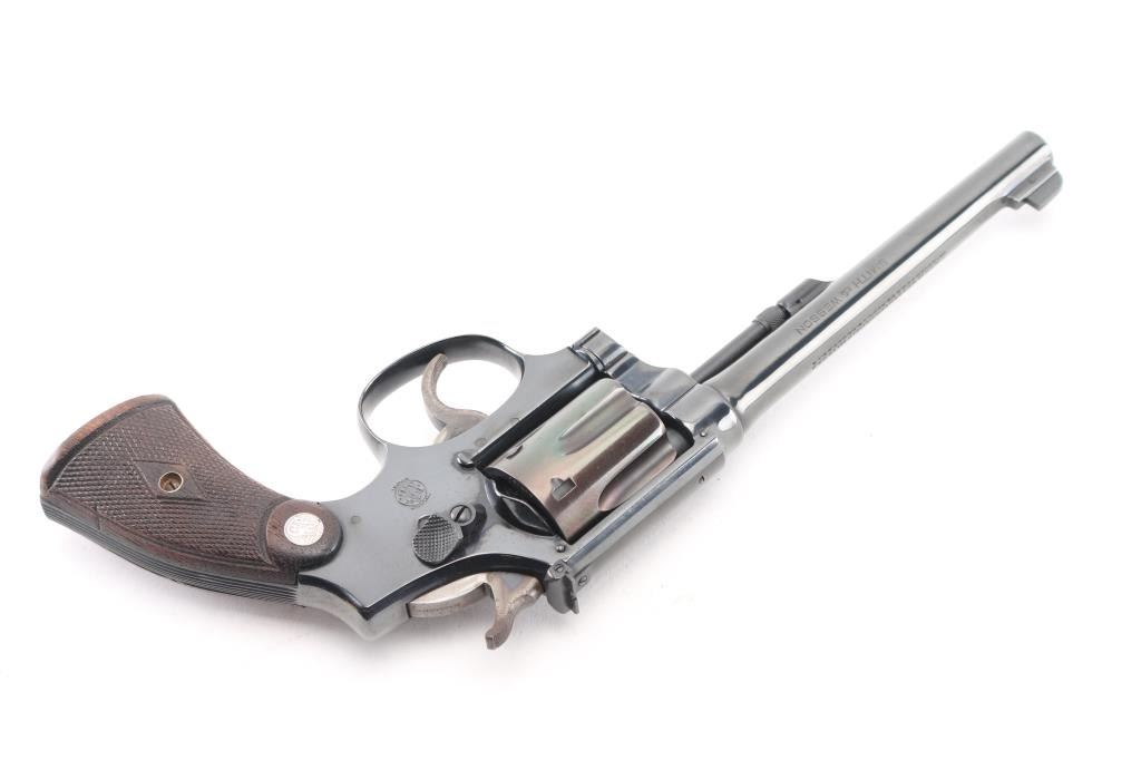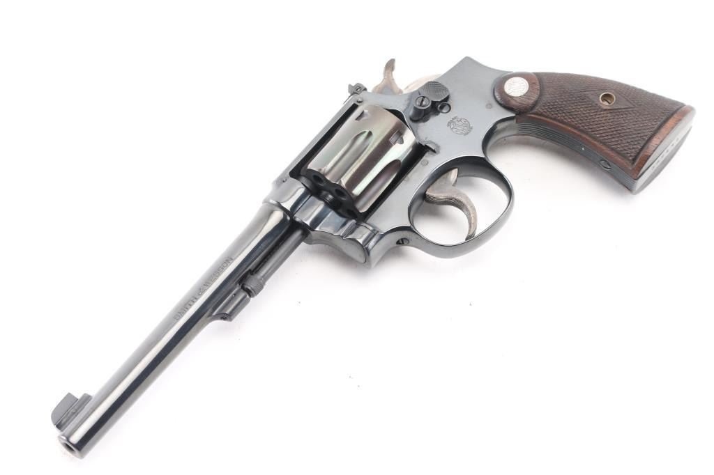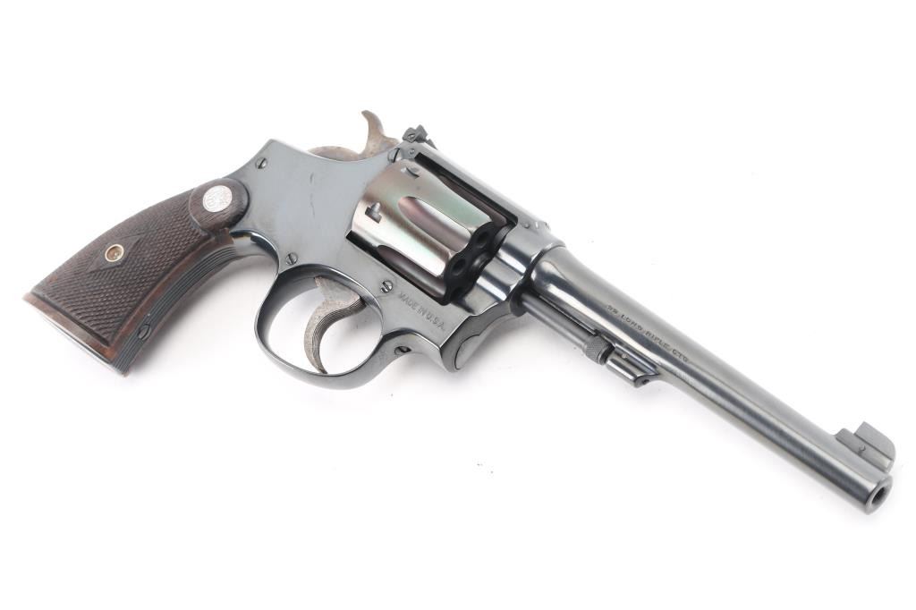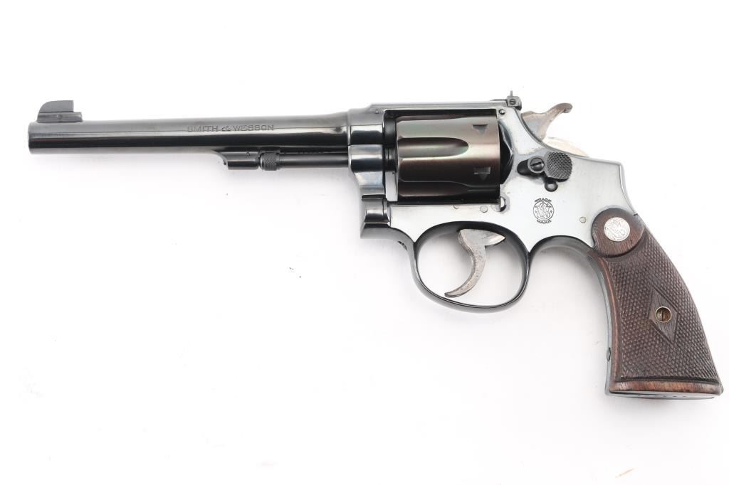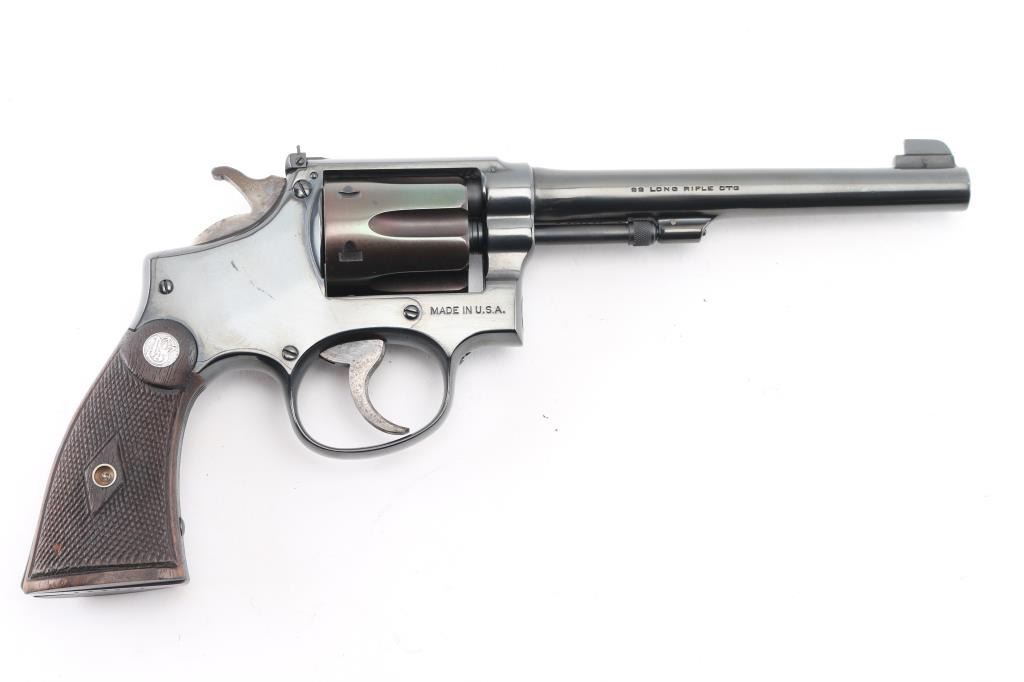 SN: 639307 Refinished. Vintage American made 6 shot revolver chambered for .22 Long Rifle ammunition, manufactured circa 1931-1940. This is an early model with a 6" pinned barrel, a pinned Patridge front sight, a K target frame, floating firing pin, with flat faced hammer, Circassian walnut grips with silver S&W medallions. It has a serrated trigger, & straps, knurled hammer spur, fluted cylinder, and a non-shrouded extractor rod. Numbers match. Re-bled finish is excellent, cylinder is plum colored, marking are a little shallow due to refinish, grips are very good, action is smooth, bore is excellent/bright. NRA Condition-Excellent as Restored. C&R Firearm.