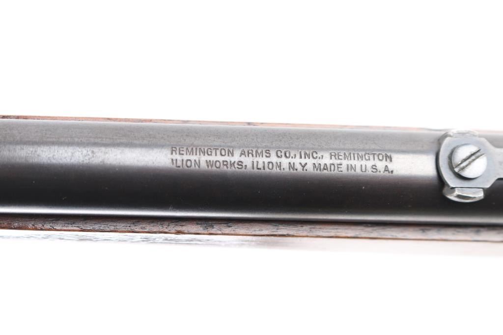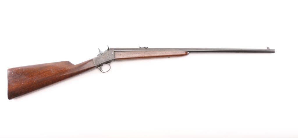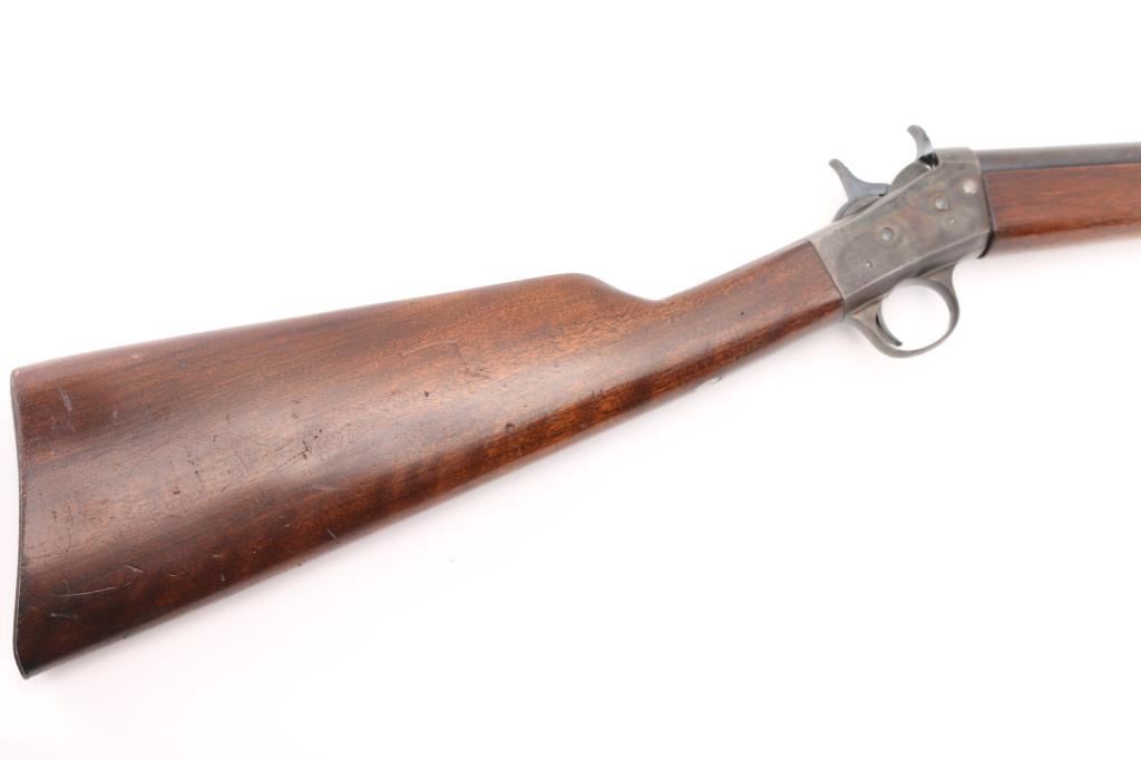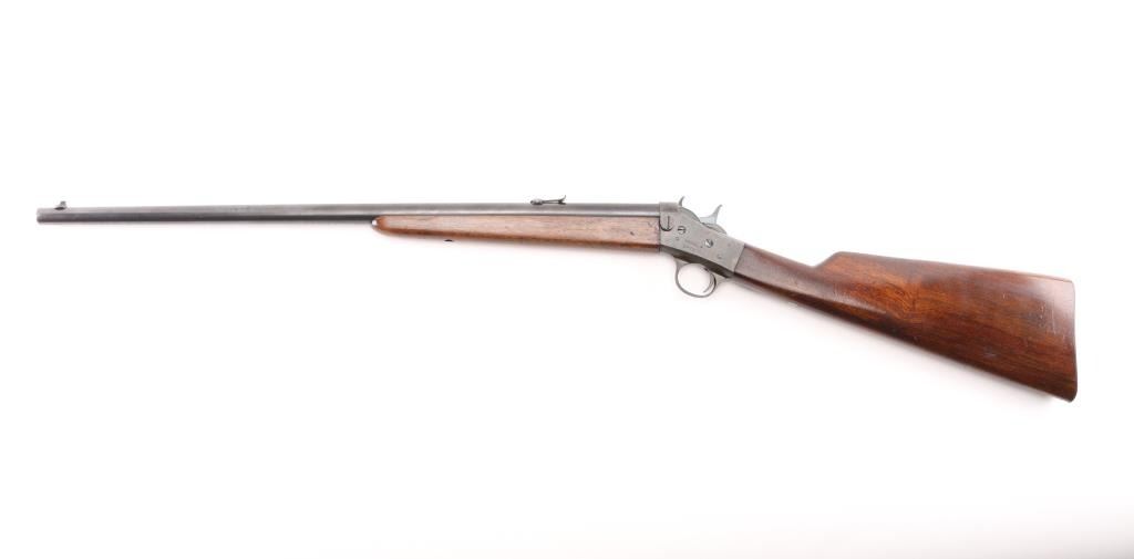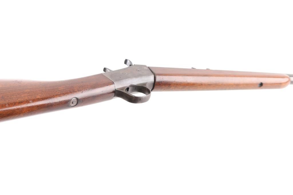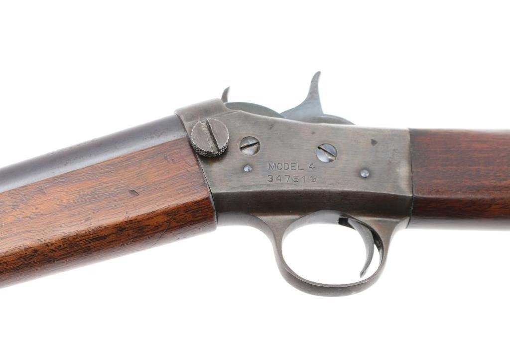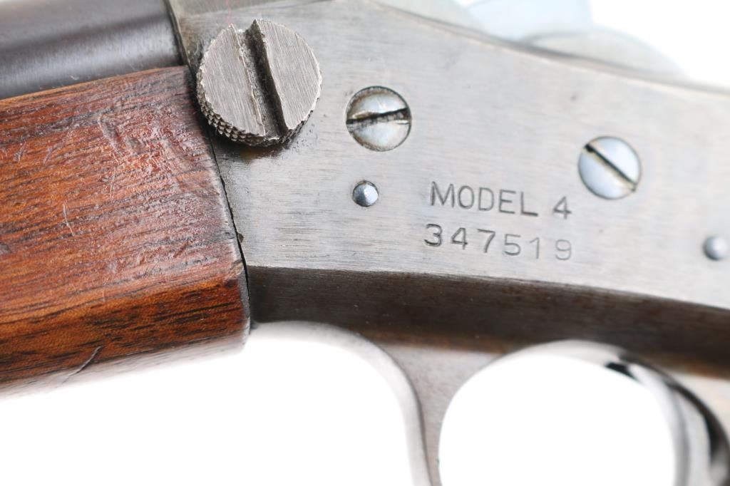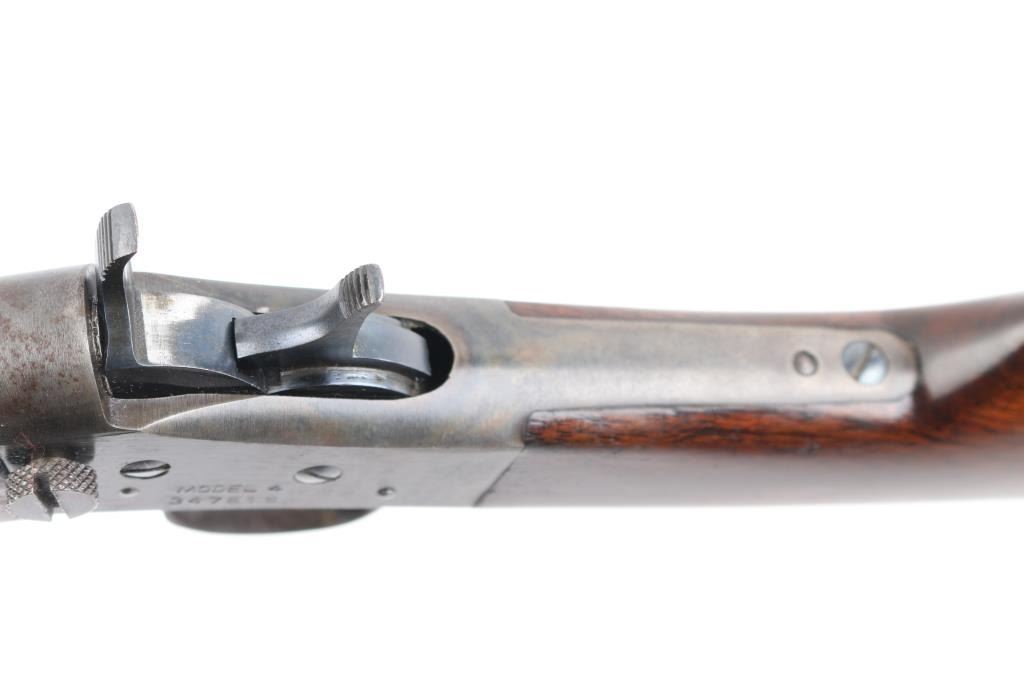 SN: 347519 Vintage take down single shot rolling-block rifle. Manufactured circa 1926-1933 based on the take down screw on left side of receiver. Often called a "No. 4", this one is clearly stamped "MODEL 4" on the left side of the receiver. Features blued barrel and small parts, case hardened receiver, 22.5" barrel with dovetailed front blade and adjustable rear sights, smooth walnut forend & straight wristed shoulder stock, smooth metal buttplate marked "UMC". Bore is very good condition. Metal retains 90% blued finish, beginning to drift towards a plum tone, showing bare metal on breech block, near muzzle. Case colors are good on receiver, showing various colors, a bit muted. Wood is very good, varnished, with handling marks. Markings are sharp edged. Action is crisp. Condition is NRA Very Good++ *** C&R Firearm ***