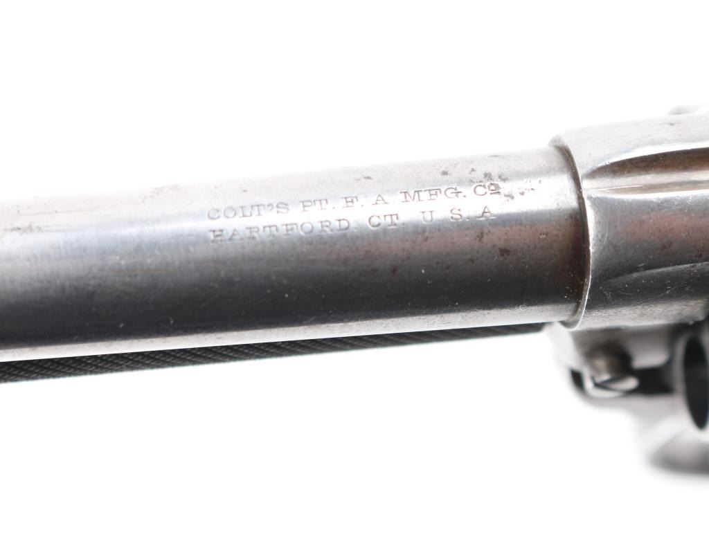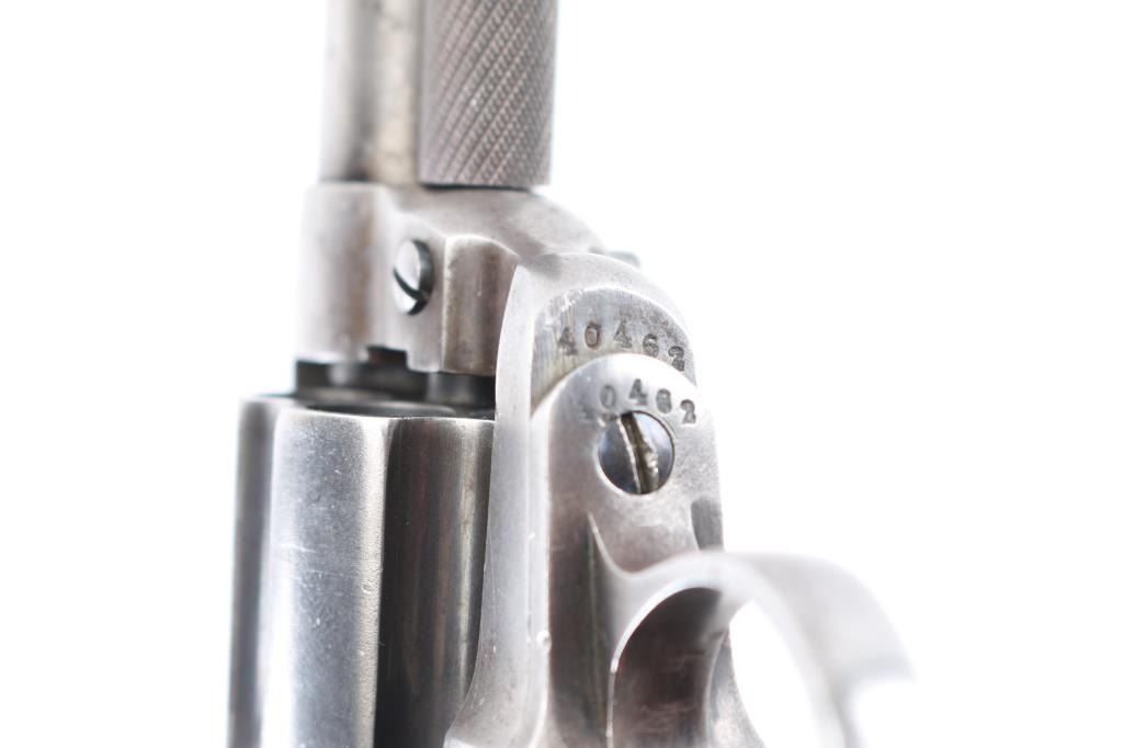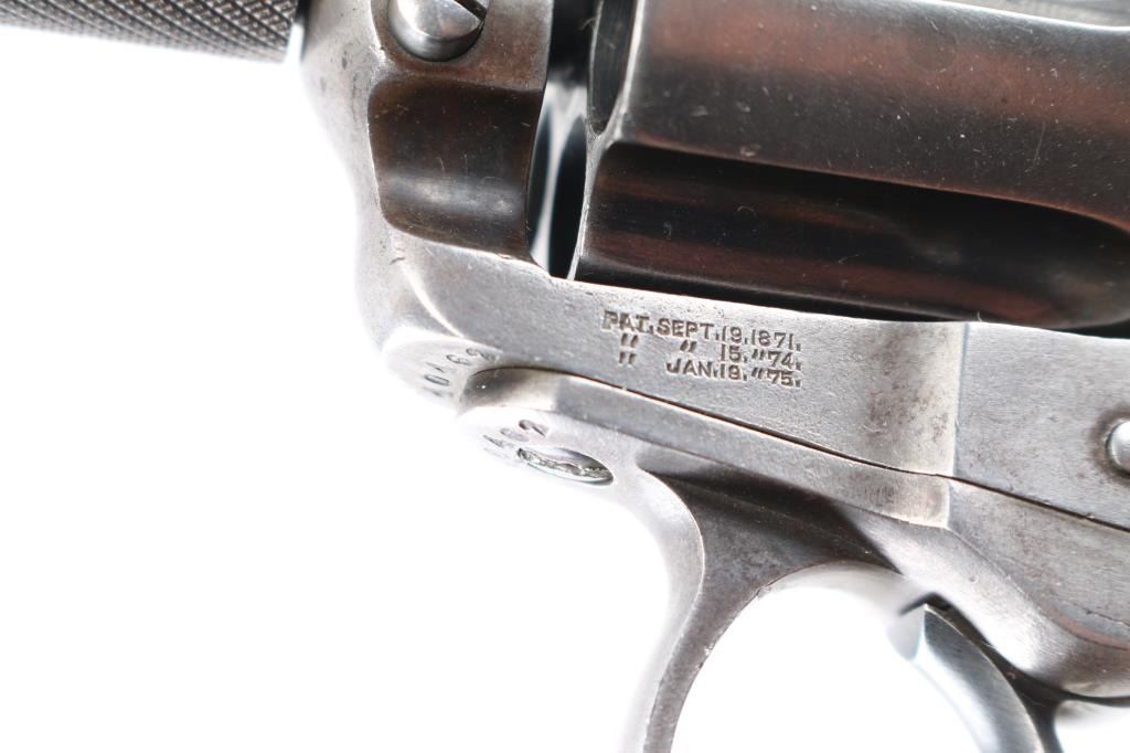 'Storekeeper's Model' Double/single action revolver manufactured circa 1883. Features blued finish, checkered wood grips, bird's head grip frame, 3.5" barrel, no ejector rod, fixed sights. Bore is bright/good with a couple of areas of very light pitting, good rifling. Charge holes are good condition, visible residue from firing. Retains 10% dark blue finish at the top of the back strap, the rest is in the white. The cylinder pin is barrel length, knurled, we believe custom, it looks period done, looks great. Grips are fair condition, showing smoothing, scratches/dents. Numbers on triggerguard and back strap. Two line barrel address and patent markings are readable. Action is crisp, good lock-up. Antique Firearm