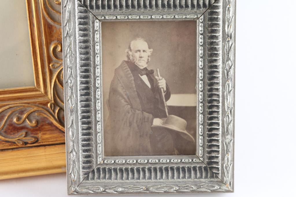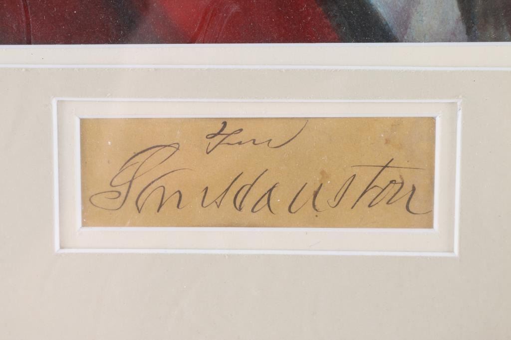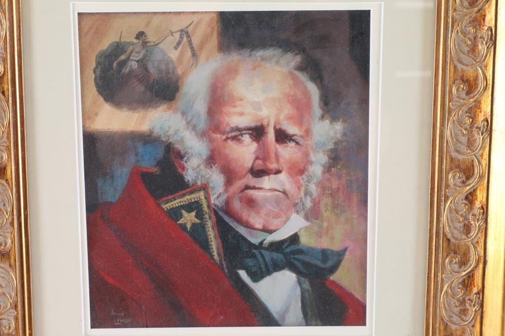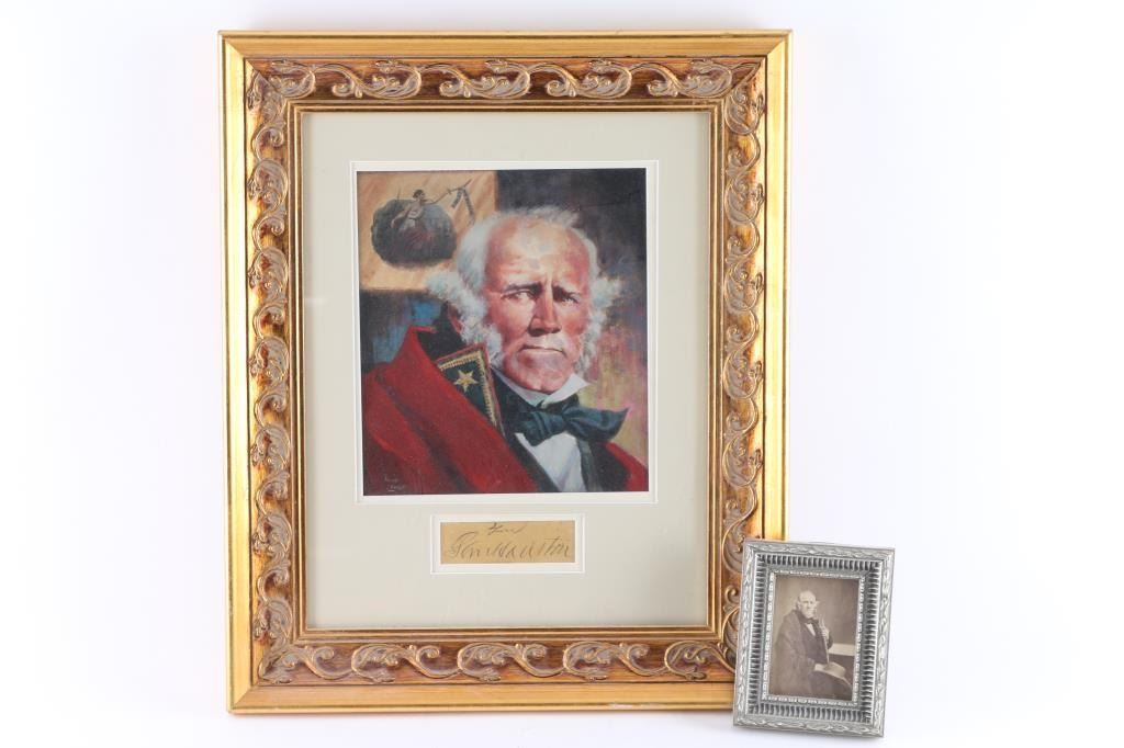 Samuel "Sam" Houston, 1793–1863. President of the Republic of Texas, 1836–1838, 1841–1844; Governor of Texas, 1859–1861; United States Senator from Texas, 1846–1859. This is a beautiful 17 1/2" x 14 1/2" framed color print of Houston in Uniform, below is his signature, clipped in his characteristic florid style. Excellent Condition. Also included is a vintage Carte De Visite of Houston as Senator in 1861, sitting with cane, & hat in hands by American photographer Charles DeForest Fredricks, (1823-1894), marked on back. Framed. Excellent condition.