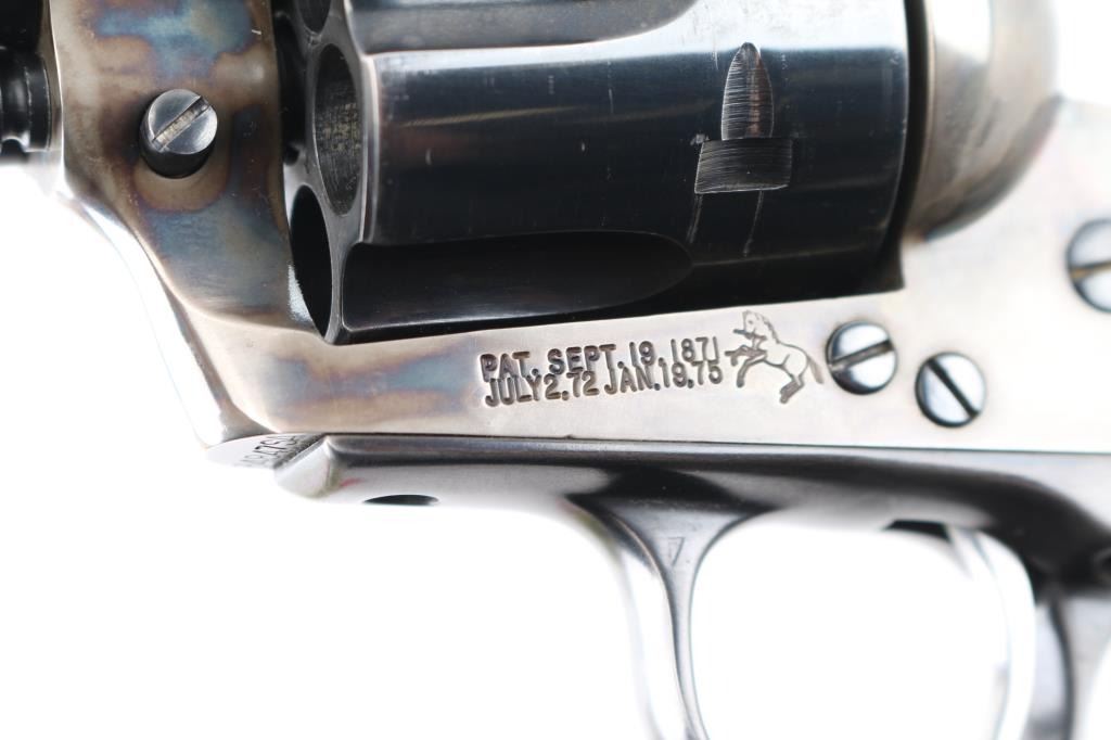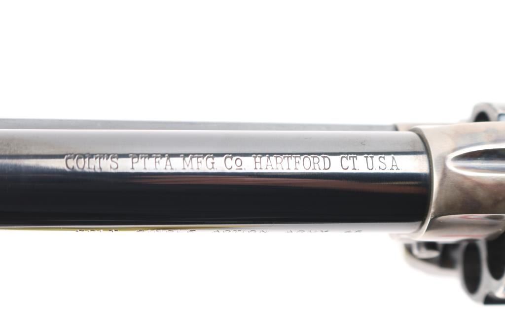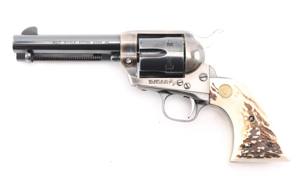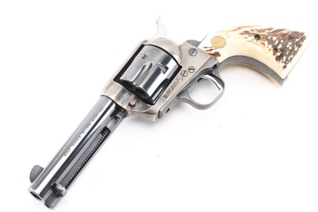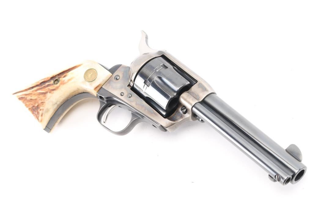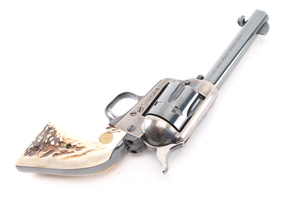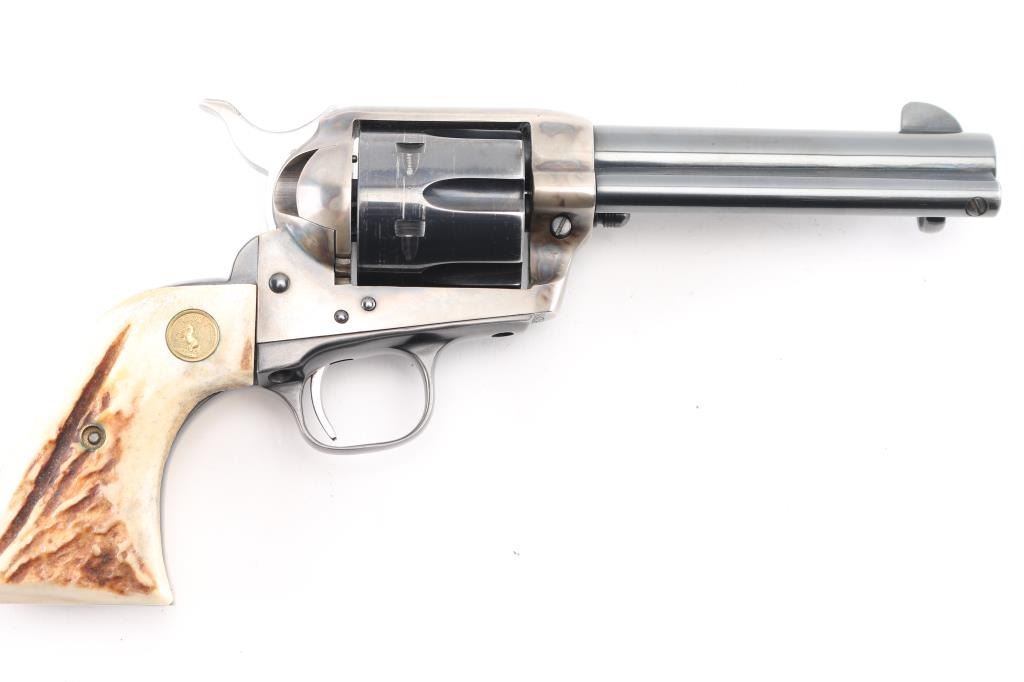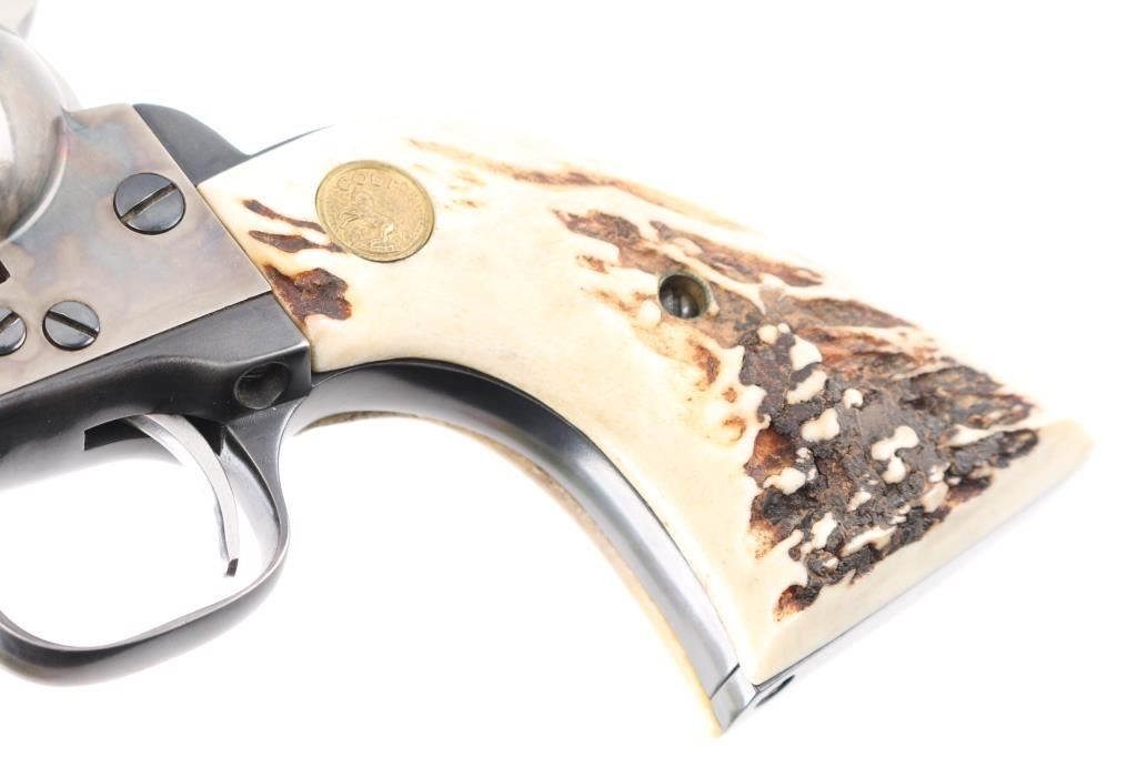 Single action revolver manufactured circa 1977 (2nd year of production for the Third Generation SAA). Features 4-3/4" barrel, blued & case hardened finish, stag grips with Colt medallions, polished sides on hammer. Serial number repeated on backstrap & triggerguard (under grips). Bore is excellent/bright. Retains 85% blue with heavy drag line around cylinder, otherwise light handling marks and edge wear. Case color shows good contrasts between light & dark grays, very good condition. Grips are very good condition. Action is smooth with tight lock-up, all four clicks. Condition is NRA Very Good++ *** Modern Firearm ***