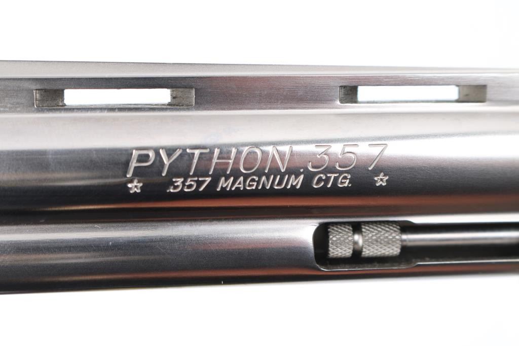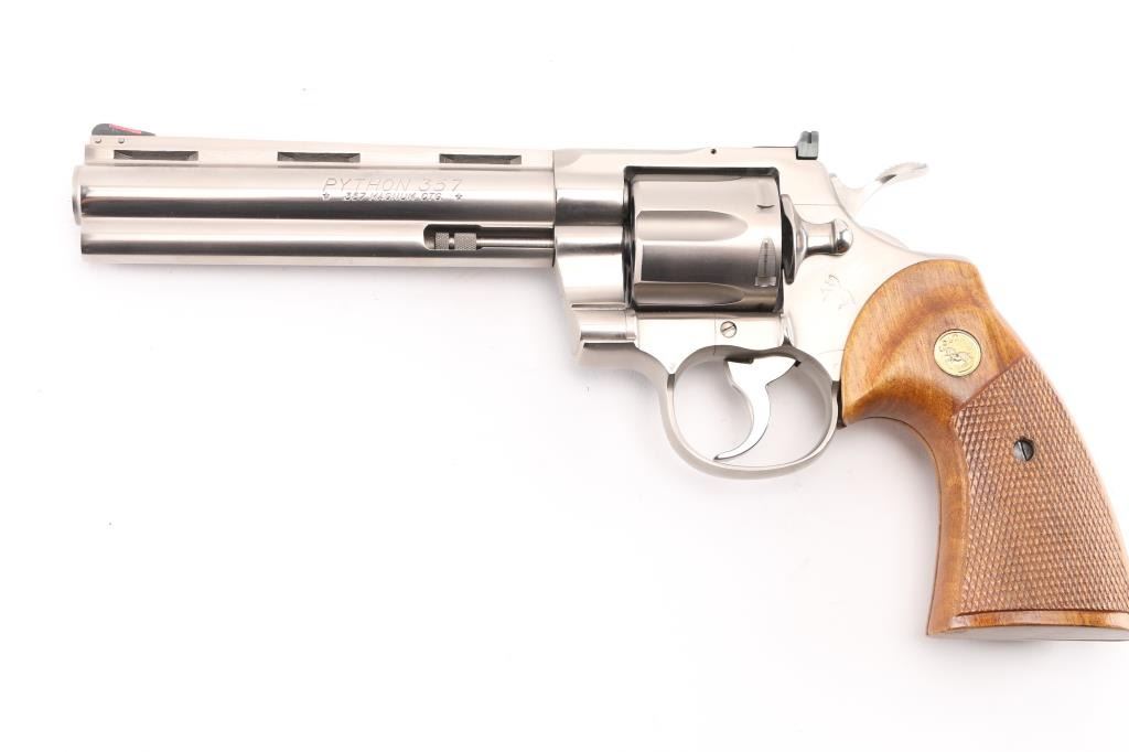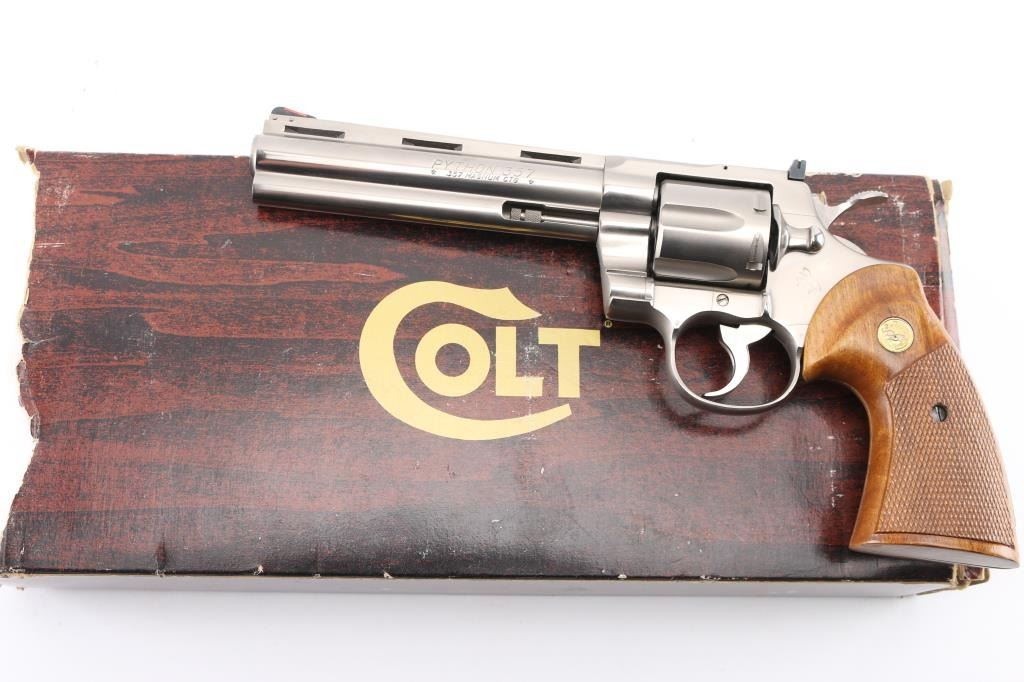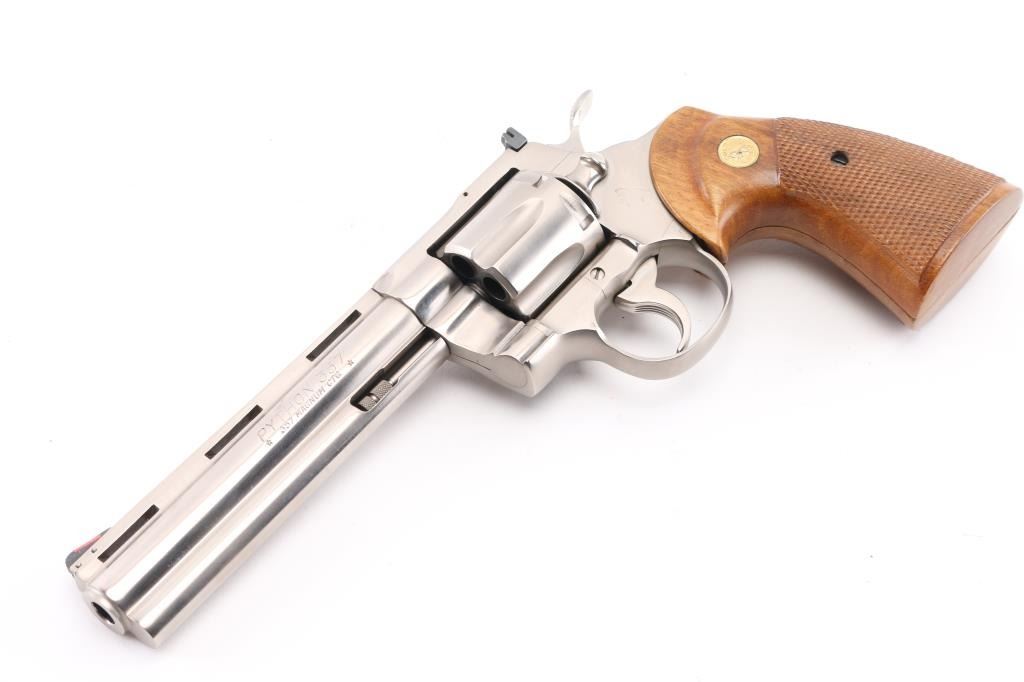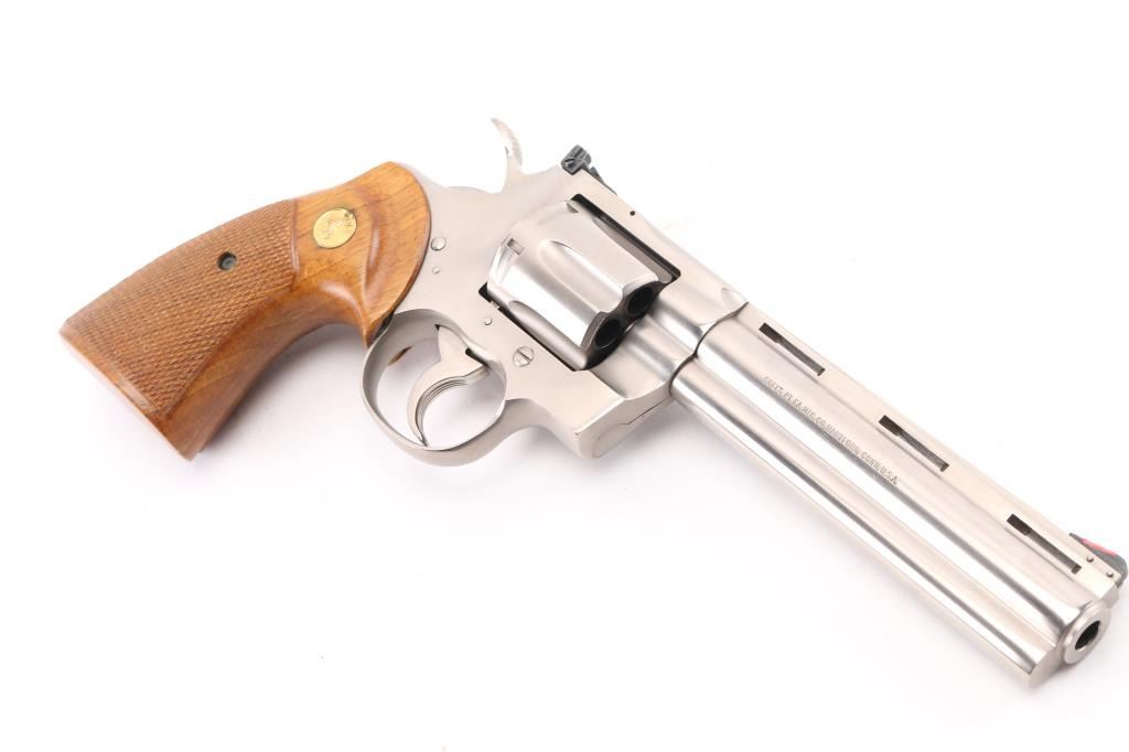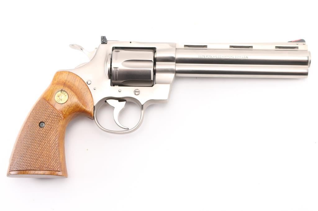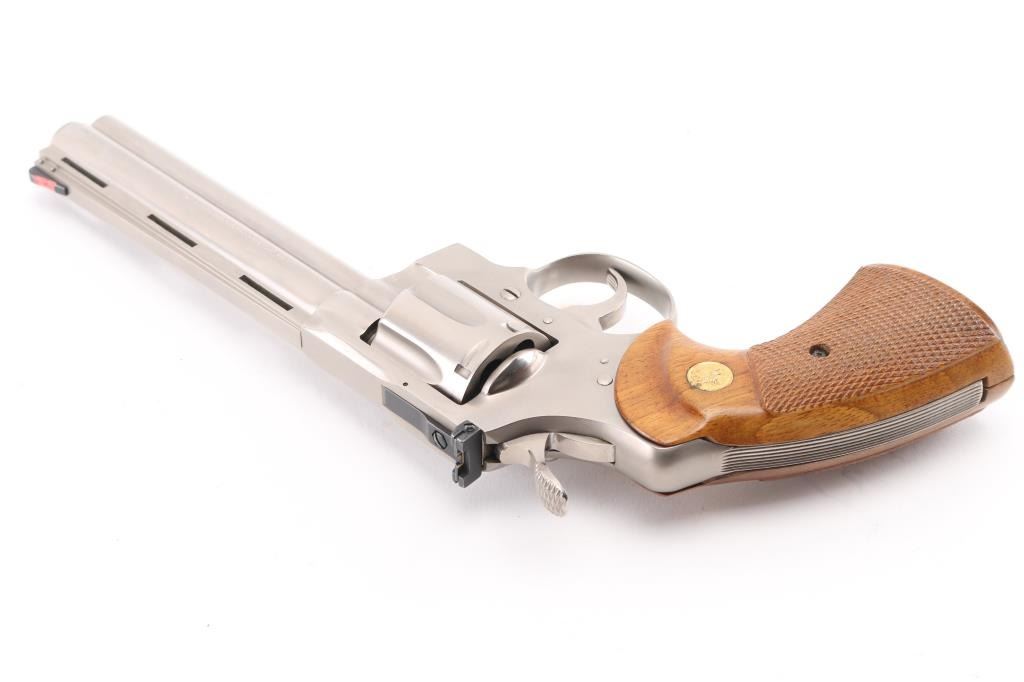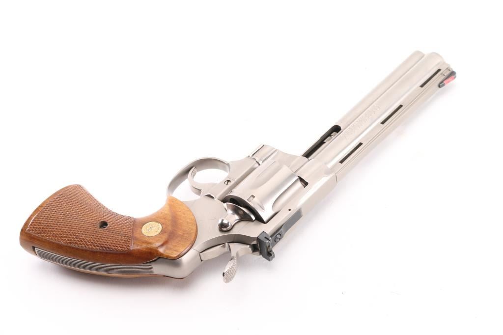 Double/single action revolver manufactured circa 1981. Features electroless nickel finish, checkered wood target type grips with gold color Colt medallions, 6" barrel with full length underlug, adjustable sights, grooved narrow trigger, checkered wide spur hammer. Bore is excellent. Finish is excellent, with few minor blemishes, several bright spots one sharp edges from rubbing. Grips are very good, have been modified to fit tightly to frame, with visible tiny gaps, backstrap slightly proud. Action is light and very smooth, locks up tight. Includes factory styrofoam box with fair condition wood grain cardboard sleeve and matching end label. Condition is NRA Very Good to Excellent *** Modern Firearm ***