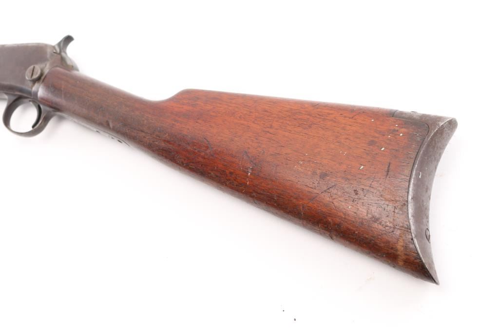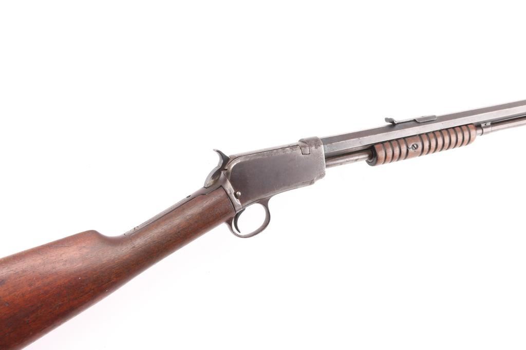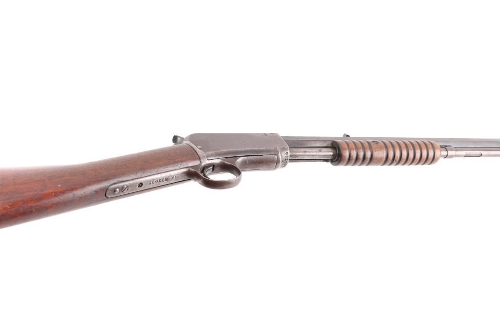 Vintage pump action rimfire rifle manufactured circa 1919. Features 24" octagonal barrel, dovetailed blade front & adjustable rear sights, 3/4 length magazine tube under barrel, exposed hammer, "corn cob" walnut pump handle, smooth walnut shoulder stock, crescent buttplate, take down screw on receiver left side. Missing screw from top of tang. Two holes in top of breech bolt. Bore is fair condition, retaining rifling, showing moderate pitting and erosion. Metal surfaces show full coverage of finish, faded to a deep brown color, patina spots throughout, edge losses and rubbing wear, small pits in many places. Wood is good, stock a bit loose, dents & sctraches throughout, oil staining at wrist. Markings are crisp. Lower tang numbered "631691". Condition is NRA Good *** C&R Firearm ***