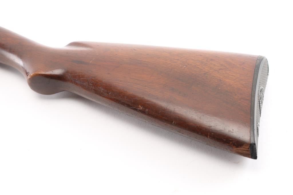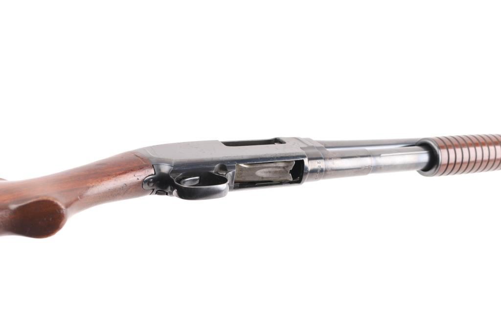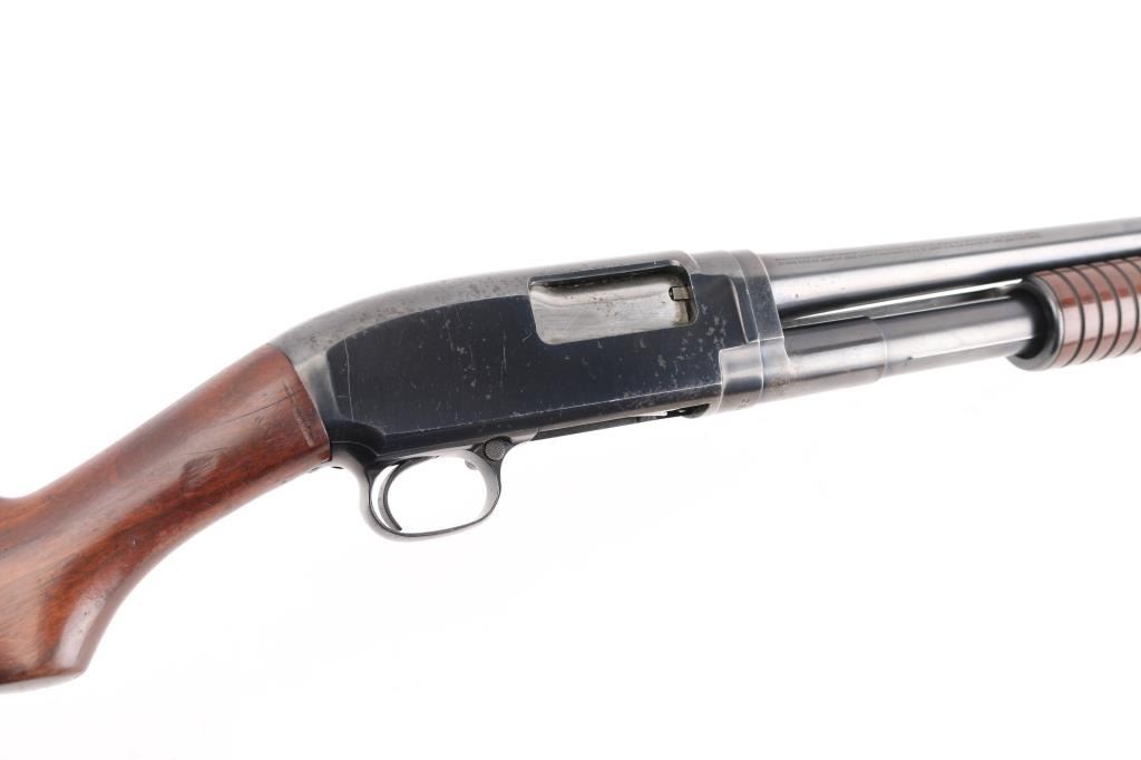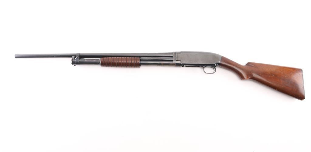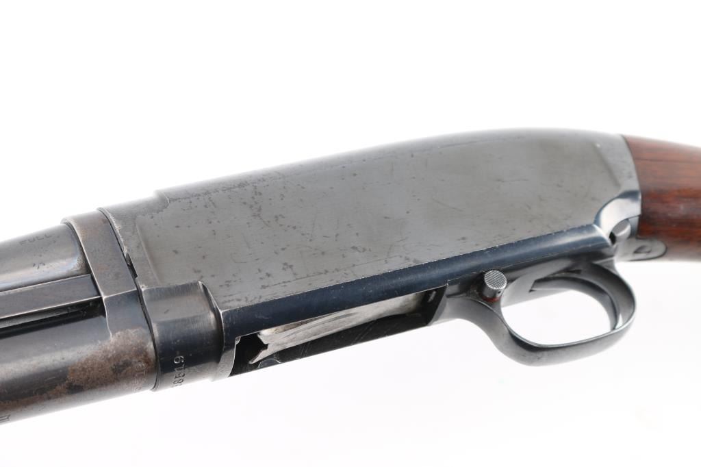 Vintage take down pump action shotgun manufactured circa 19212. Features 25" round barrel, barrel marked "FULL" choke, 2 3/4" chamber, steel front bead, blued finish, walnut stock & pump handle, lined pump handle, factory plastic butt plate. (13 1/2" LOP), push button safety. Bore is excellent/bright. Retains 70% blue with friction wear on the tube, edge wear. minor scratches, very light scattered pin-prick pitting on the receiver, area of heavier pitting on the underside of the barrel extension. Wood is good/sound with minor dents and small scratches, there is a 3/4" chip out of the heel which also took a small chip out of the factory butt plate. Numbers match on receiver & extension. NRA Condition Good. C&R Firearm.