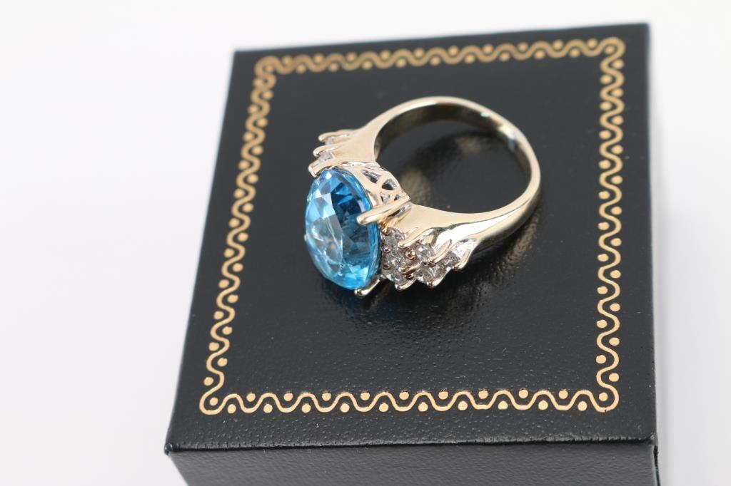 Swiss Blue Topaz oval center stone surrounded by diamonds set 14K yellow gold size 6.