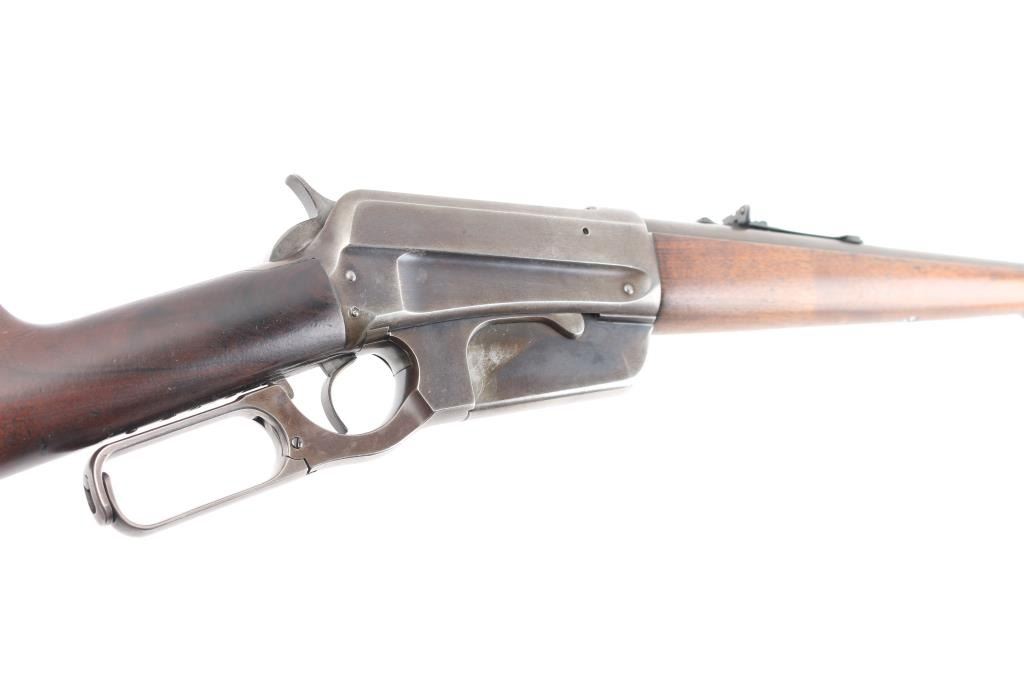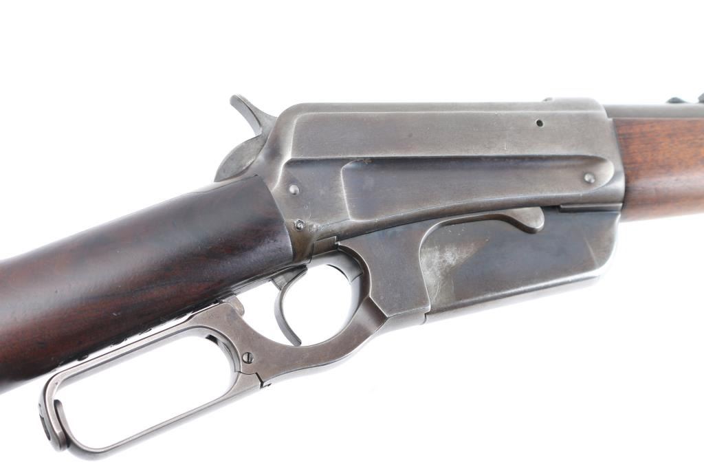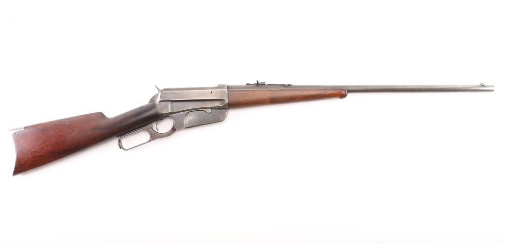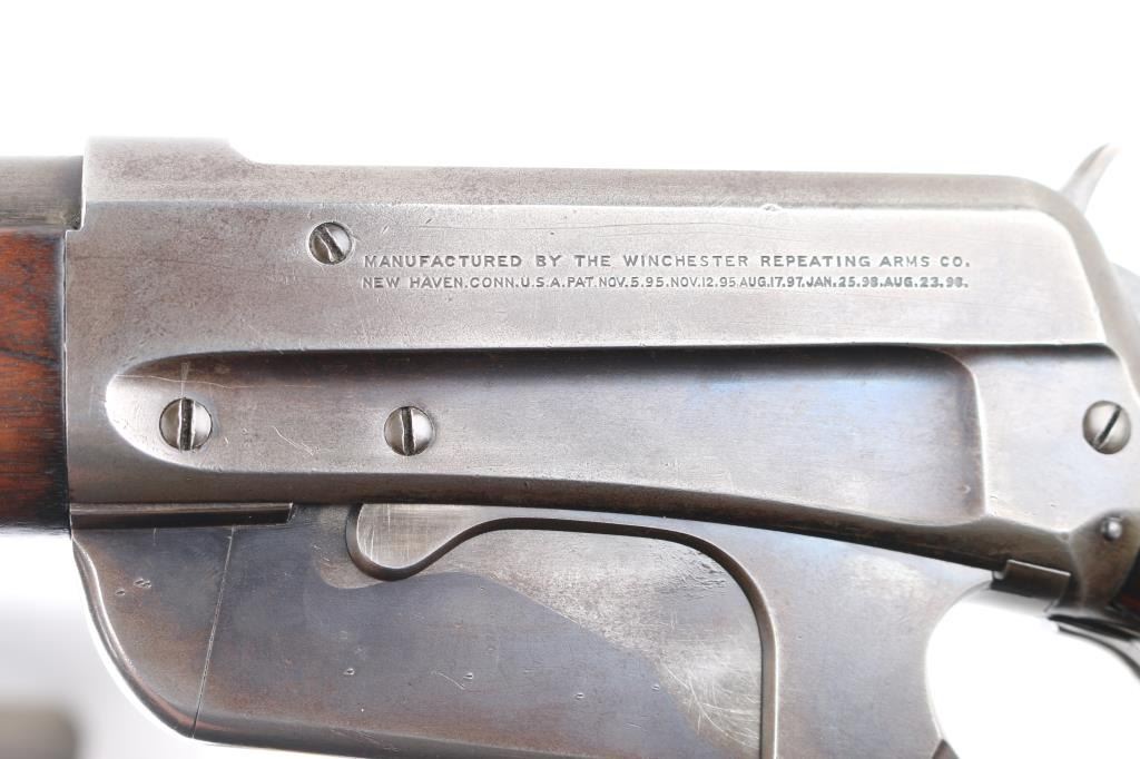 'Sporting Rifle' manufactured circa 1902. Features blued finish, 24" barrel, dovetailed blade blade front & adjustable sporting rear sights, vertical box magazine, walnut stocks, straight grip, steel crescent buttplate, schnabel tip forend with fancy ebony colored insert. Bore is good or better condition, some darkness in grooves, strong rifling, visible tiny pits. Retains 10% original finish, most metal showing a gray toned smooth finish, original color retained in some protected areas and at rear sight, thinning or bare metal where moving parts rub, edge losses. Some older pits or dents on barrel. Buttplate is mostly bare dull silver colored metal with some areas of darker gray color. Wood is varnished, very good overall, looks cleaned or lightly sanded, oil staining visible where wood fits against metal or at wrist where handled, small dents throughout. Action is smooth. Markings are sharp. Condition is NRA Good++ *** C&R Firearm ***