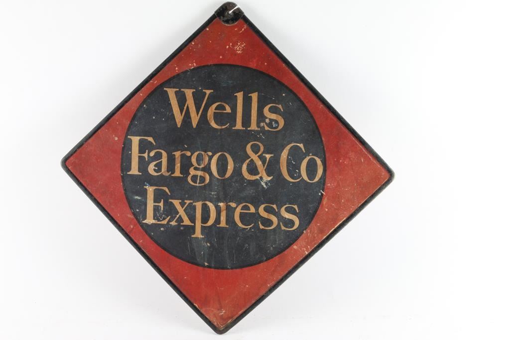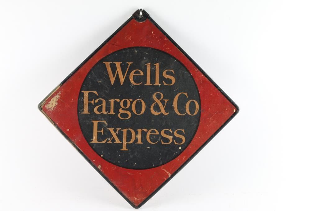 Wells Fargo & Co Express Sign, measures 14x14" with double sided cardboard on a black painted metal frame with mounting hole at the top. Red background with white lettering "WELLS/FARGO & CO/EXPRESS" in a black circle.