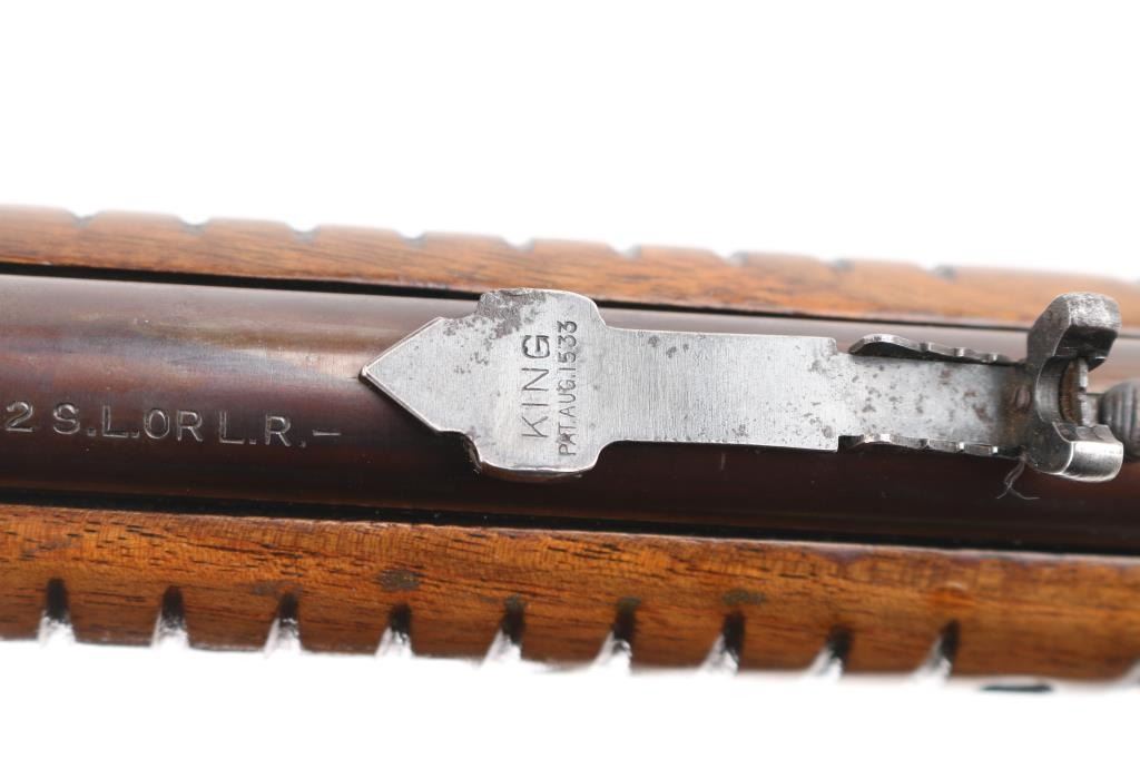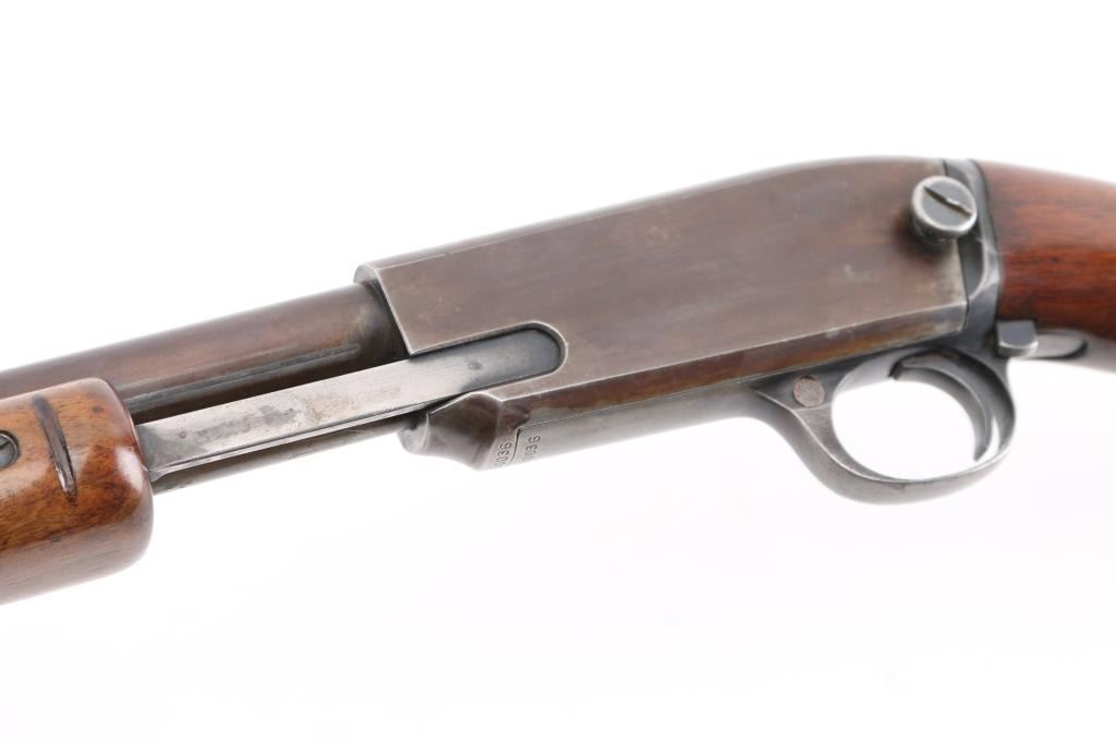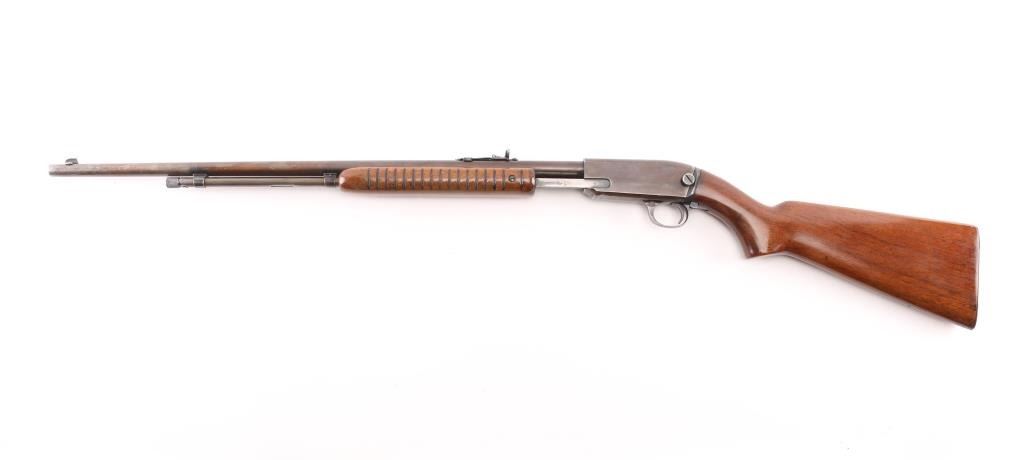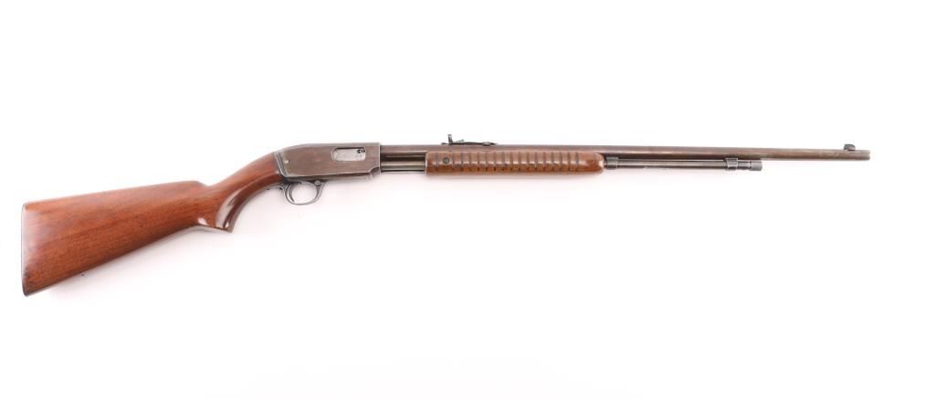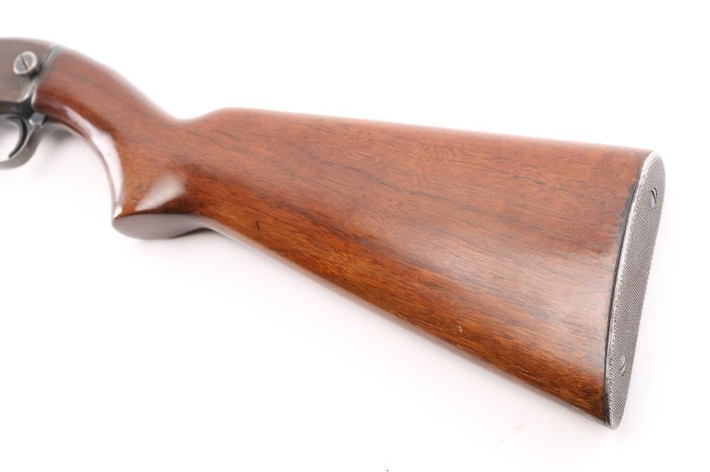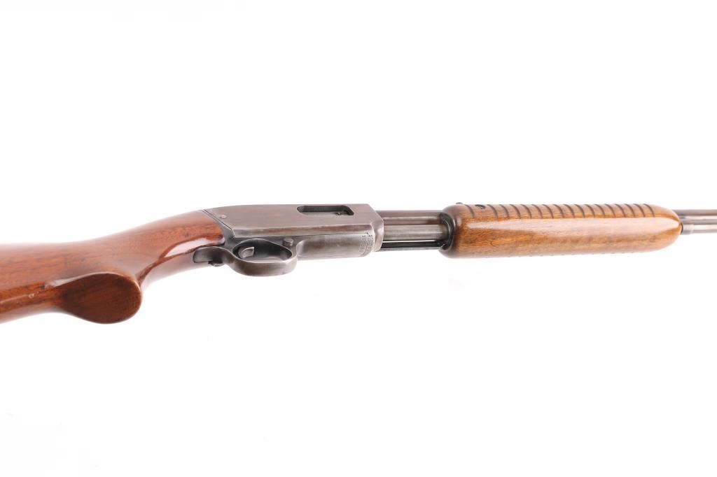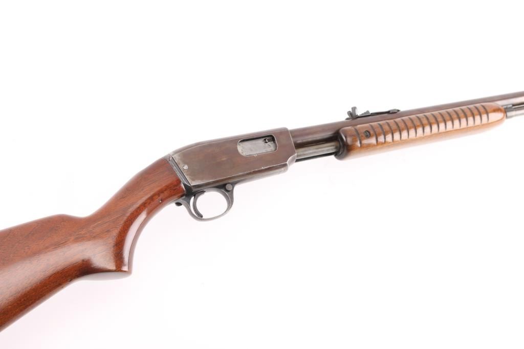 Vintage take-down pump action rimfire rifle manufactured circa 1948. Features blued finish, grooved walnut pump handle, smooth walnut butt with curved grip, checkered steel buttplate, 24" barrel, blade front and sporting rear sights, 2/3 length magazine tube under barrel, push button safety, takedown screw on receiver left. Bore is very good condition. Retains full coverage of faded bluing, now showing mottled smooth brown colors, some streaking on receiver. Wood is good or better, sanded & varnished. Numbers match on receiver & cover. Condition is NRA Very Good (refinished wood) *** C&R Firearm ***