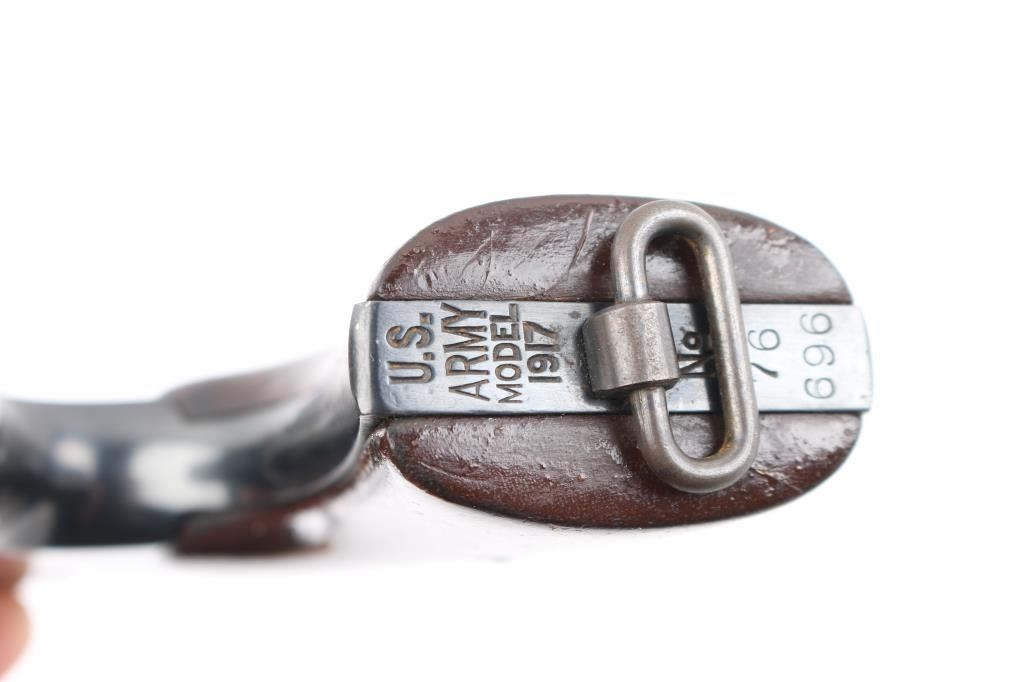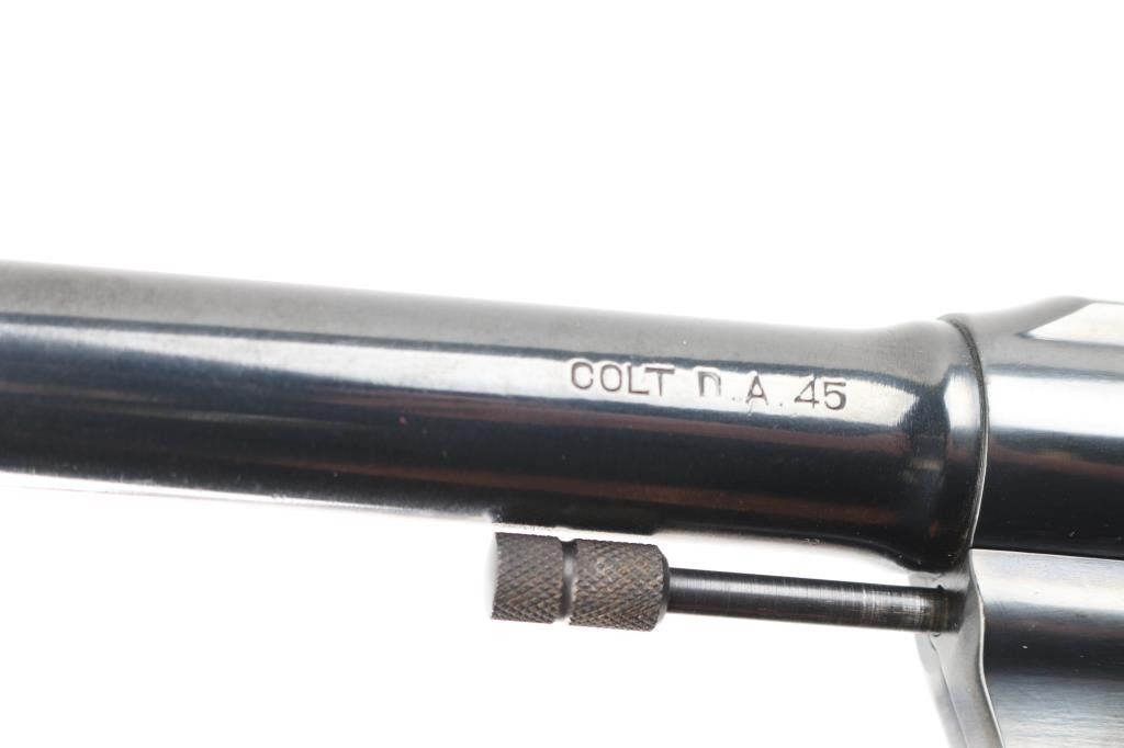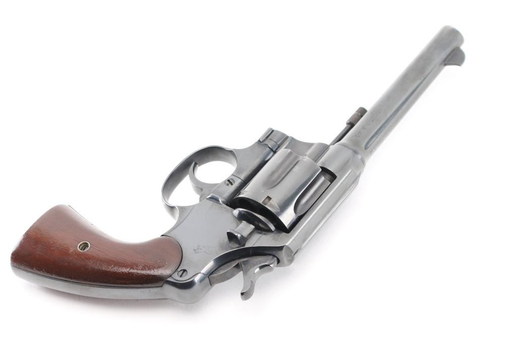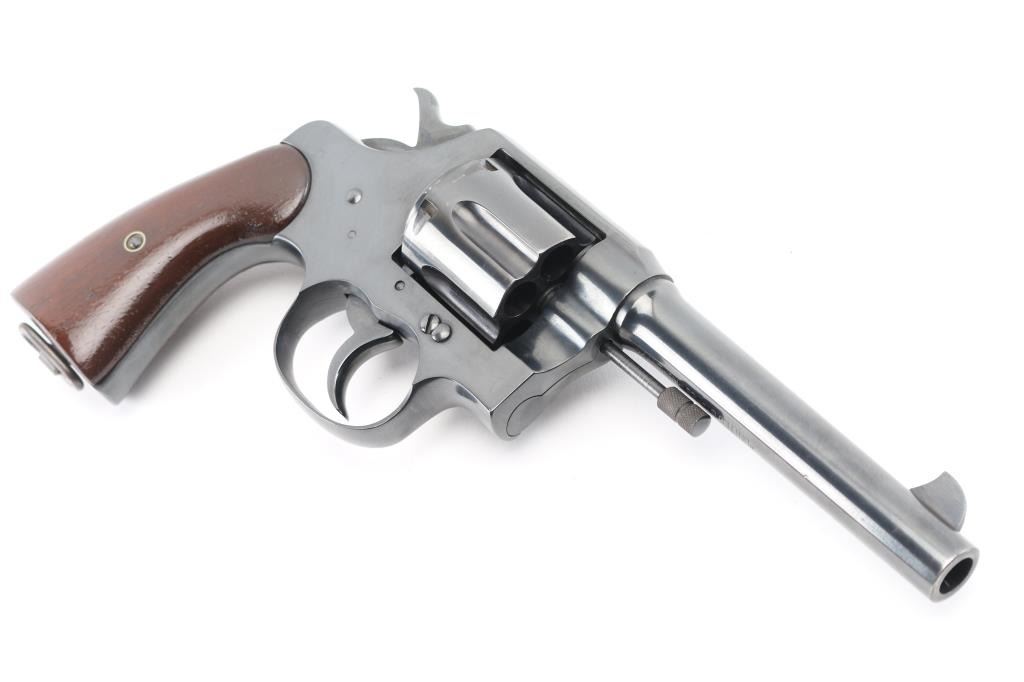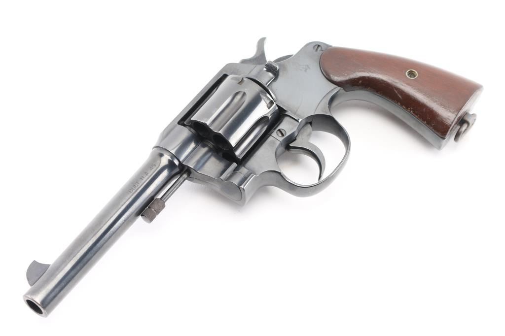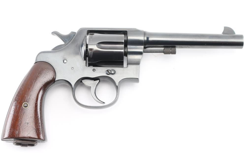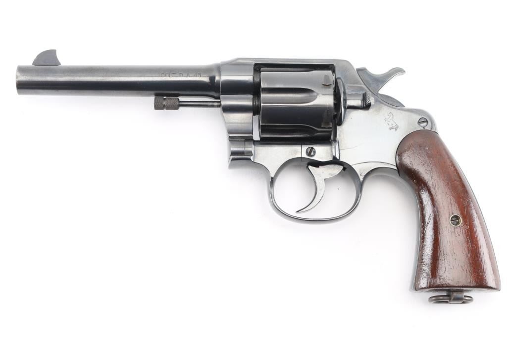 Restored U.S. Military large frame double-action service revolver chambered in .45 Automatic, manufactured in Hartford, CT in 1919. Features a blued finish, 5.5" round tapered barrel, blade front sight,"u" notched rear sight, fluted six-shot swing-out cylinder, non-shrouded ejector rod, smooth trigger, checkered hammer spur, steel frame with lanyard ring on the butt, and smooth wood grips. Markings: Frame -Rampant Colt, eagle head "S19" “U.S./ARMY/MODEL/1917" & "No/76/696". on heel, Barrel - "UNITED STATES PROPERTY", "COLT'S PT FA. MFG. CO. HARTFORD CT U.S.A./PATD AUG 5.1884 JUNE 5 1900 JULY 4 1905", "COLT D.A.45"and "United States Property". Matching serial numbers on frame and crane. Revolver retains approximately 99% of its blued refinish. Action is sound with a tight lock-up, the bore appears excellent/bright , the markings are clear/readable. The grips are very good, have been varnished. NRA Condition-Excellent as Restored. C&R Firearm.