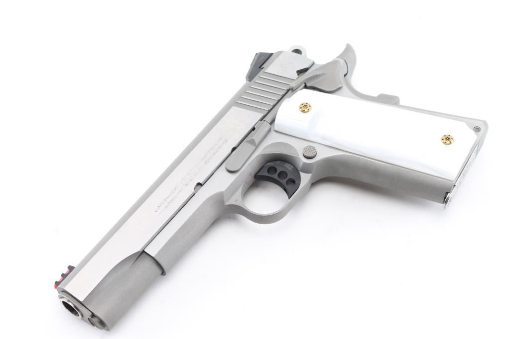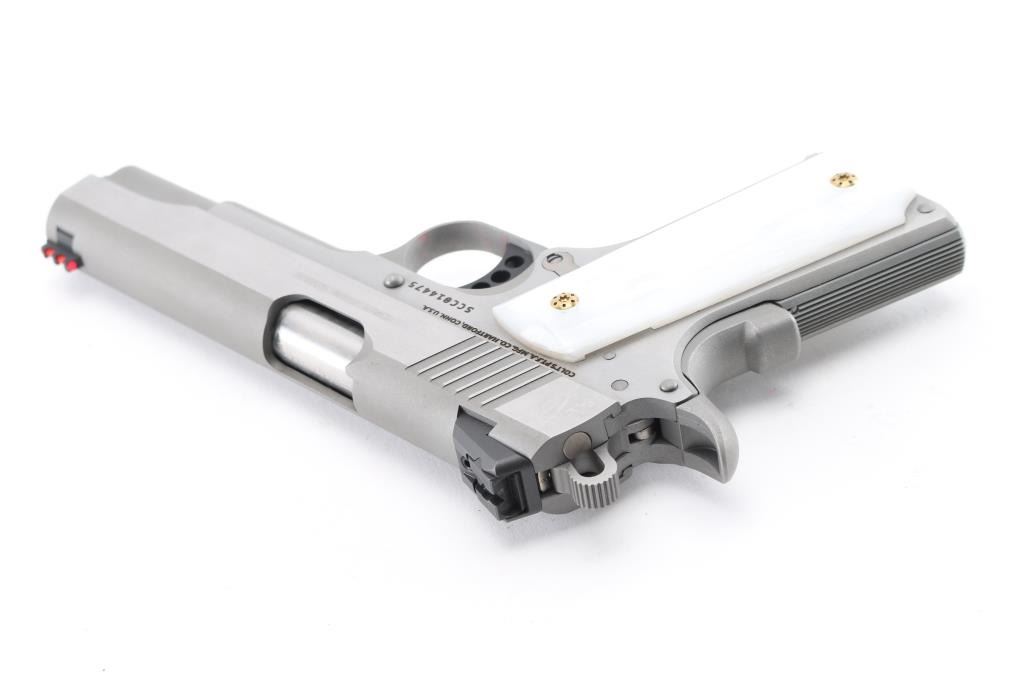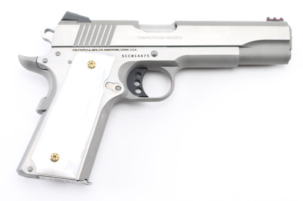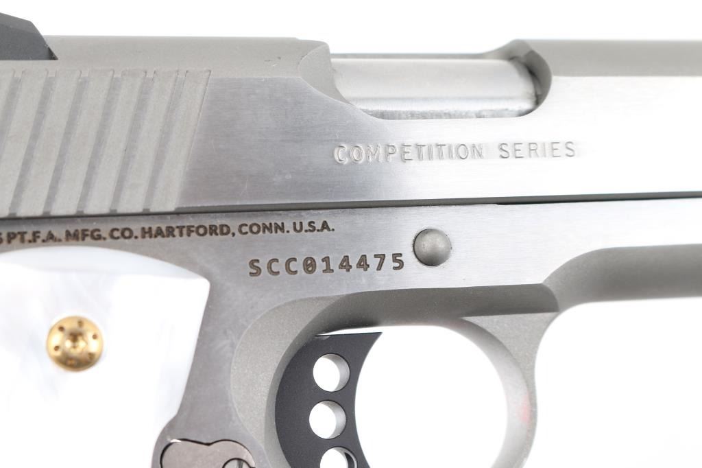 Competition Series 1911A1 pattern Series 70 single action semi-automatic pistol chambered in .45 Auto. Features stainless steel construction with a matte finish & polished flats, 5" N.M. barrel, fiber optic insert front sight, dovetailed rear sight with square notch, serrated skeletonized trigger, serrated spur skeletonized hammer, extended thumb safety, grip safety, push button magazine release, factory 7 round magazine, serrated flat mainspring housing, gold color accent grip screws and two-piece double smooth faux pearl grips. Pistol exhibits little to no visible wear. Action is smooth, the bore is pristine and the grips are excellent. Includes a factory hard case with matching end label, 3 Colt marked stainless magazines, manual, original blue & black laminated wood Colt logo grips. Condition is NRA Excellent *** Modern Firearm ***