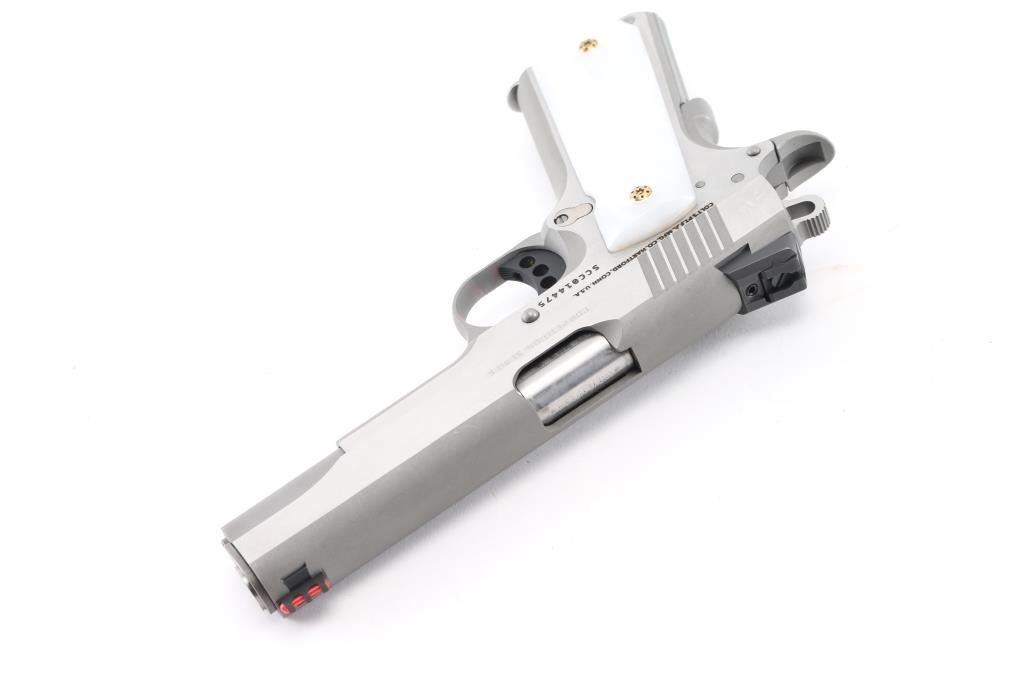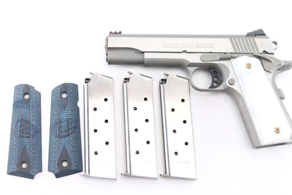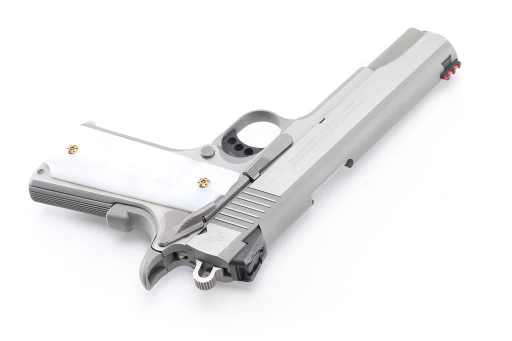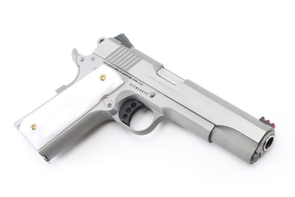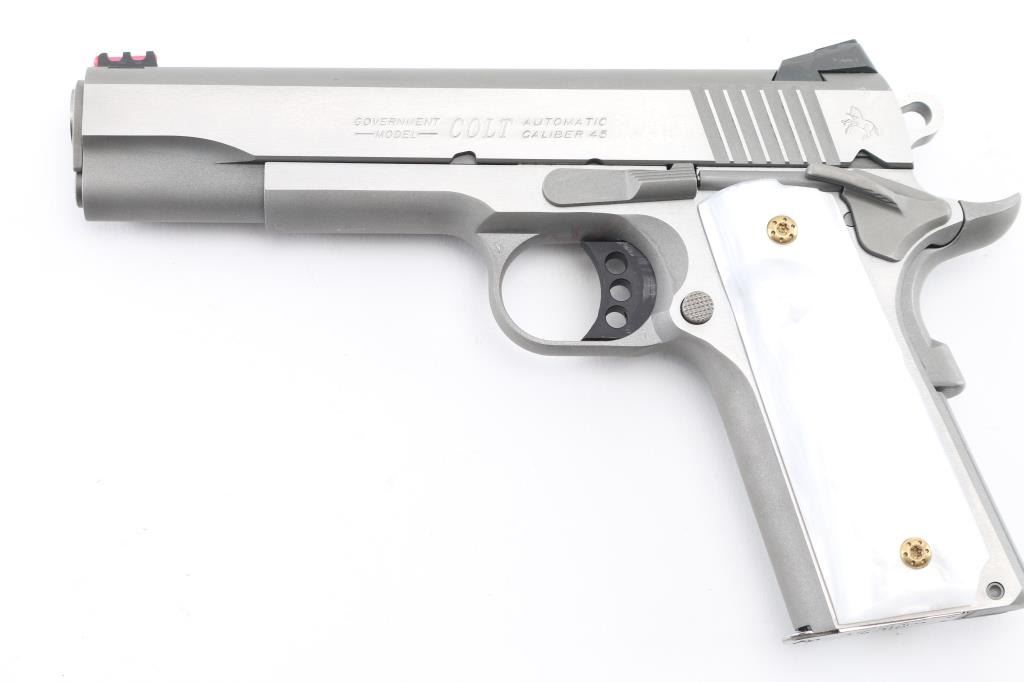 Competition Series 1911A1 pattern Series 70 single action semi-automatic pistol chambered in .45 Auto. Features stainless steel construction with a matte finish & polished flats, 5" N.M. barrel, fiber optic insert front sight, dovetailed rear sight with square notch, serrated skeletonized trigger, serrated spur skeletonized hammer, extended thumb safety, grip safety, push button magazine release, factory 7 round magazine, serrated flat mainspring housing, gold color accent grip screws and two-piece double smooth faux pearl grips. Pistol exhibits little to no visible wear. Action is smooth, the bore is pristine and the grips are excellent. Includes a factory hard case with matching end label, 3 Colt marked stainless magazines, manual, original blue & black laminated wood Colt logo grips. Condition is NRA Excellent *** Modern Firearm ***
