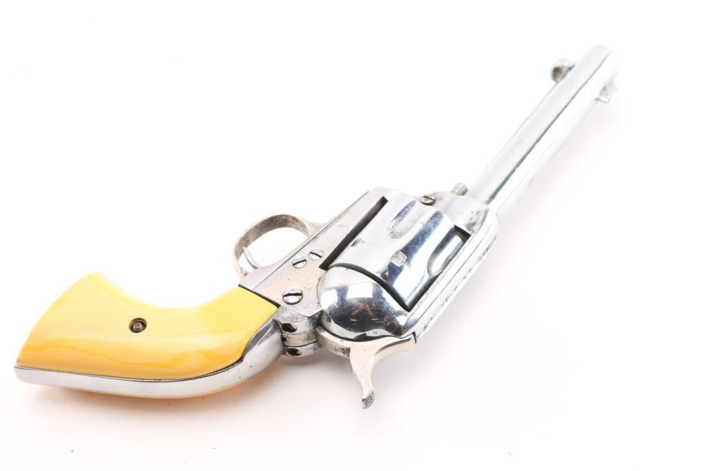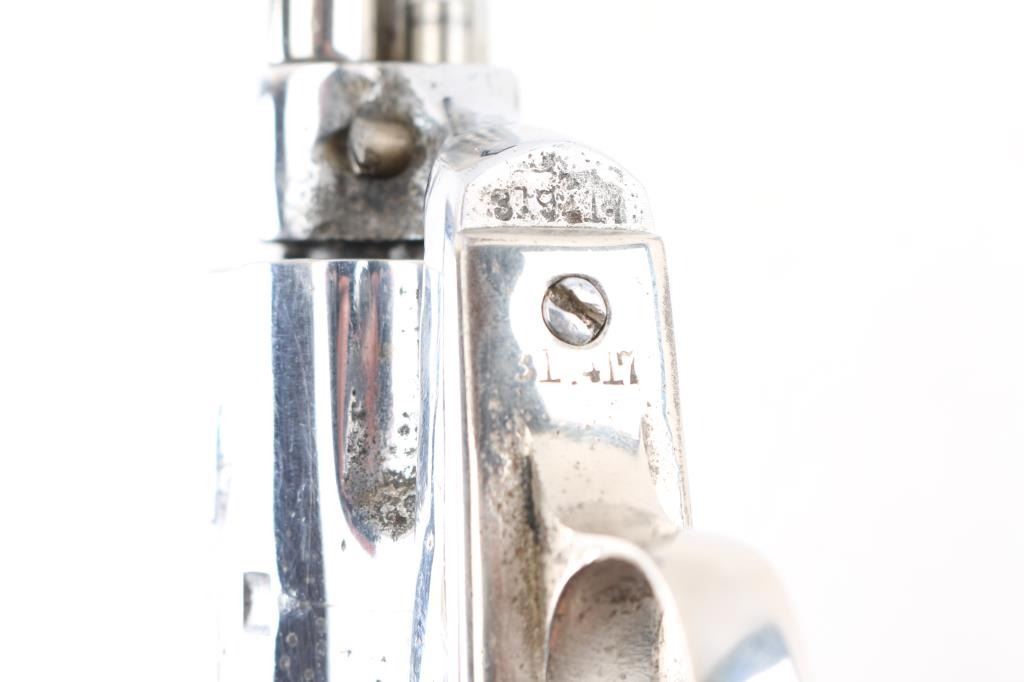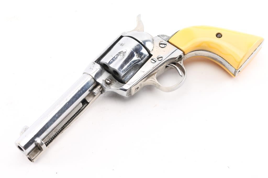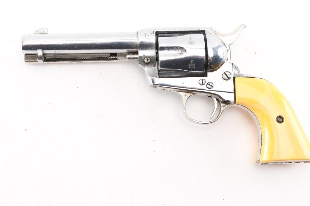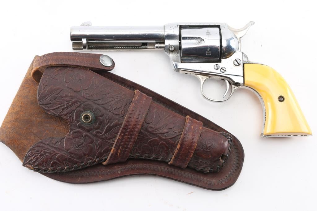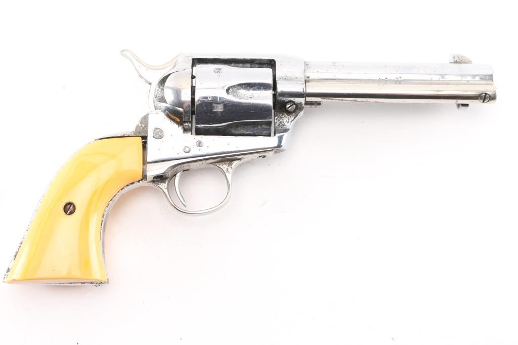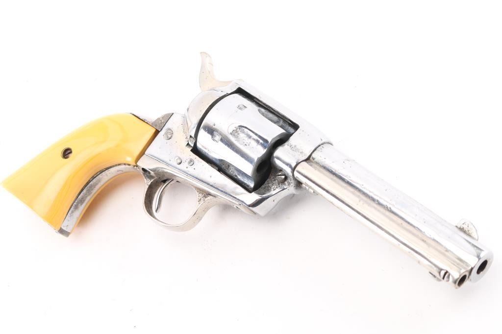 Refinished Colt SAA 1st Generation smokeless chambered in .32 W.C.F. (32-20). Manufactured 1911. Nickel metal refinish, with replaced faux ivory grips. 4 3/4" barrel, with open iron sights. V-notched frame. Most of the Colt markings have been obscured by the refinish and has been heavily buffed showing faint patent dates on left frame. Faint serial numbers match on frame, triggerguard, but the backstrap has been covered. Assembly number is clear on the loading gate. (392). Cylinder chambers appear very good. Bore appears fair with rifling, some light scattered pin-prick pitting. Nickel refinish shows no flaking, there is moderate to heavy pitting showing under it.. Correct ejector with crescent knob, the replaced grips are ill-fitting showing gaps where the top of panels meet the frame. Cylinder pin appears to be a later replacement. Comes in a vintage tooled, double loop brown leather holster. NRA Condition-Fair. C&R Firearm.