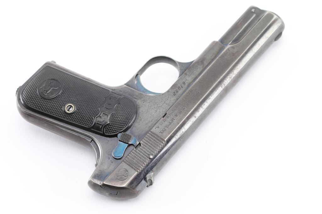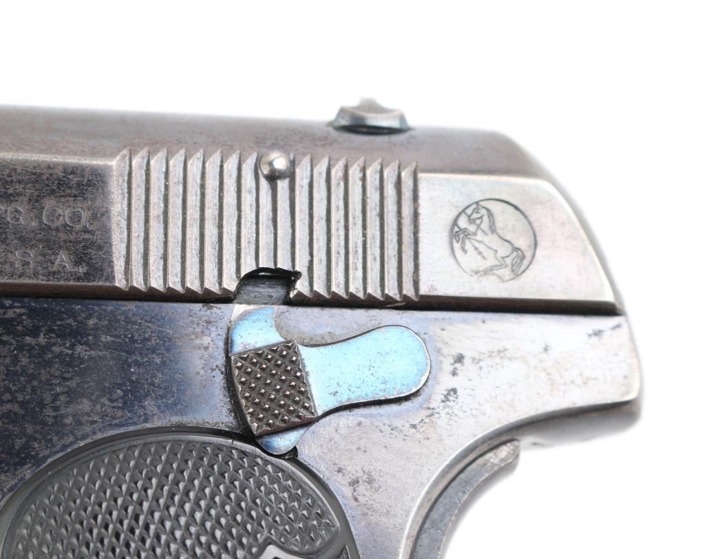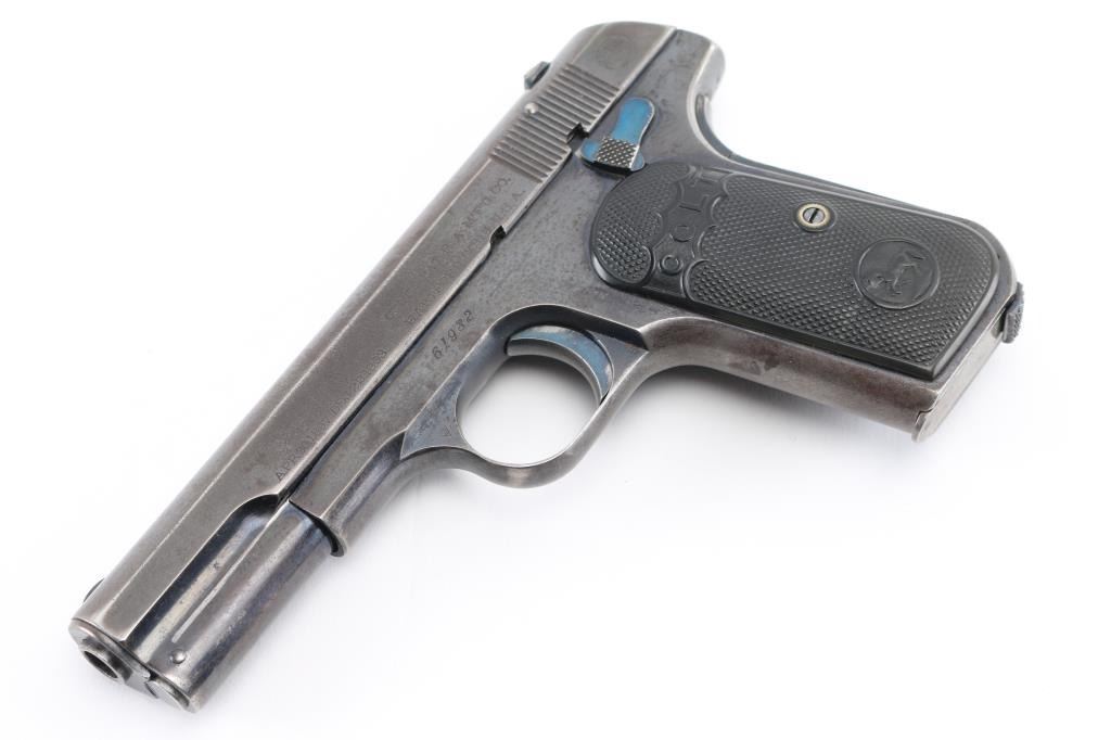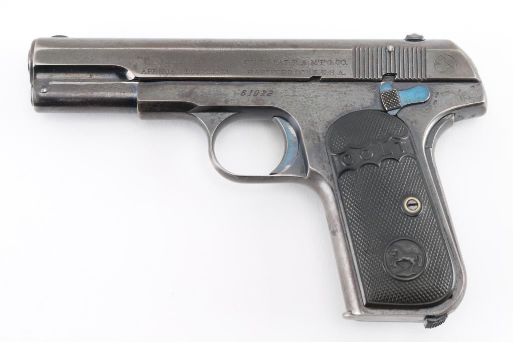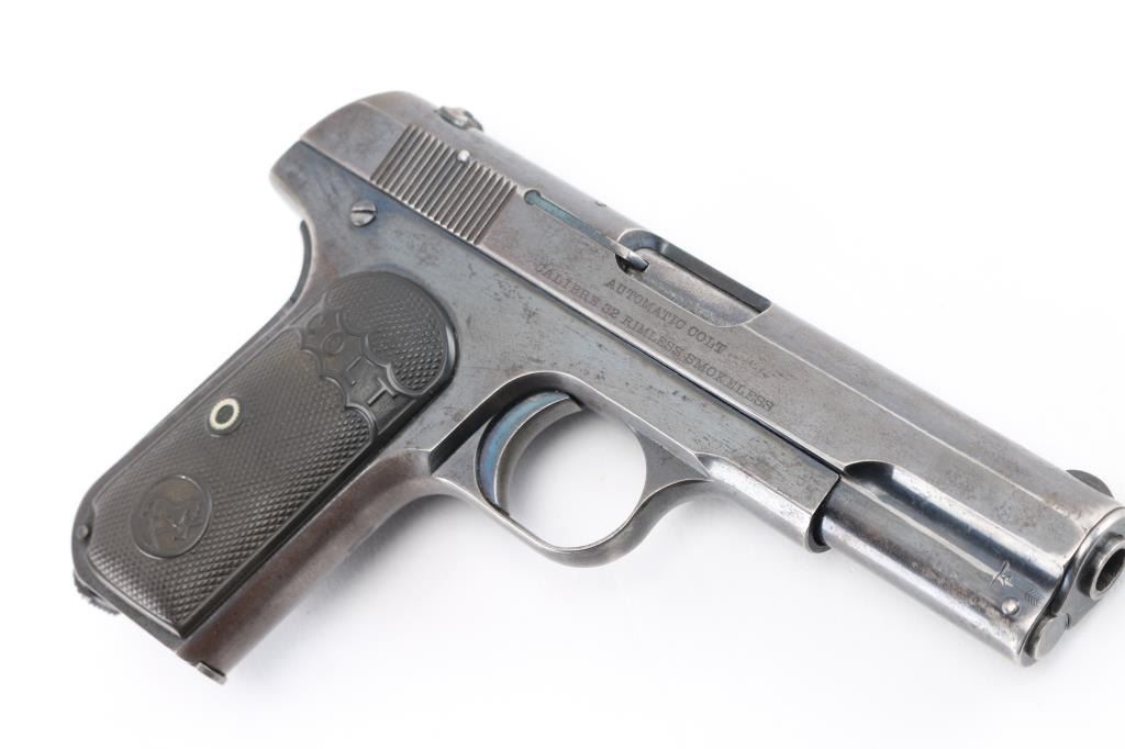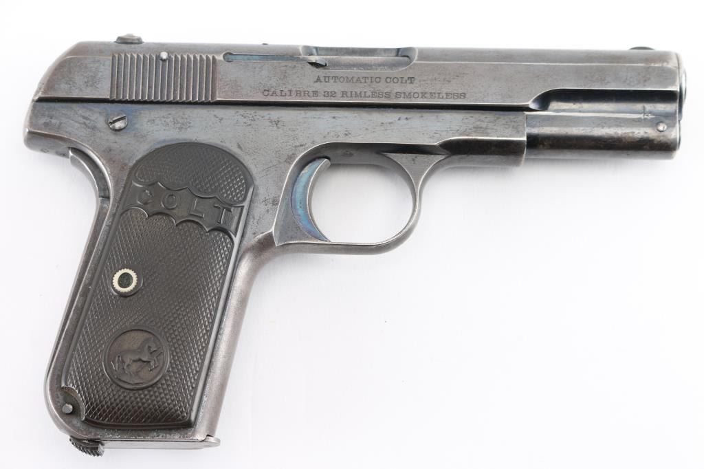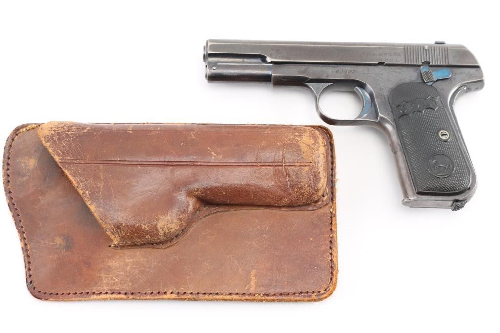 Vintage single action semi-automatic compact pistol chambered in .32 Auto, manufactured circa 1907. Type 1 Early gun with barrel bushing. Features a blued finish, 4" barrel, low-profile round blade front sight, dovetailed rear sight with 'u' notch, two-line address/patent marking on the left side of the slide, smooth trigger, concealed hammer, thumb safety/slide catch on the left side of the frame, grip safety, heel magazine release, 8 round blued magazine, steel frame and two-piece checkered black hard rubber (or Gutta Percha) grips with embossed "COLT" and Rampant Colt logo. Bore is good condition, a bit dark and frosted with solid rifling. Pistol retains approximately 60% finish, faded to gray where handled, with edge losses. Some bright blue color retained on sides of trigger, on safety, very top edge of frame near slide. Both sides of frame at corner of dust cover have been pinched inwards slightly. Sides of slide show thin patina. Grips are very good, show slight smoothing of details from handling. One magazine included, good condition, unmarked. Includes a fair to good condition vintage leather pocket sleeve type holster. Condition is NRA Very Good *** C&R Firearm ***