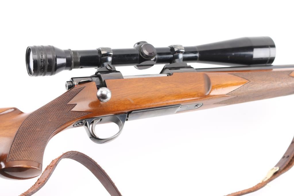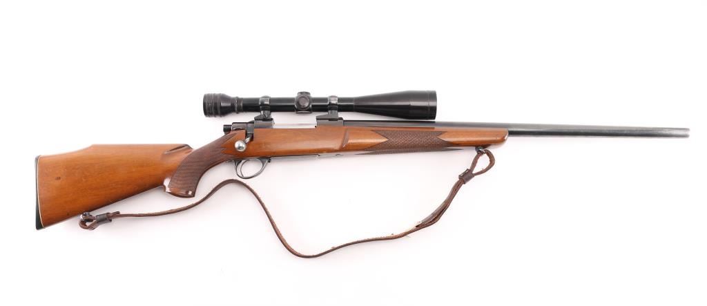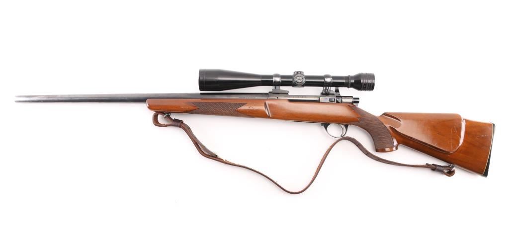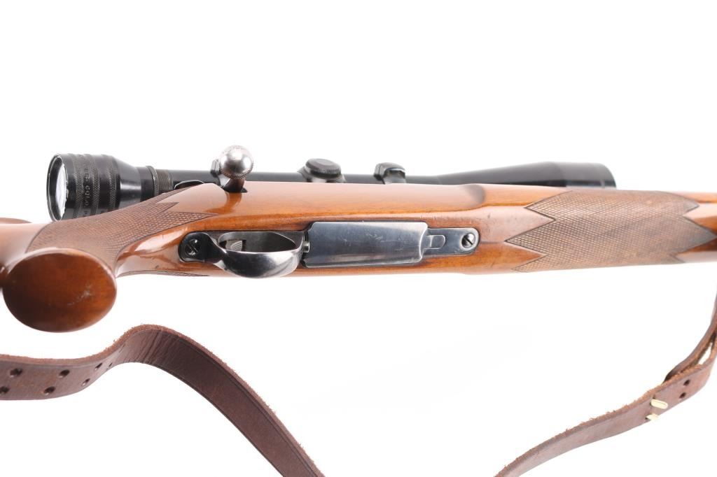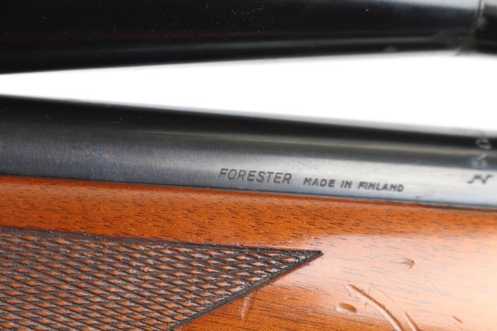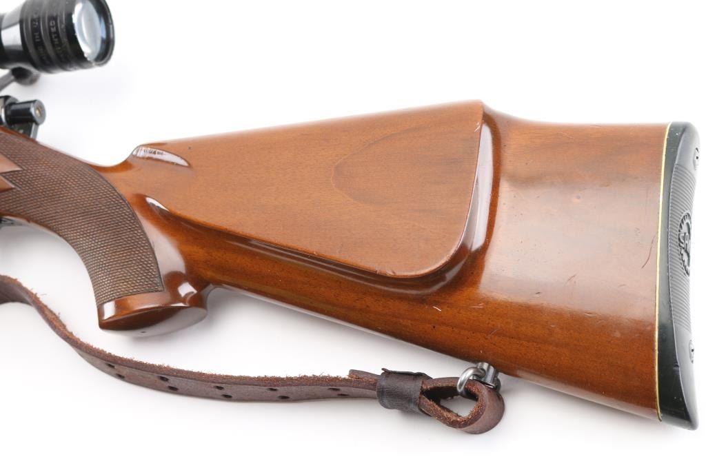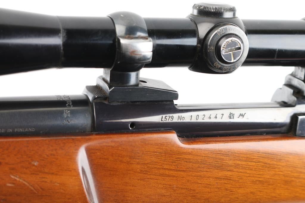 SN: 102447 Finnish bolt action rifle, imported by Garcia, Wash DC, circa 1974-77. Features blued finish, wood Monte Carlo stock with right handed shadow line cheek piece, factory plastic buttplate, checkered panels at forend & curved wrist, 24" medium-heavy barrel with no provisions for sights, hinged floorplate, manual safety, flat top receiver with dovetails. Mounts a good condition Redfield 12x scope with fine crosshair reticle, scope has some minor scratches. Bore is very good bright condition. Retains about 85% finish with handling loss on the barrel, & bolt knob. Stock is very good condition with few small blemishes. Brown leather sling attached. Condition is NRA Excellent. Modern Firearm.